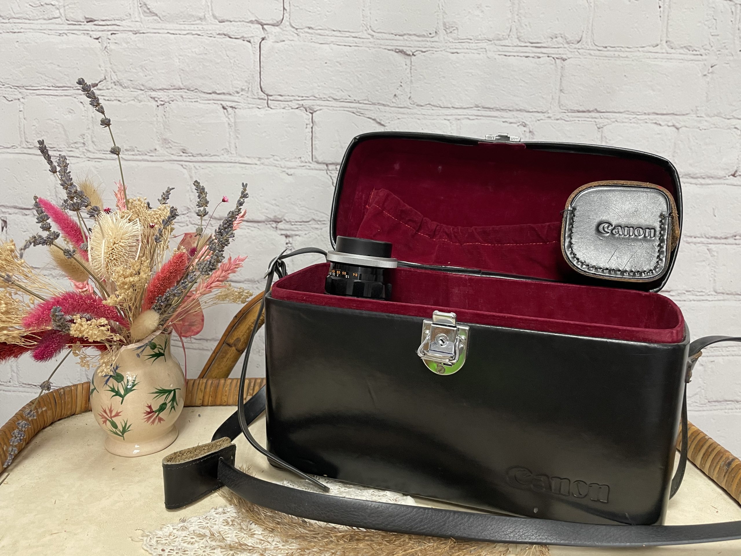 Passionnés de photo et amoureux d’objets vintage, ce lot se compose de 2 objectifs vintage et d’un bague. Initialement prévu pour le boîtier Canon QL FT à objectifs interchangeables, on retrouve un objectif Canon 35 mm avec filtre Skylight 58mm 1x. Le lot se compose également d’un objectif zoom de la marque Komura modèle Zoom 925 avec mise au point manuelle et automatique dans son étui d’origine en cuir. Les objectifs sont fournis dans la caisse d’origine du boîtier photo et sont accompagnés par un étui rigide qui contient une bague pour objectif 60mm et les manuels d’utilisation du boîtier et des objectifs interchangeables. La caisse de transport est en cuir lisse de couleur noire et elle est en très bon état général. Vendu en l’état, ils seront à tester pour voir leur bon fonctionnement.