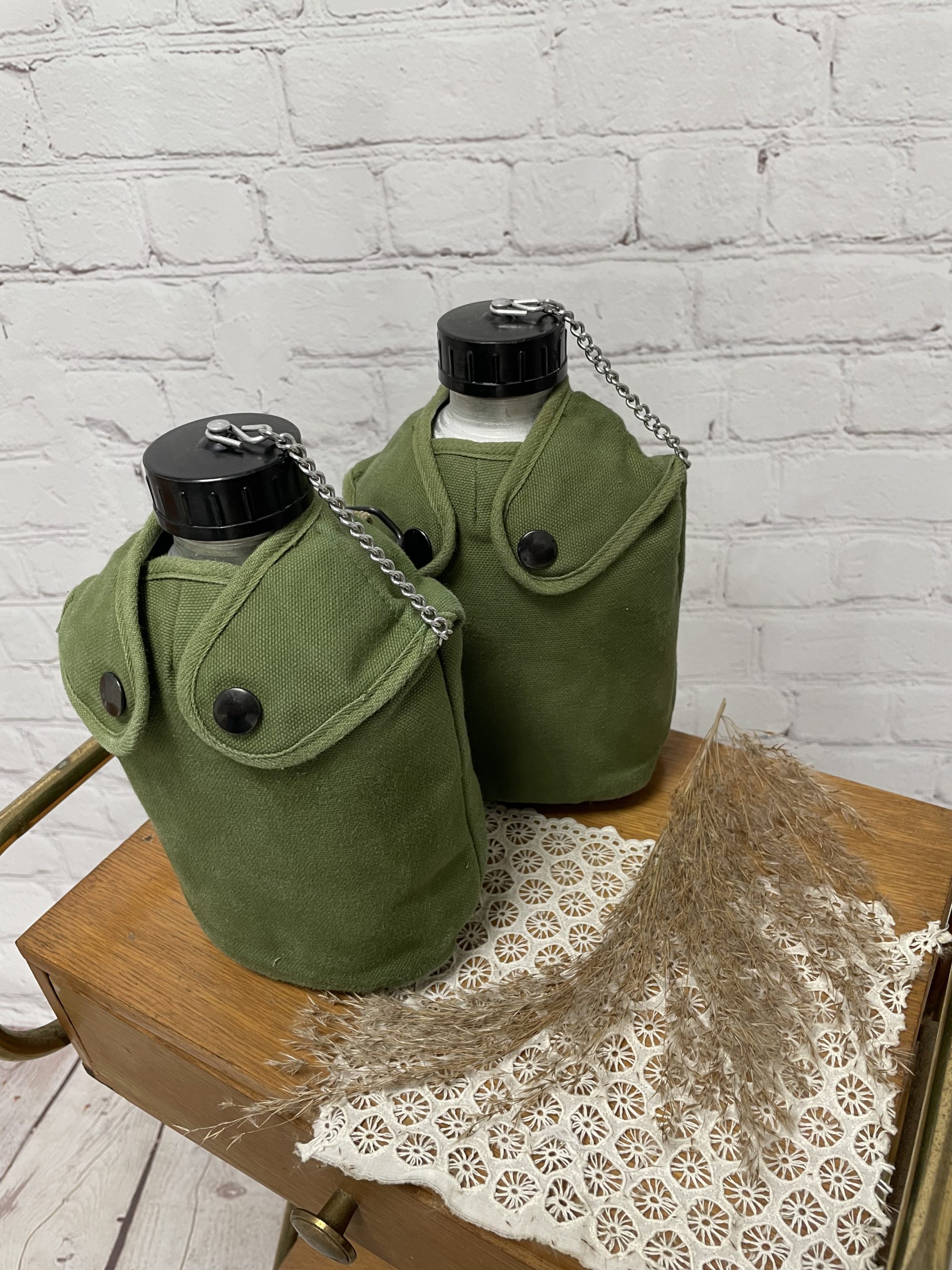 Ces gourdes militaires sont issues du modèle 52 de l’armée française aux formes arrondies et large ouverture pour un remplissage et nettoyage facilités. Les gourdes en aluminium sont fournies avec leurs housses en nylon d’origine couleur vert kaki et qui se ferment à l’aide de 2 boutons pression. A l’intérieur de l’une des gourdes et cousue l’étiquette avec le nom de famille « MAGUEREZ ». Les gourdes sont équipées d’un passant ceinture et crochet métallique pour ceinturon. D’une cotenance d’1,3L, elles sont idéales pour le camping, le bivouac ou la randonnée !