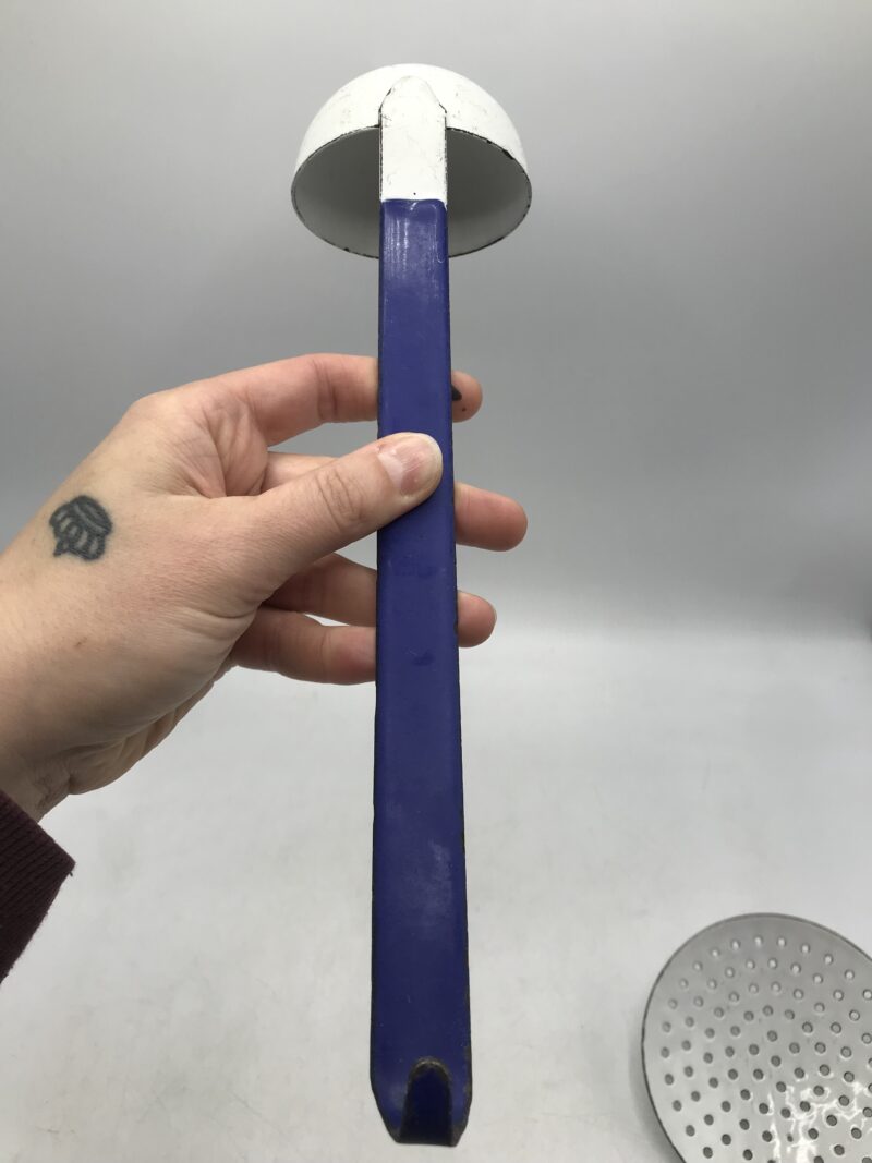 Duo louche et écumoire vintage en métal émaillé bleu et blanc. Superbe duo vintage qui se compose d’une louche et d’une cuillère de service à trous ou écumoire. En métal émaillé de couleur bleu et blanc, les cuillères ont un long manche qui se termine en crochet, pratique pour pouvoir les suspendre une fois la vaisselle faite. Vintage, des traces d’usure sont à prévoir (cf photos). Des accessoires de décoration vintage par excellence. Ils ne passeront pas inaperçus dans votre cuisine. Avis aux fans de vintage.