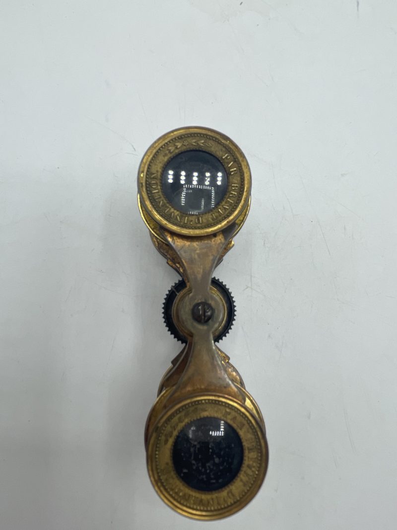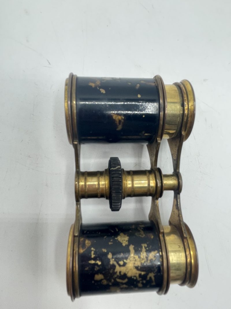 On craque d’amour pour ce sublime duo de paires de jumelles vintage ! Prévues pour regarder une pièce de théâtre ou un opéra, les jumelles se règlent pour pouvoir zoomer et se ranger dans un sac dans un format pratique grâce à leurs molettes centrales. Les jumelles sont en laiton d’or et en bakélite de couleur crème pour la grande paire et en laiton doré et verni en noir pour la plus petite paire. Sur les yeux de la petite paire noire, on peut lire l’inscription gravée « Par brevet d’invention ». Vintage, les jumelles présentent des traces d’usure et il y a des petits morceaux manquants notamment au niveau d’une des lentilles de la paire beige (cf photos) jolies marques du temps passé. Deux jolies paires vintage à collectionner !