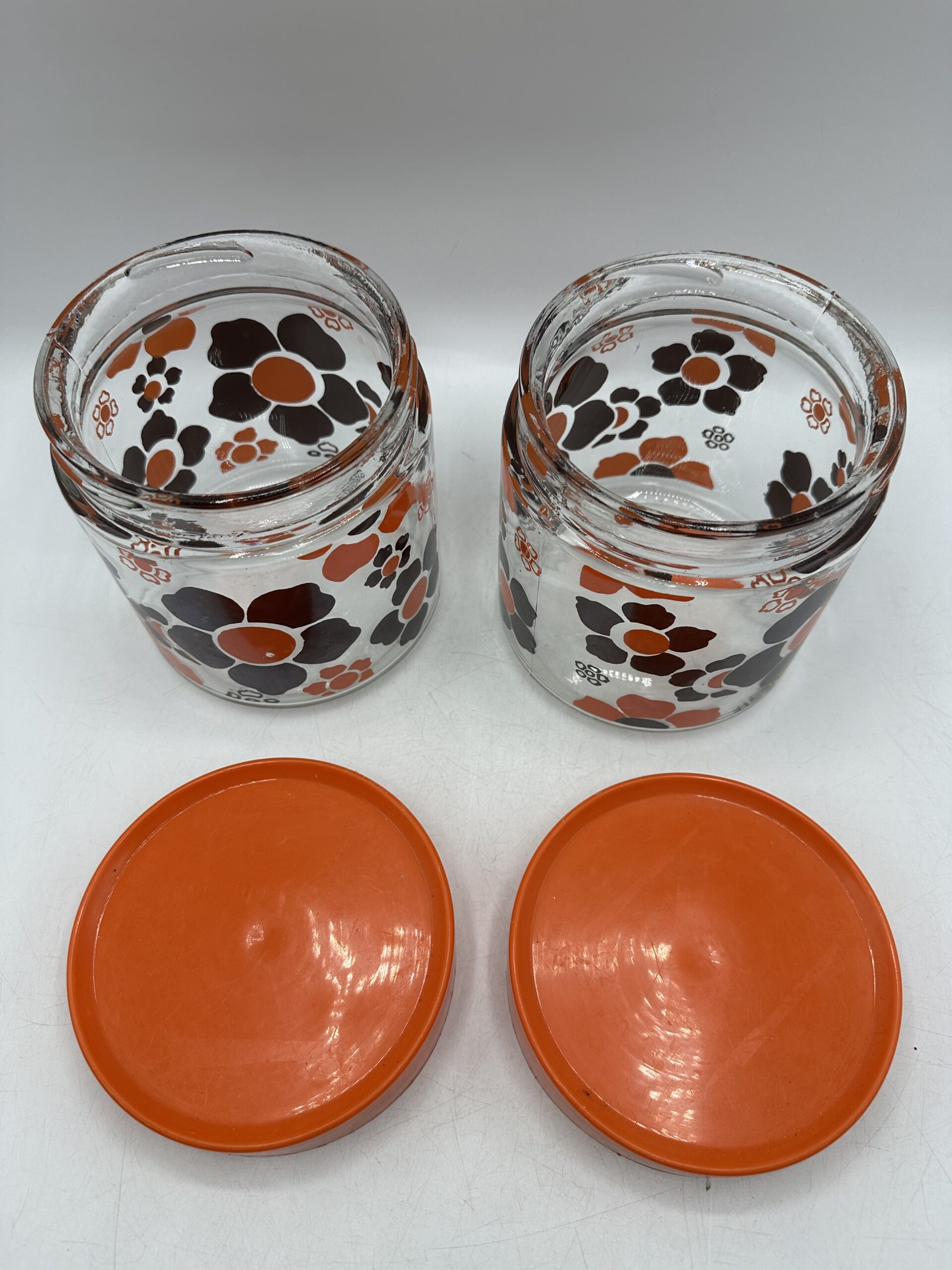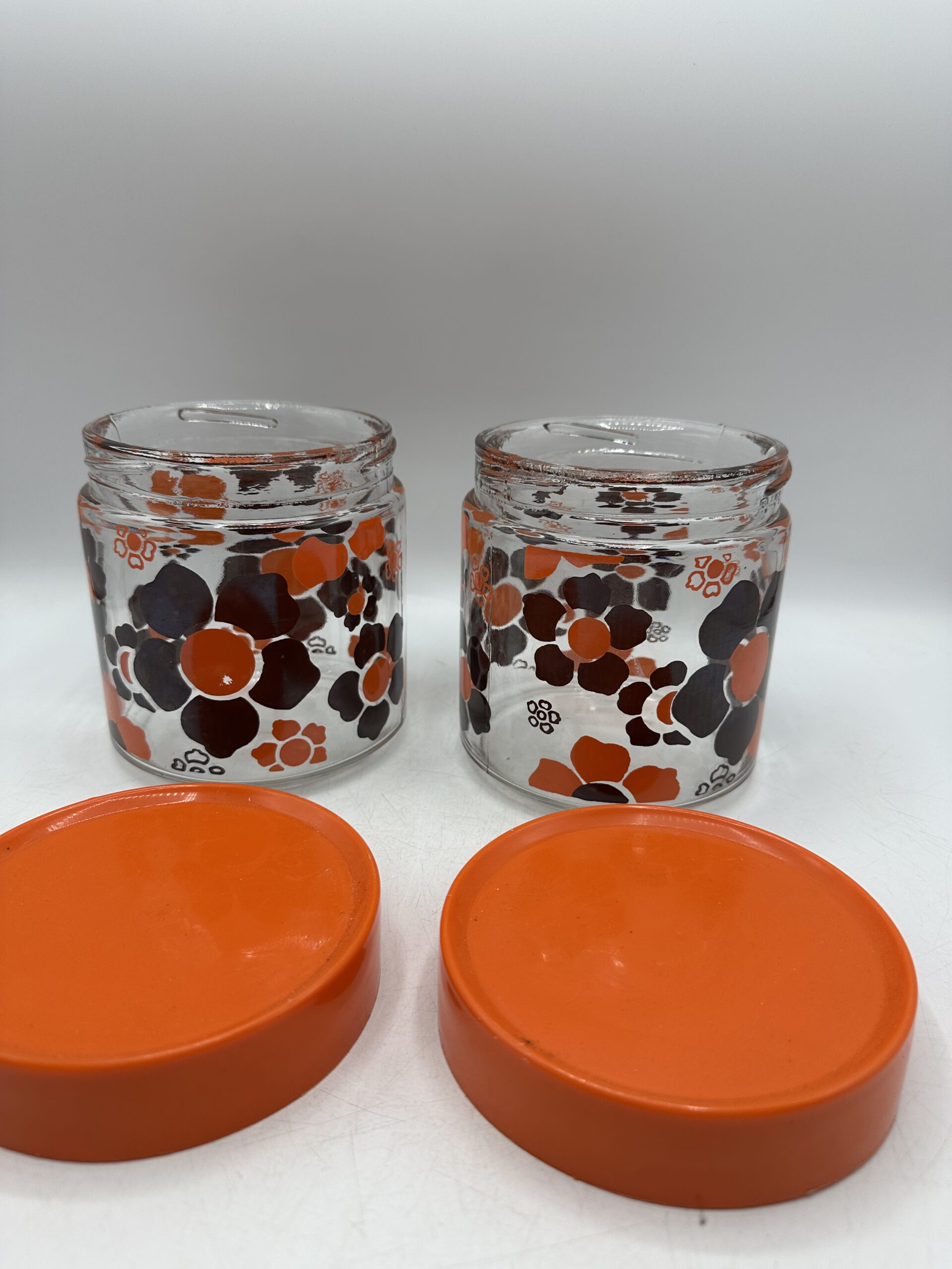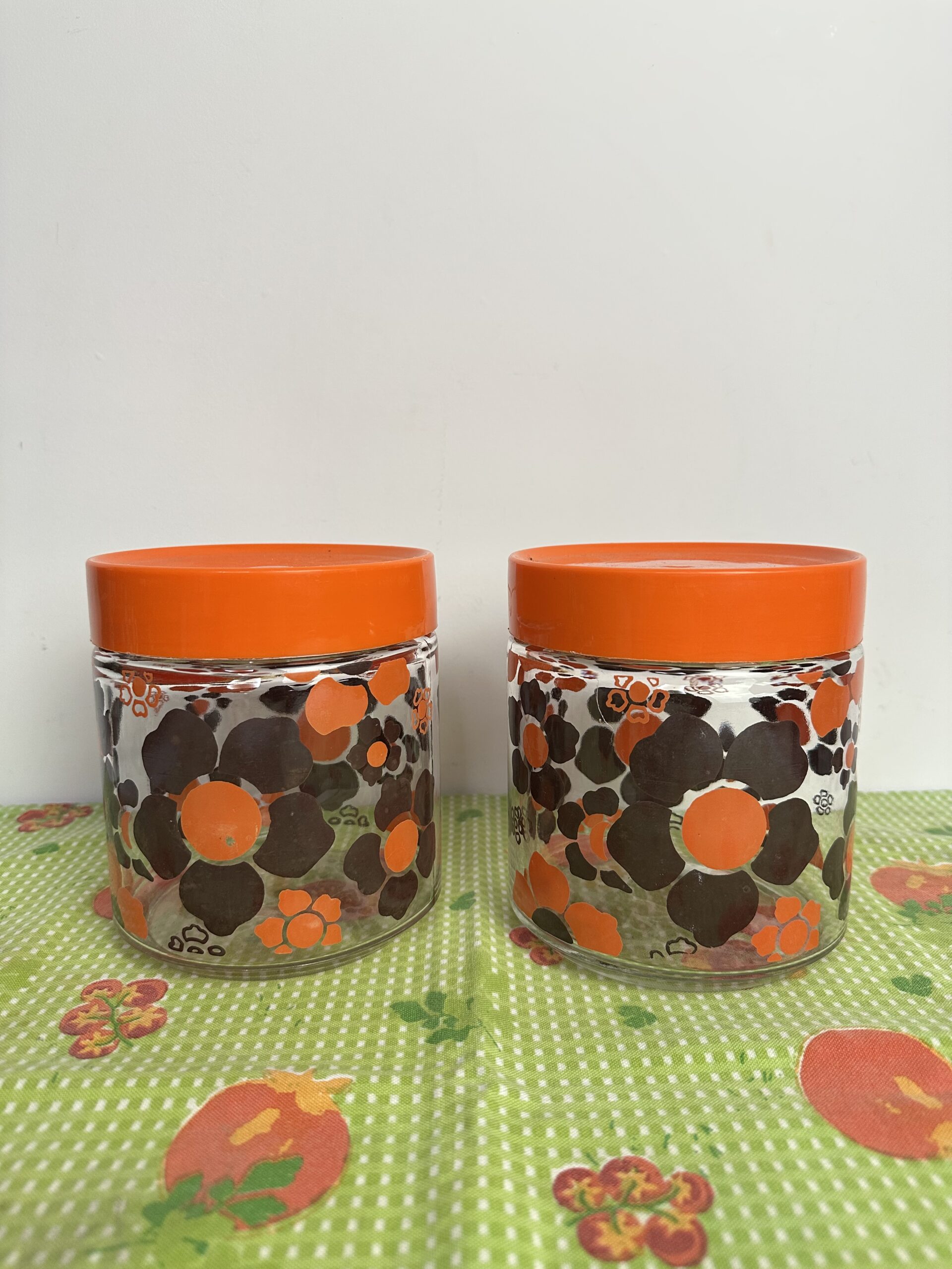 Les bocaux ont un décor floral typique des années 60-70, avec de grandes fleurs orange et marron qui contrastent joliment avec la transparence du verre. Les couvercles en plastique orange complètent parfaitement l’ensemble et renforcent ce look résolument vintage.