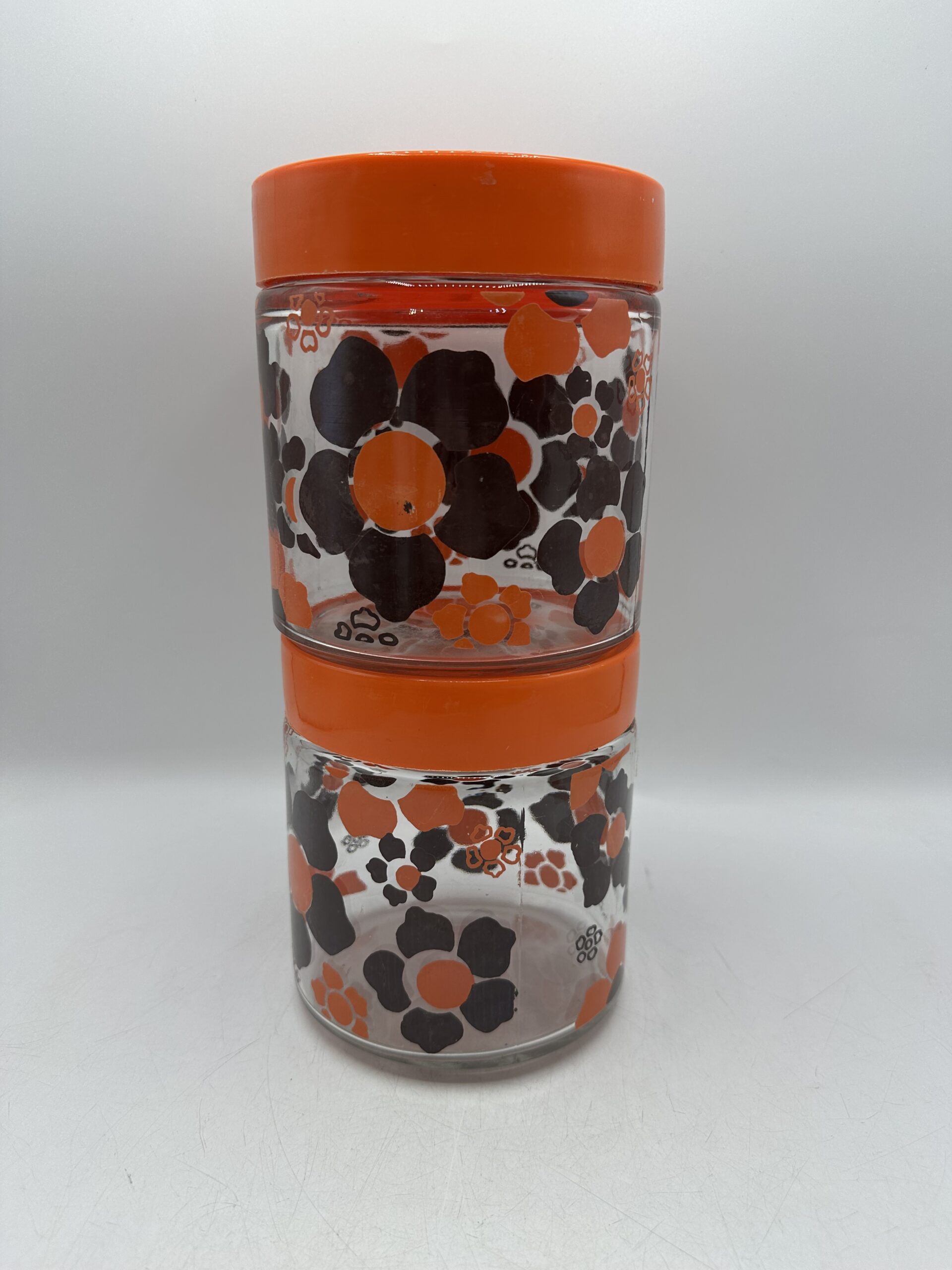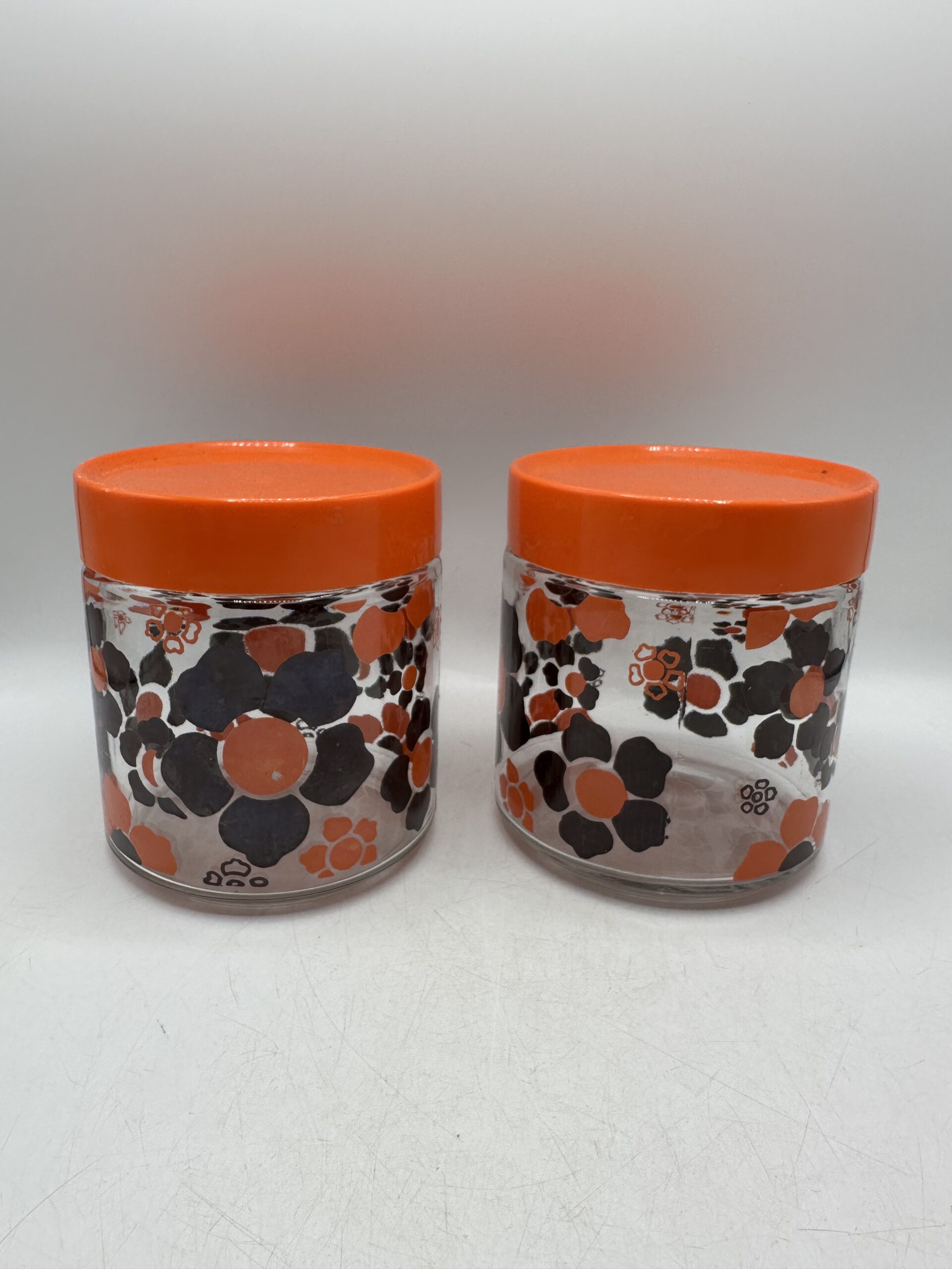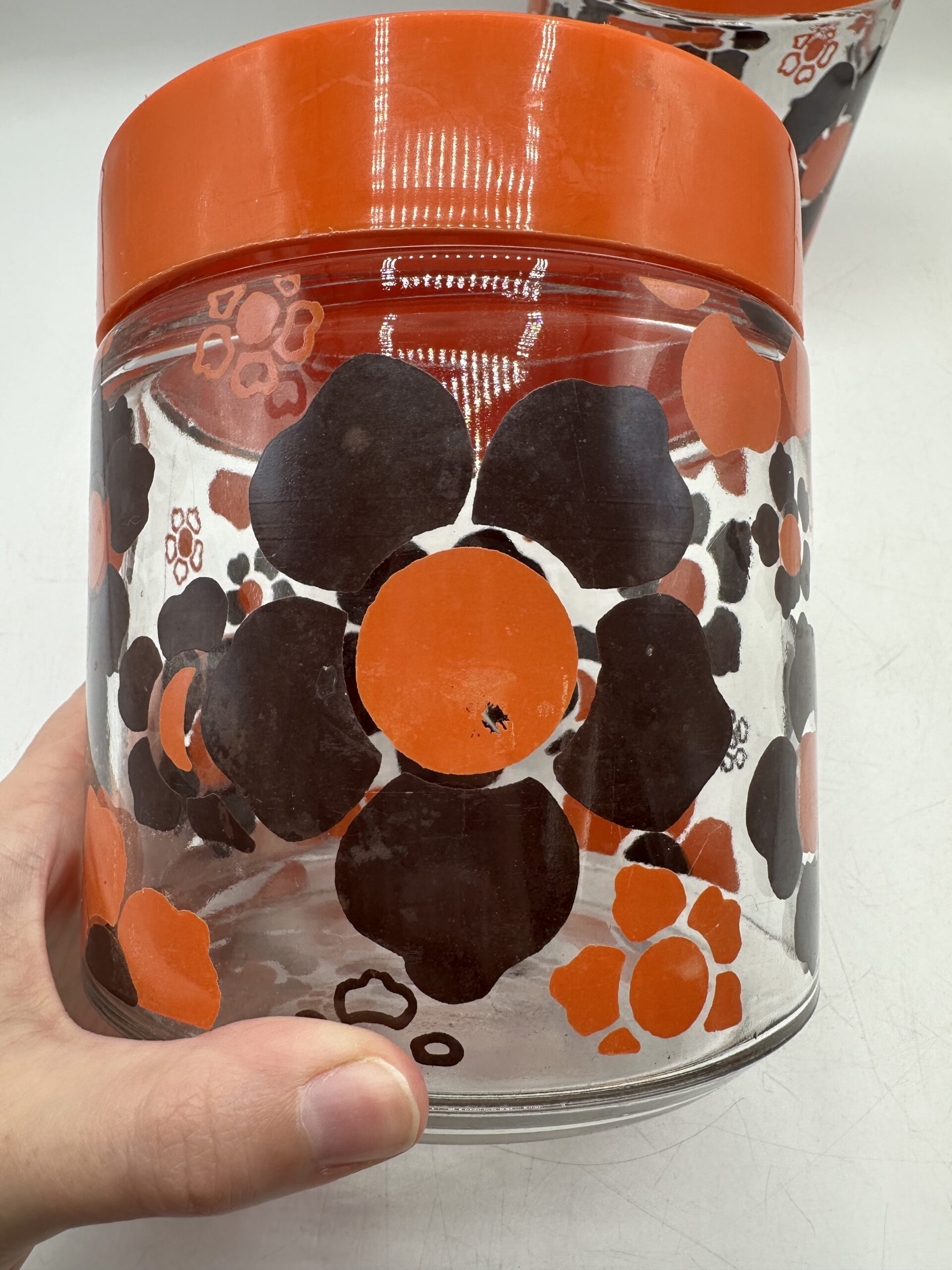 Les bocaux ont un décor floral typique des années 60-70, avec de grandes fleurs orange et marron qui contrastent joliment avec la transparence du verre. Les couvercles en plastique orange complètent parfaitement l’ensemble et renforcent ce look résolument vintage.