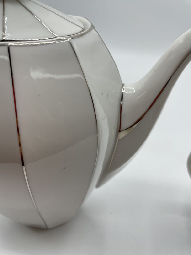 Très joli duo d’un service à café vintage composé d’1 théière et d’1 pot à lait. En porcelaine blanche, le service a un joli style art déco avec ses facettes et ses liserés argentés. Le service est estampillé et il a été fabriqué en Tchécoslovaquie, pays qui a disparu de la carte en 92. Quelques petites traces de peintures sont à prévoir (cf photos) sans grande conséquence sur l’aspect esthétique du service. Parfait pour servir le thé ou le café avec style !