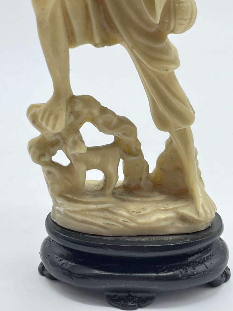 Ce joli duo de statuettes asiatiques se compose d’une statuette représentant un pêcheur et une statuette représentant une femme tenant un éventail et un porte encens. Les statuettes sont posées sur un petit socle de couleur noire. Vintage, quelques traces d’usure sont à prévoir (cf photos) jolies marques du temps passé et la canne du pêcheur est cassée mais elle peut être facilement changée. Ce joli duo apportera une touche d’exotisme à votre intérieur !