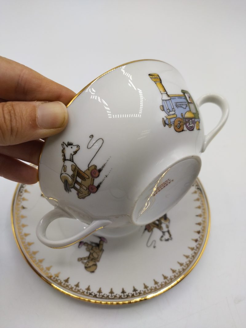 On craque d’amour pour la finesse de ce joli duo qui se compose d’une tasse à thé et de sa soucoupe assortie. En porcelaine de Limoges, la tasse et la soucoupe sont estampillées Lazeyras. De couleur blanche, la tasse et la soucoupes sont décorée d’une frise dorée et de motifs d’enfants et de jouets d’enfants vintage ; soldat, train en bois, petit cheval et pantin. Une belle tasse très élégante pour un joli moment thé.