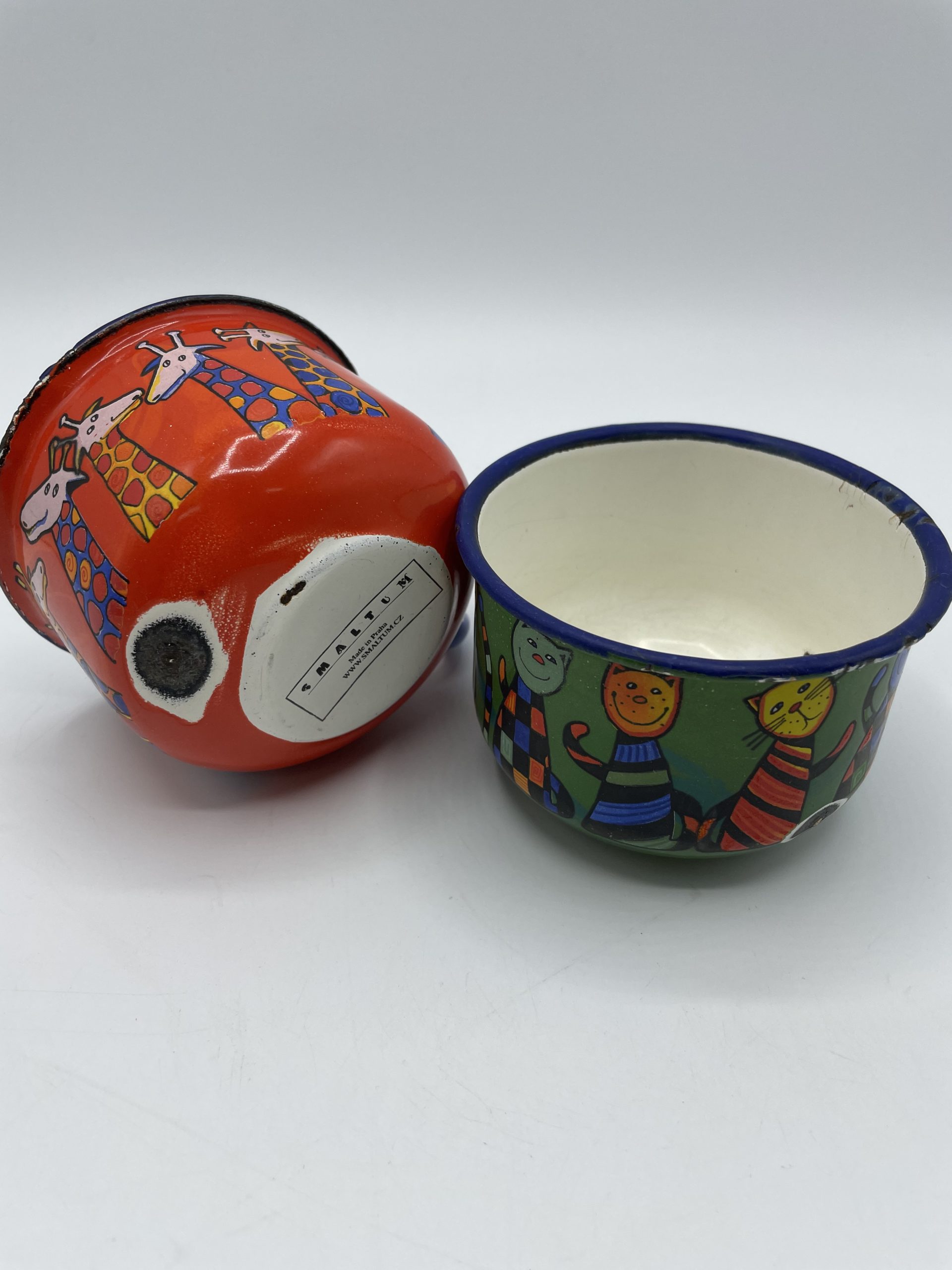 Ce duo de tasses en métal émaillées est estampillé Smaltum, marque basée à Prague et spécialisée dans la confection de tasses en métal et émail. Ces drôles de tasses sont reconnaissables par leurs couleurs primaires et leur design enfantin. Ici, l’une des tasses est verte et décorée avec des dessins de chats, et l’autre est rouge et décorée avec des motifs de girafes. Les deux tasses ont un liseré bleu. Présentant de nombreux coups et traces d’usure (cf photos) ces tasses restent néanmoins incassables et elles sont donc idéales pour les enfants ou les vacances en camping !