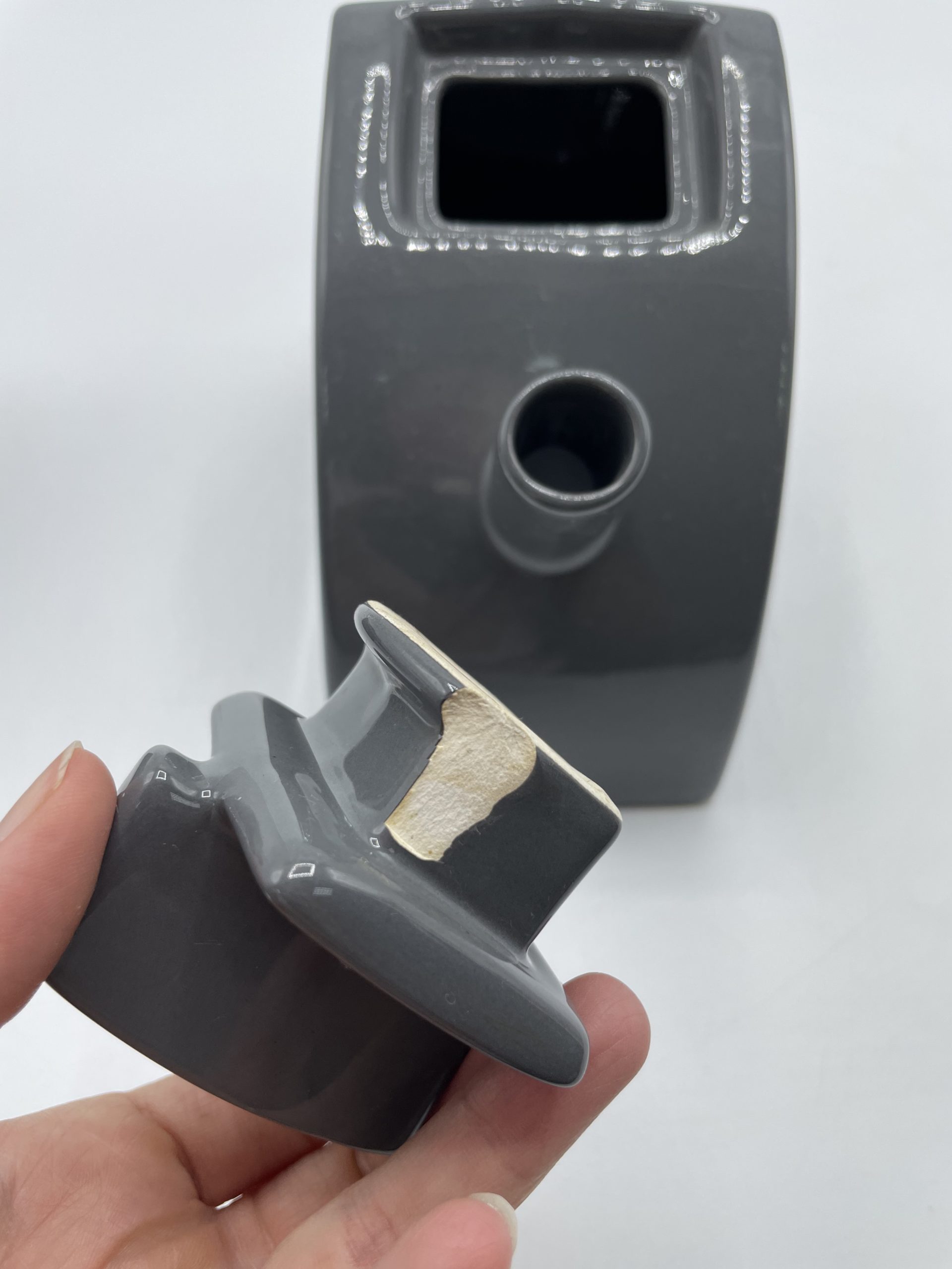 ALERTE PEPITE : pour ce sublime duo qui se compose d’une théière et d’un sucrier. En céramique de couleur grise, le duo est estampillé Salins France et fait partie de la collection Memphis. Avec leur design ultra moderniste et cubique, la théière et le sucrier sont à la fois hype, originaux et intemporels. Vintage des années 80, ce duo de théière et de sucrier ets en bon état général, à noter un éclat sur l’intérieur du bouchon(cf photos). Avec leur design unique, vous ferez sensation au moment de servir le thé !