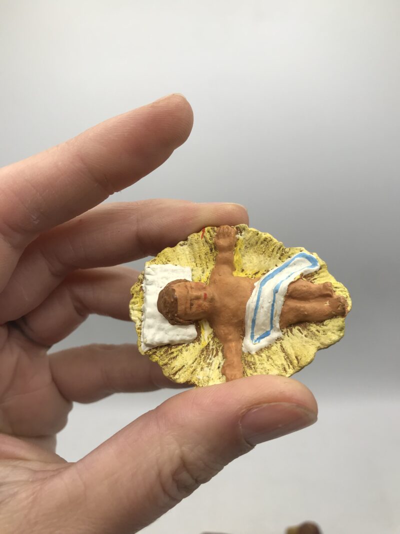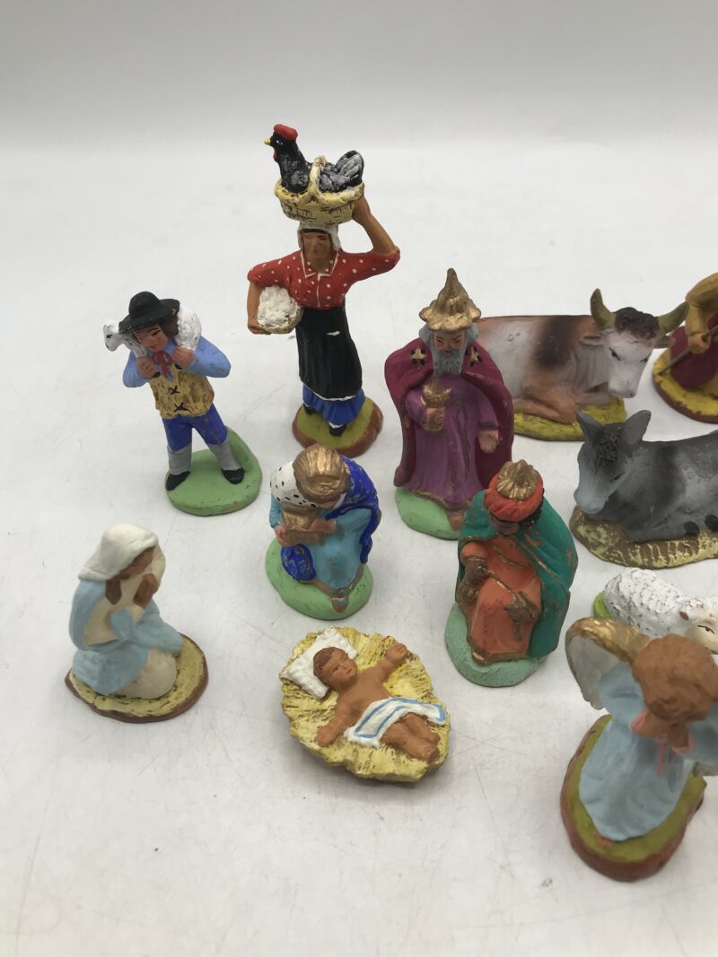 Ensemble 14 santons Fouque Maurel. Fans de santons de Provence voici un bel ensemble composé de 14 pièces. Les santons sont dans un bon état général mais portent des marques d’usure (cf photos). Ils ont du en faire des noëls et voir la joie illuminer les visages des enfants et de grands. Dans ce lot nous avons les rois mages, des petits moutons, le petit jésus, un ange, un âne, une vache… De quoi faire une jolie crèche traditionnelle. Un petit bout de tradition pour des fêtes de fin d’année réussies. On a tous besoin d’un peu de magie, petits et grands venez vous réunir autour de cette petite crèche de seconde main. Une belle idée cadeau.