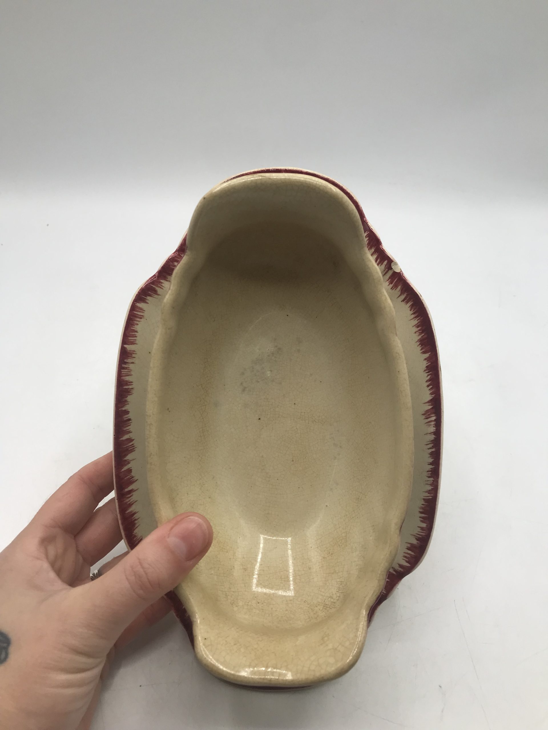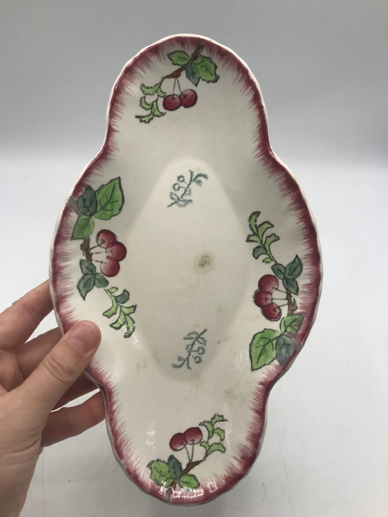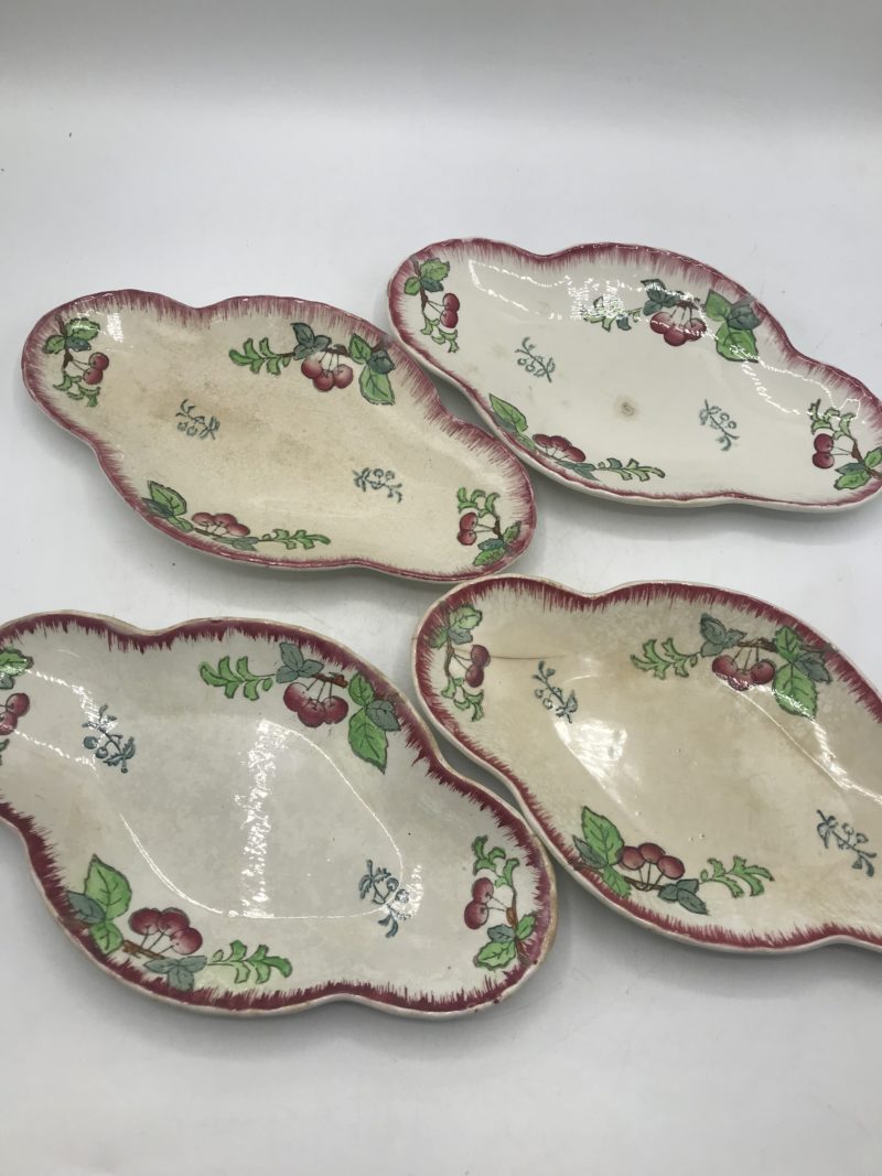Alerte pépite !!!! Cette collection de chez Longwy ne cour pas les rues. La collection Montmorency est vieille est difficile a trouver. Voici donc un petit ensemble composé de 4 raviers et une saucière. Les raviers sont en bon état, à noter que l’un d’entre eux est fendu et certains portent des traces du temps (cf photos). Ils mesurent 26,5 x 15,5 cm. La saucière elle porte une jolie patine du temp et un petit éclat, elle mesure 25 x 18 cm pour 10 cm de hauteur. Les décors de cette collection sont des petites cerises que nous retrouvons un peu partout, ainsi qu’un coup de pinceau rouge sur toutes les bordures. Jolies pièces pour une collection de vaisselle ancienne.
