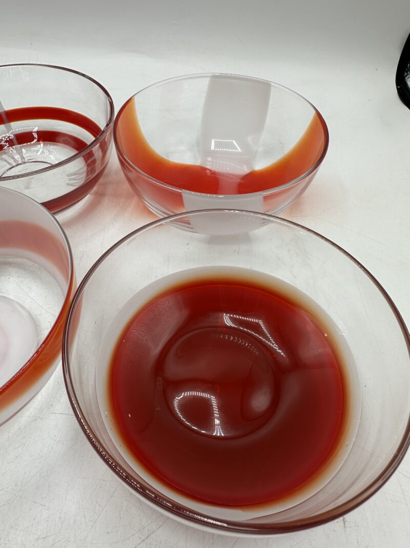 Les 6 bols ont des motifs différents rouge, blanc et parfois orangé. Magnifique ensemble très recherché, qui ravira les collectionneurs et les passionnés de vaisselle vintage Murano.