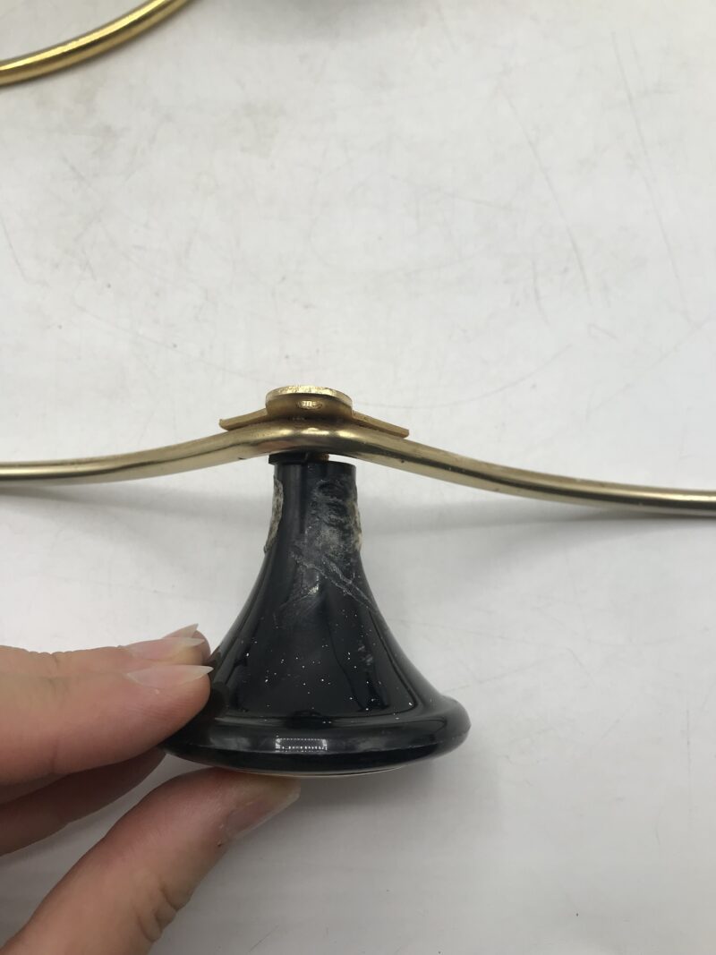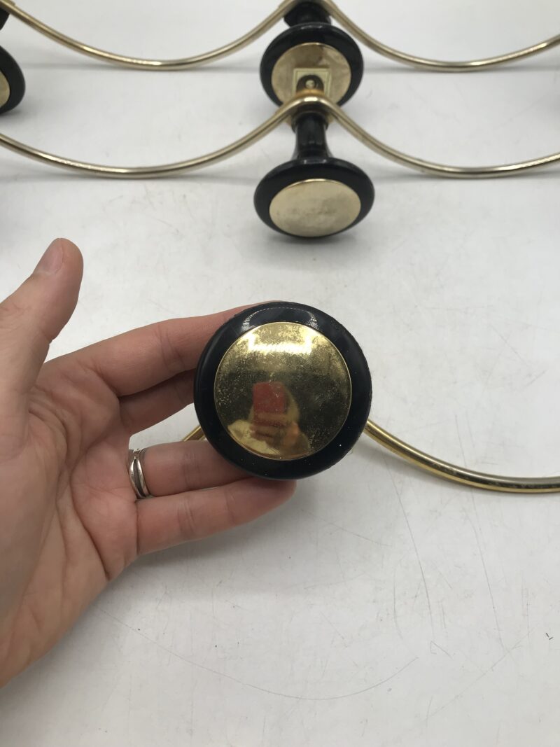 Alerte pépite !!! Ensemble de 4 patères années 60. Ce lot va séduire les amoureux du style vintage des années 60.le lot est composé de 4 patères avec trois accroches, de couleur or et noir. Les patères sont en laiton doré à l’or fin et en plastique pour les parties noires. Elles sont en bon état général, quelques marques d’usure sur la couleur or (cf photos). A noter aussi des marques sur le plastique sur deux patères (cf photos). Des beaux accessoires pour une ambiance réussie. Très fonctionnelles et raffinées elles seront du plus bel effet dans votre intérieur. A adopter d’urgence.
