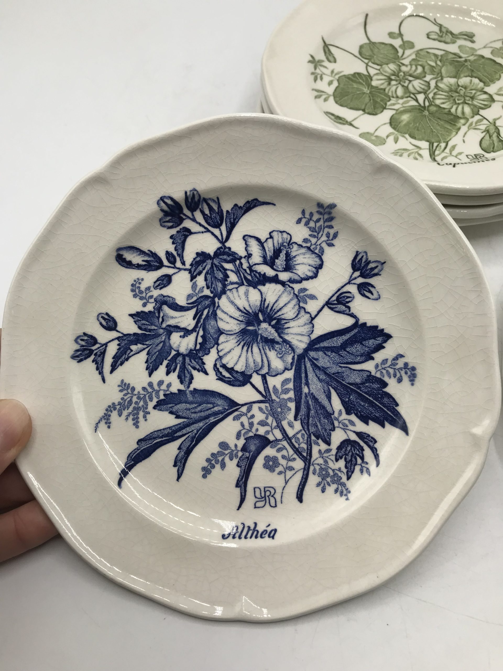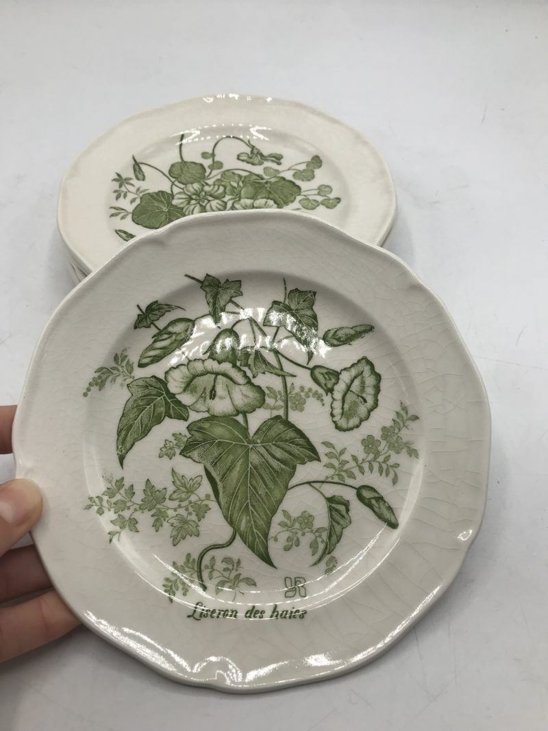 Alerte pépite !! Cet ensemble de 6 pettes assiettes de Gien pour la marque Yves Rocher, sont vraiment superbes. Très bel état, les dessins ne sont pas usés, les couleurs sont resplendissantes. Produit pour Yves Rochers, l’ensemble est composé de, 4 modèles « capucines » de couleur verte, un modèle » liseron des haies » de couleur verte. Et pour finir un modèle « althéa » de couleur bleu. Un coté floral omniprésent pour célébrer cette marque de bien être.