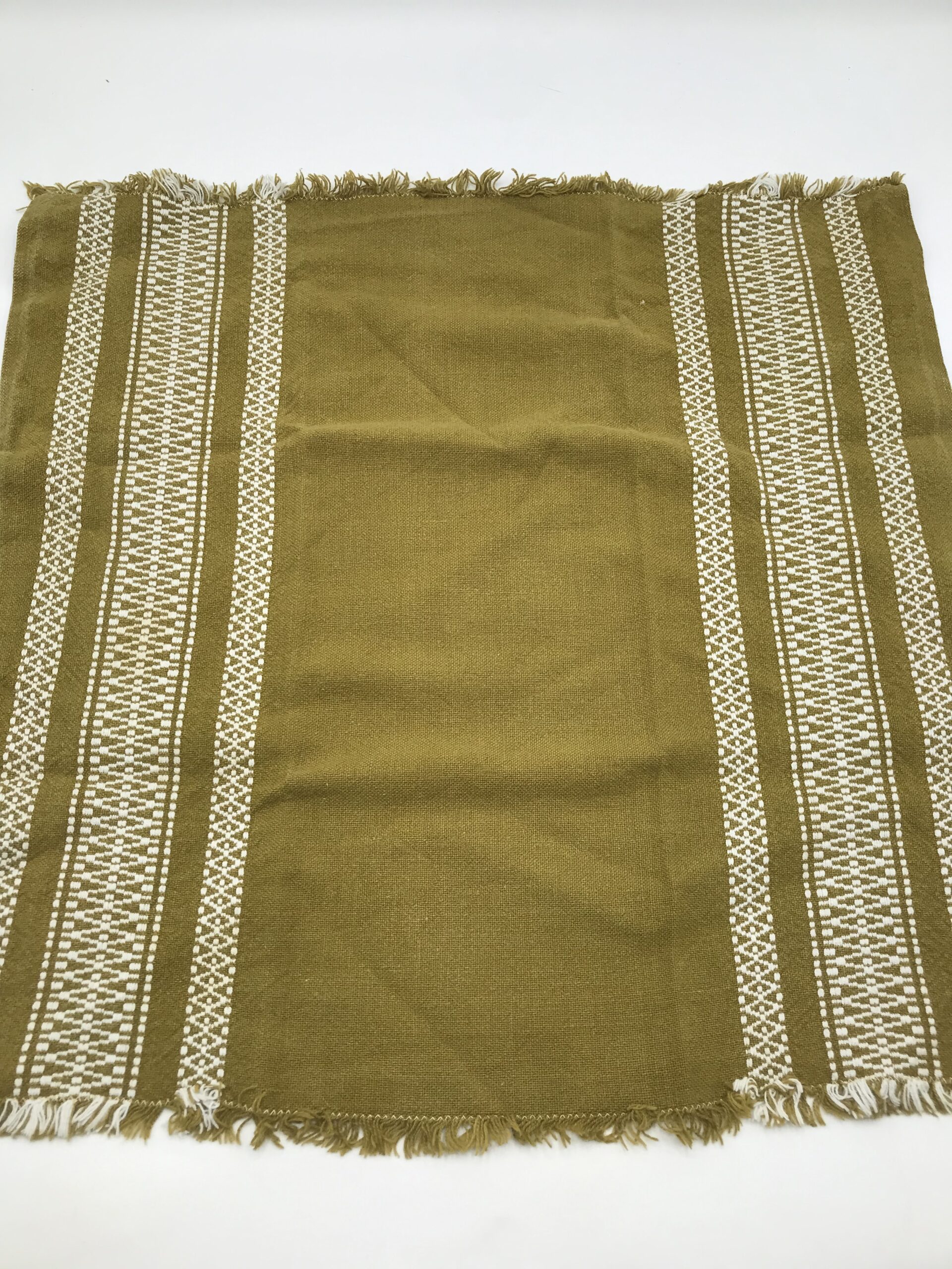 Alerte pépite !!!!! superbe ensemble nappe et serviette brodées, de couleur kaki vintage avec franges. Magnifique lot, une nappe de forme rectangulaire, avec au milieu un large bandeau de broderie traversante blanche aux motifs géométriques. La nappe mesure 1,80 m de longueur par 1,27 m de largeur. Cette nappe est accompagnée de 8 petites serviettes de table de taille 45 x 43 cm. Le tout est de couleur kaki avec broderie blanche. L’ensemble est dans un très bon état. De quoi habiller vos tables pour de belles occasions.