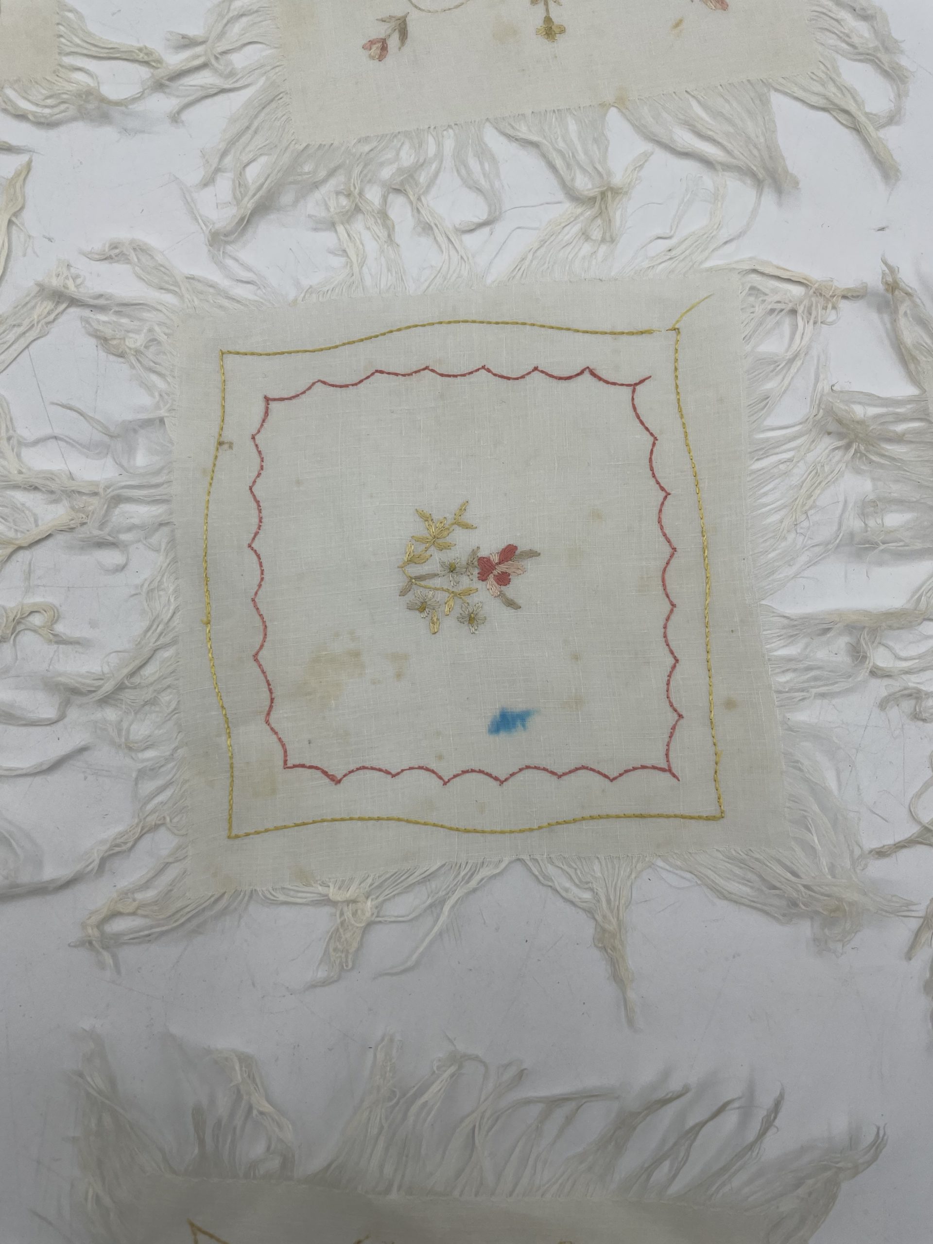 Comment rester insensible face à tant de beauté. Ce joli lot se compose de 7 petits napperons. De forme carrée, les napperons sont dépareillés. Il y en a 3 identiques. Les napperons sont décorés avec des motifs de petites fleurs brodées avec des fils de couleur jaune, doré, rose et beige. Le travail sur chacun est très fin et très travaillé, et chacun des napperons se termine en franges fines. Vintage, des traces d’usure sont à prévoir s(cf photos) jolies marques du temps passé. Des petits napperons absolument magnifiques pour une décoration à l’esprit vintage, retro, champêtre, romantique ou bohème !