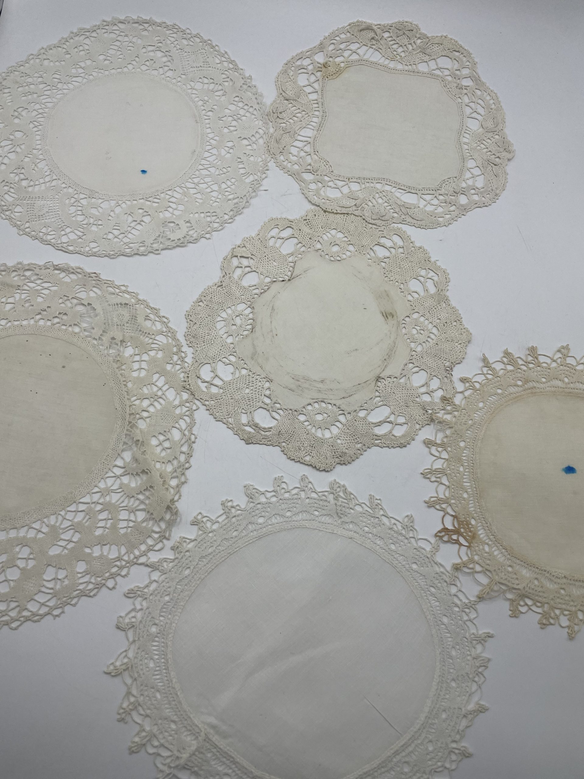 On craque d’amour pour ce bel ensemble qui se compose de 6 napperons vintage dépareillés de différentes formes et tailles. Réalisés au crochet, les napperons sont de couleur beige et écru. 2 d’entre eux sont ronds et ont une broderie identique. Les napperons moyens ont une jolie forme de collerette. Quant aux plus grands, ils ont une forme ronde et présente aussi les mêmes motifs de broderie. Vintage, des traces d’usure sont à prévoir (cf photos) jolies marques du temps passé. Des jolis napperons absolument magnifiques qui iront parfaitement sous de jolis vases vintage ou des bibelots de collection pour une décoration à l’esprit vintage, retro, champêtre, romantique ou bohème !