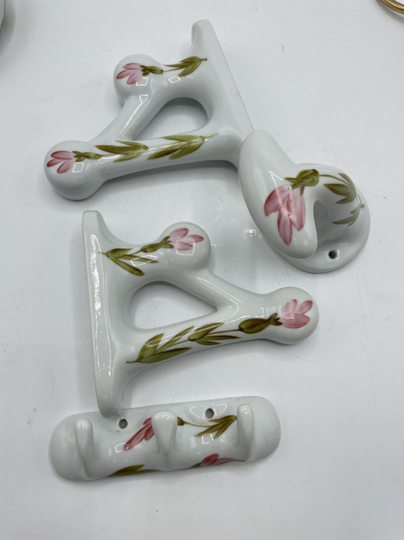 Des fois on tombe sur de magnifiques pépites comme celle-ci ! Ce joli lot d’accessoires vintage pour la salle de bains se compose de 8 éléments : 1 porte-serviette, 1 patère pour porter une serviette en forme de crochet, 1 patère à gants de toilette, 1 porte-savon, 2 patères pour accrocher des barres de suspensions et 2 plaques de propreté à fixer au mur. Vintages, les accessoires sont en porcelaine de Limoges et ils présentent quelques légères traces d’usure (cf photos) jolies marques du temps passé. De couleur blanche, ils sont décorés de motifs de fleurs roses et vertes peintes à la main et estampillés Poterie du Marais ce qui en fait des pièces uniques ! Un superbe lot pour des amoureux de maison vintage qui veulent transformer leur salle de bain ou donner un côté rétro et vintage à leur déco !