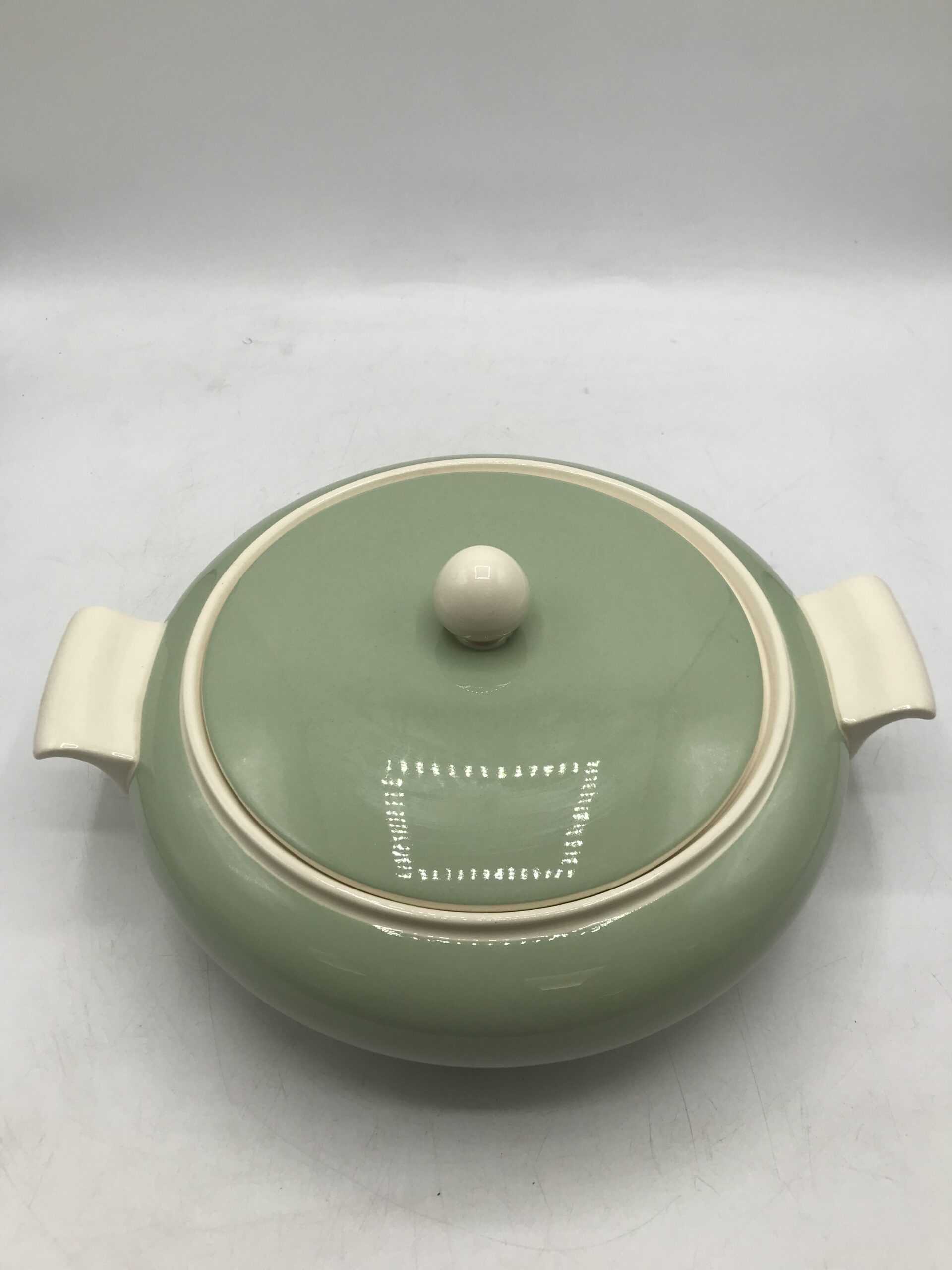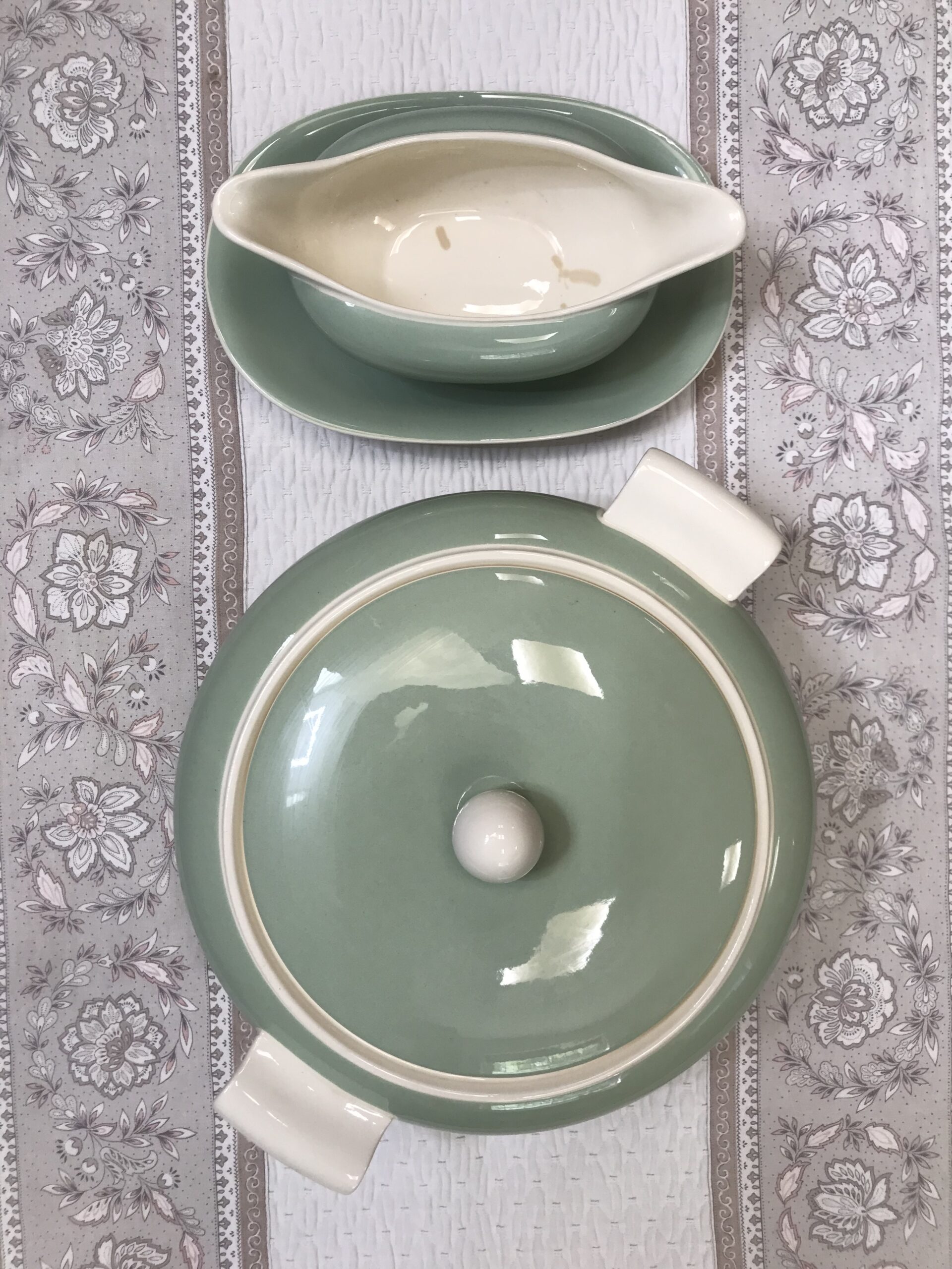 Ensemble Villeroy et Boch vert céladon. Très bel ensemble signé Villeroy et Boch, le tout est en bon état général, a noter quelques traces de patine sur la saucière (cf photos). Cette ensemble comprend une superbe soupière basse, la soupière a un diamètre de 24 cm hauteur 8 cm sans couvercle et 13 cm avec couvercle. La saucière elle a une taille de 22 x 14,5 x 8 cm de hauteur. Joli duo qui se complète à merveille, les courbes sont douces et rondes, et cette couleur vert céladon pastel qui vient souligner ce style. Une vraie bouffée de cocooning en vue, aller zou en cuisine, ces deux pièces vous aiderons à séduire vos convives. Le charme de la vaisselle ancienne qui traverse le temps et reste toujours à la pointe de la déco.