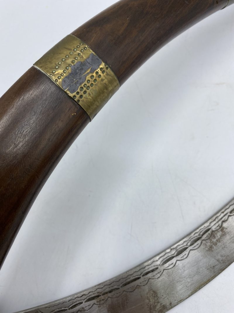 Collectionneurs d’armes blanche et de collection, cette belle épée vintage est origianire d’Afrique du Nord. La lame en acier est courbée et graée de motifs ornementaux et elle se termine en pointe. La me est protégée par un fourreau courbé en bois gravé et décoré d’éléments en laiton. La garde du poignard est en métal et la poignée est en bois et elle est décorée avec les mêmes motifs vus sur le fourreau avec des ajouts de fils métalliques et un élément en métal qui permet d’accrocher l’épée. Vintage, des traces d’usure et une fissure sur le manche sont à prévoir c(f photos) jolies marques du temps passé. Une belle épée à collectionner