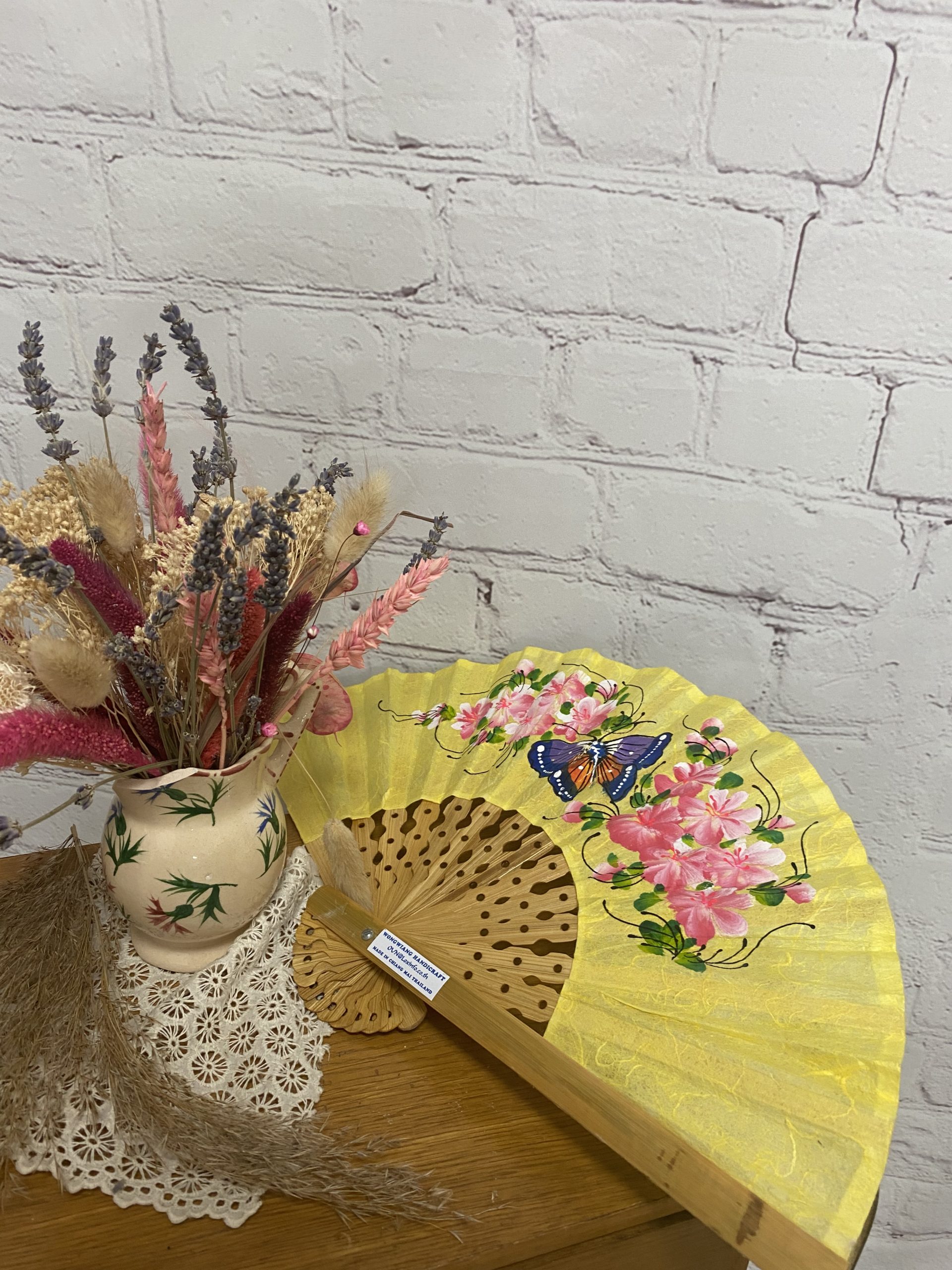 On adore ce joli éventail Wongwiang Thaïlande jaune en papier parchemin et en bambou. D’une jolie couleur jaune, l’éventail est peint avec un motif de fleurs rose et d’un paillon bleu, violet et orange.