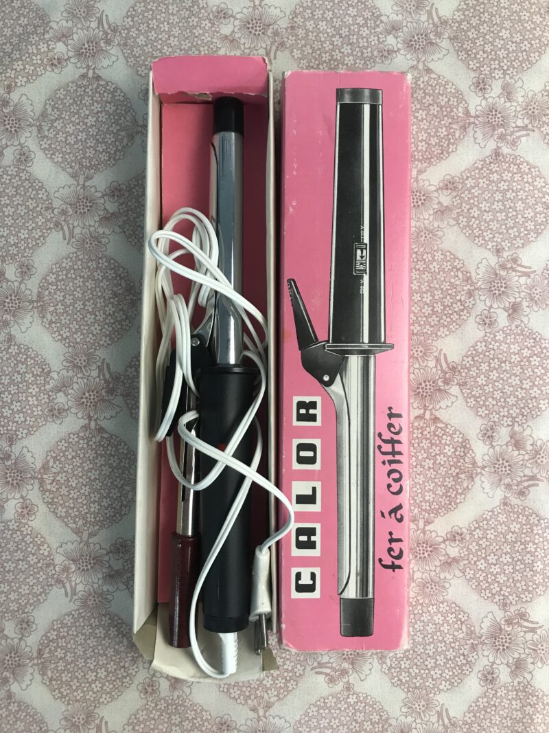 Fer à coiffer Calor vintage. Pour les fans de Calor voici un fer à coiffer dans sa boite d’un rose pétant. Voici donc un fer à bi tension avec thermostat, testé il fonctionne parfaitement. Joli voyage dans le temps que nous offre cet appareil. Personnellement je suis addict de sa boite d’origine. Si vous souhaitez faire une déco vintage ou une vitrine à thème, il sera parfait. Il est prêt pour vivre une seconde vie. En avant la création de coiffures. Une invention chic et choc de l’époque.