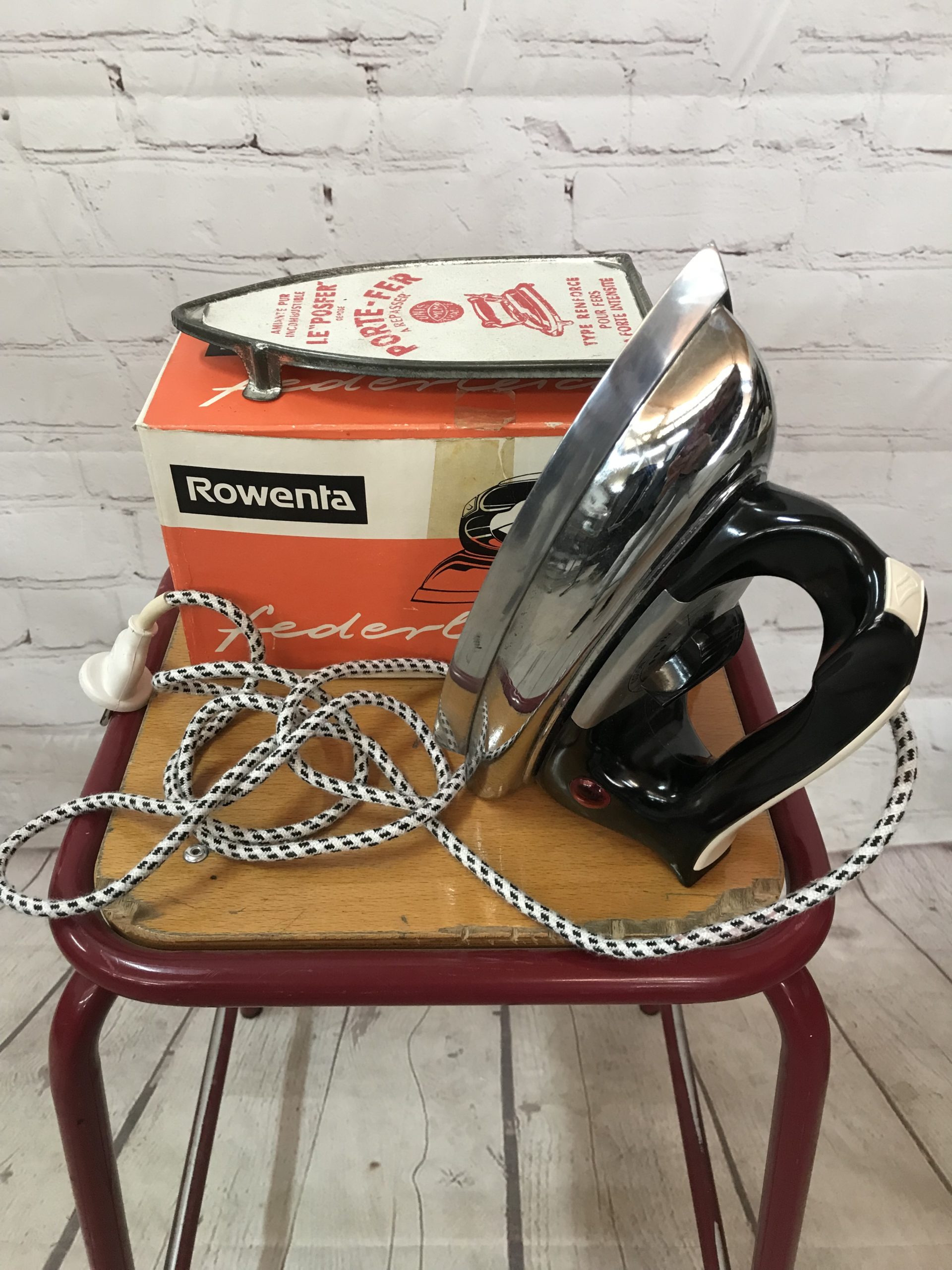 Alerte pépite !!! Petit fer a repasser model E 5291 de marque Rowenta. Il est dans sa boite d’origine aux couleurs vintage. Il possède sa notice et le ticket d’achat original. Un vrai petit témoignage du temps passé. Etat parfait. Un petit électroménager qui pourrait pour une fois faire plaisir en cadeau.