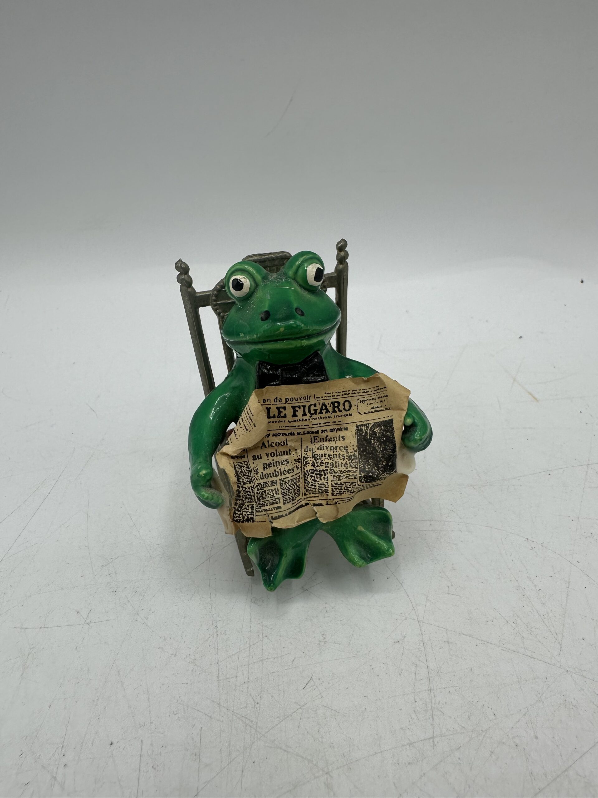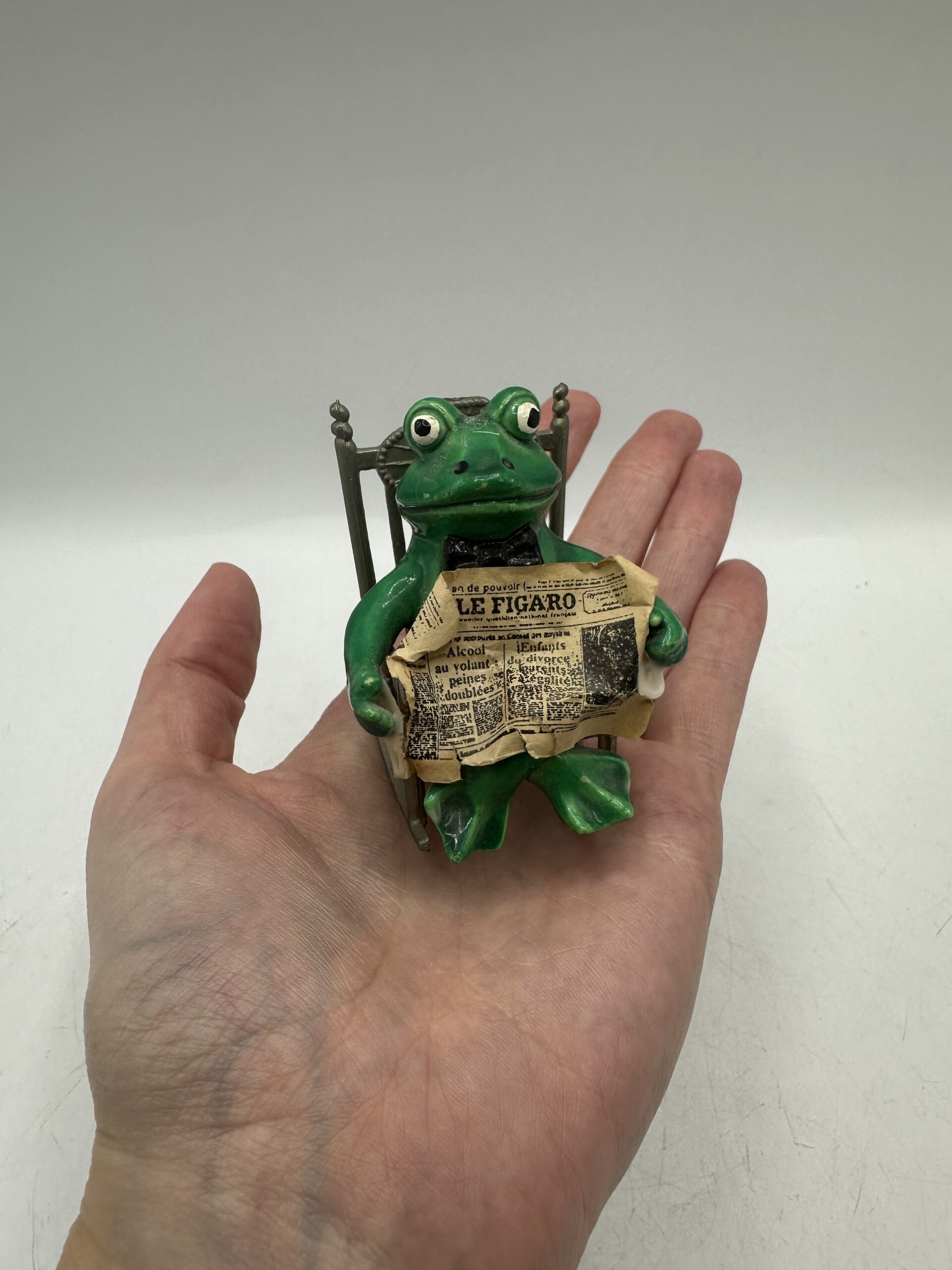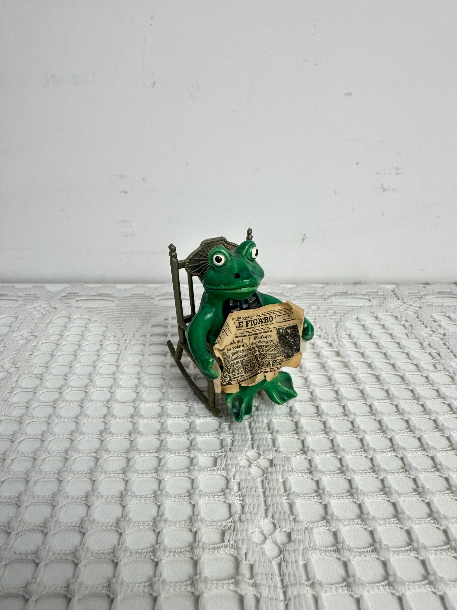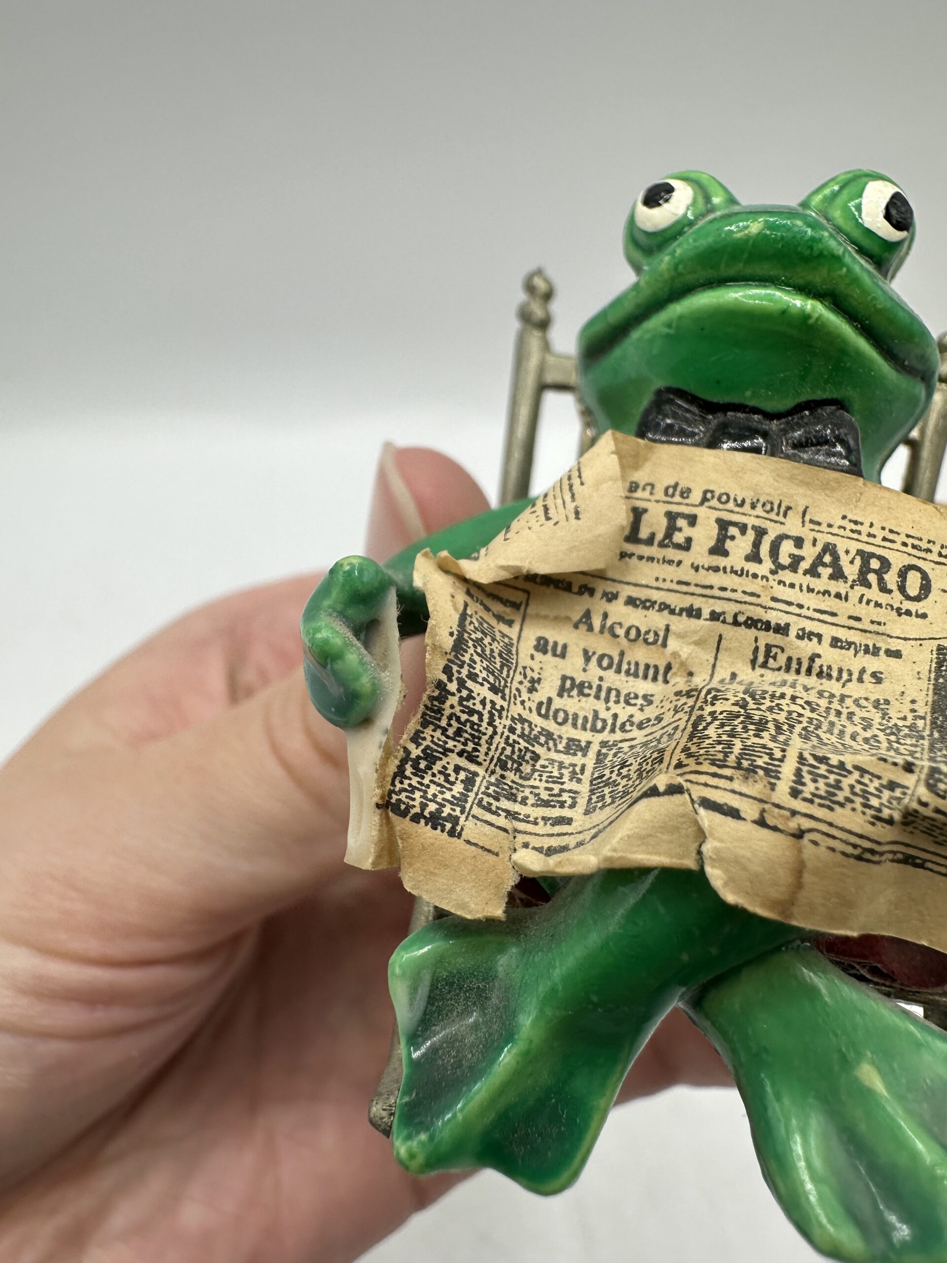 On adore les objets de curiosités et les figurines originales ! Cette ravissante figurine grenouille vintage représente une grenouille assise sur une chaise à bascule, avec un journal « Le Figaro » dans ses mains.