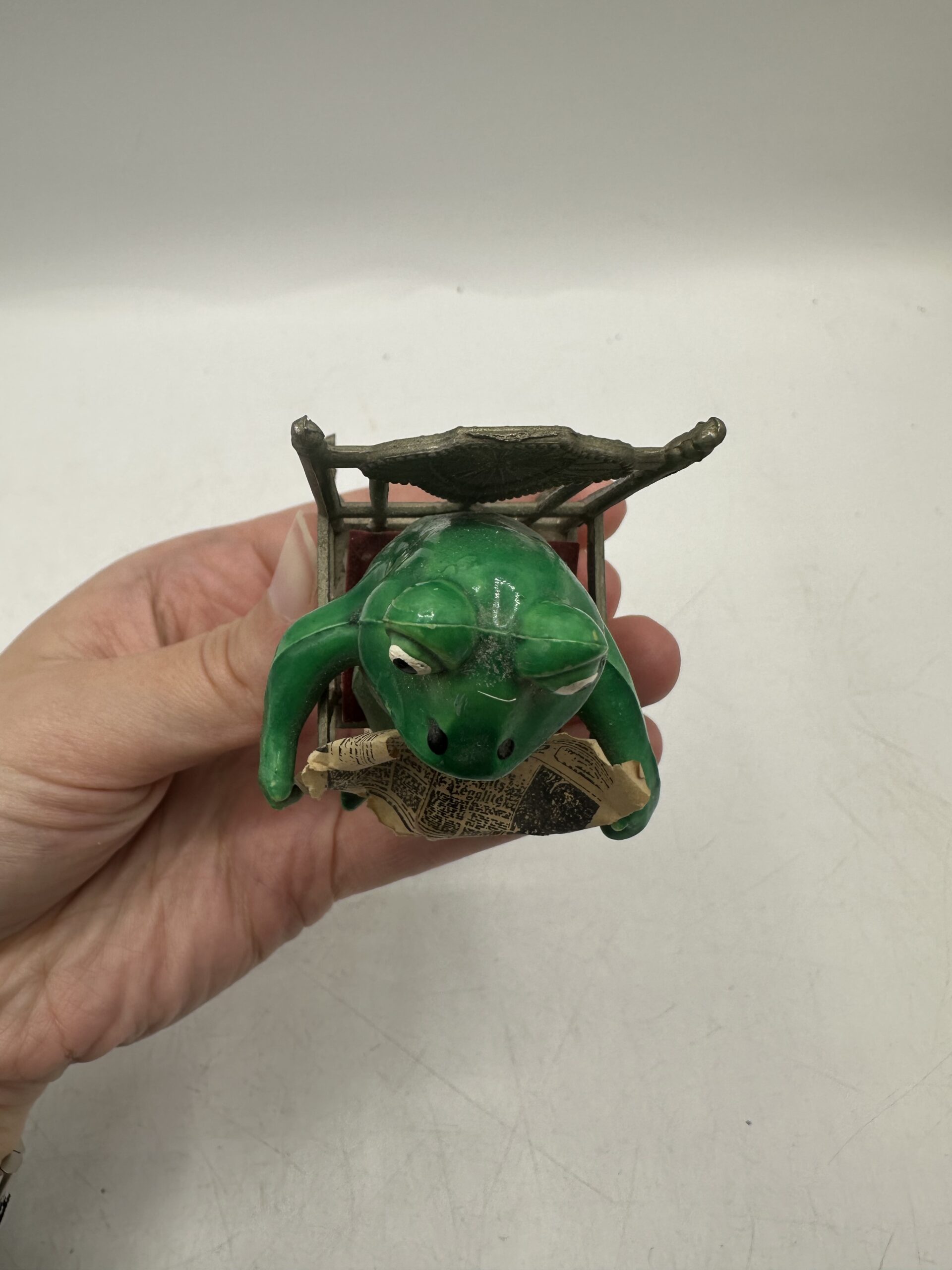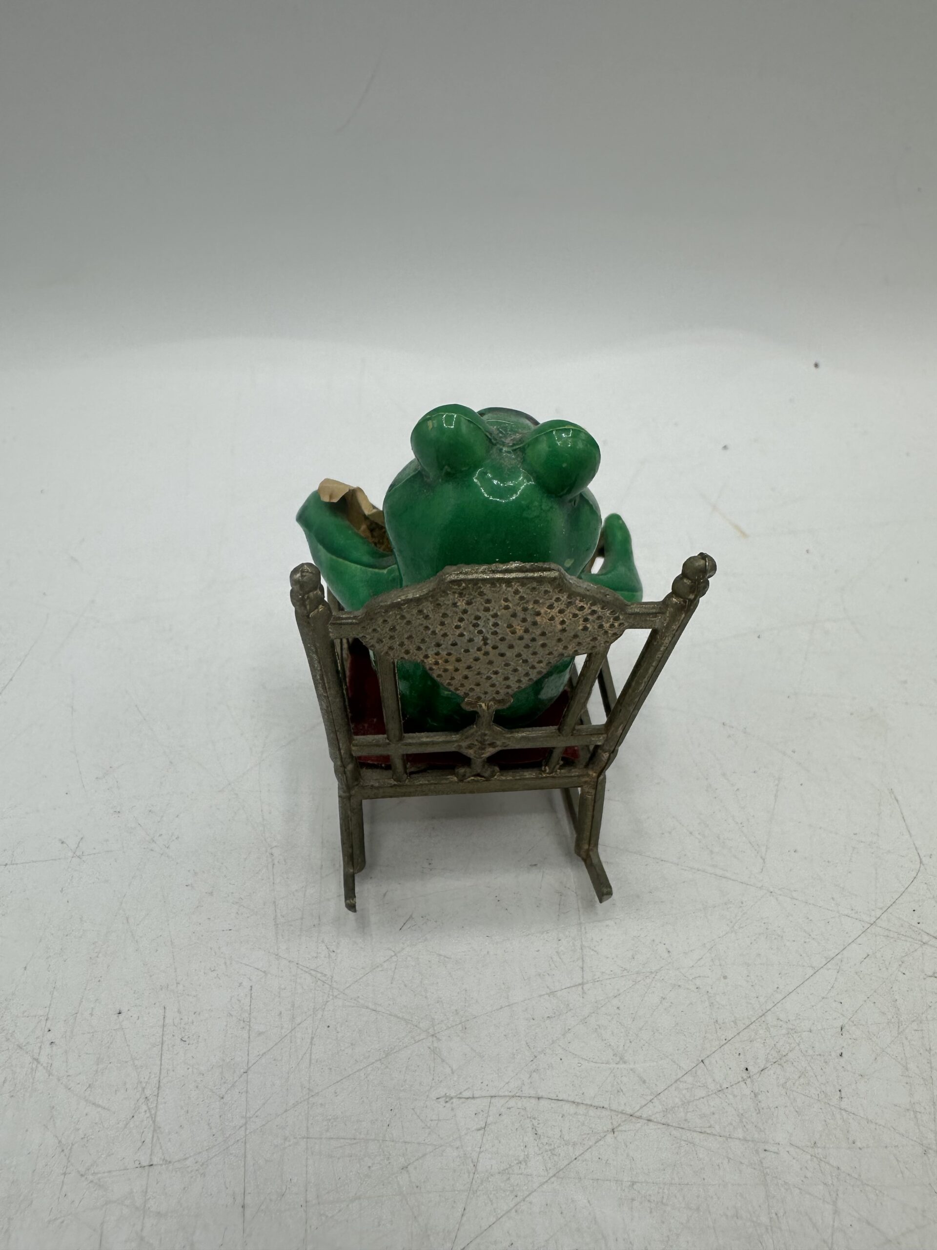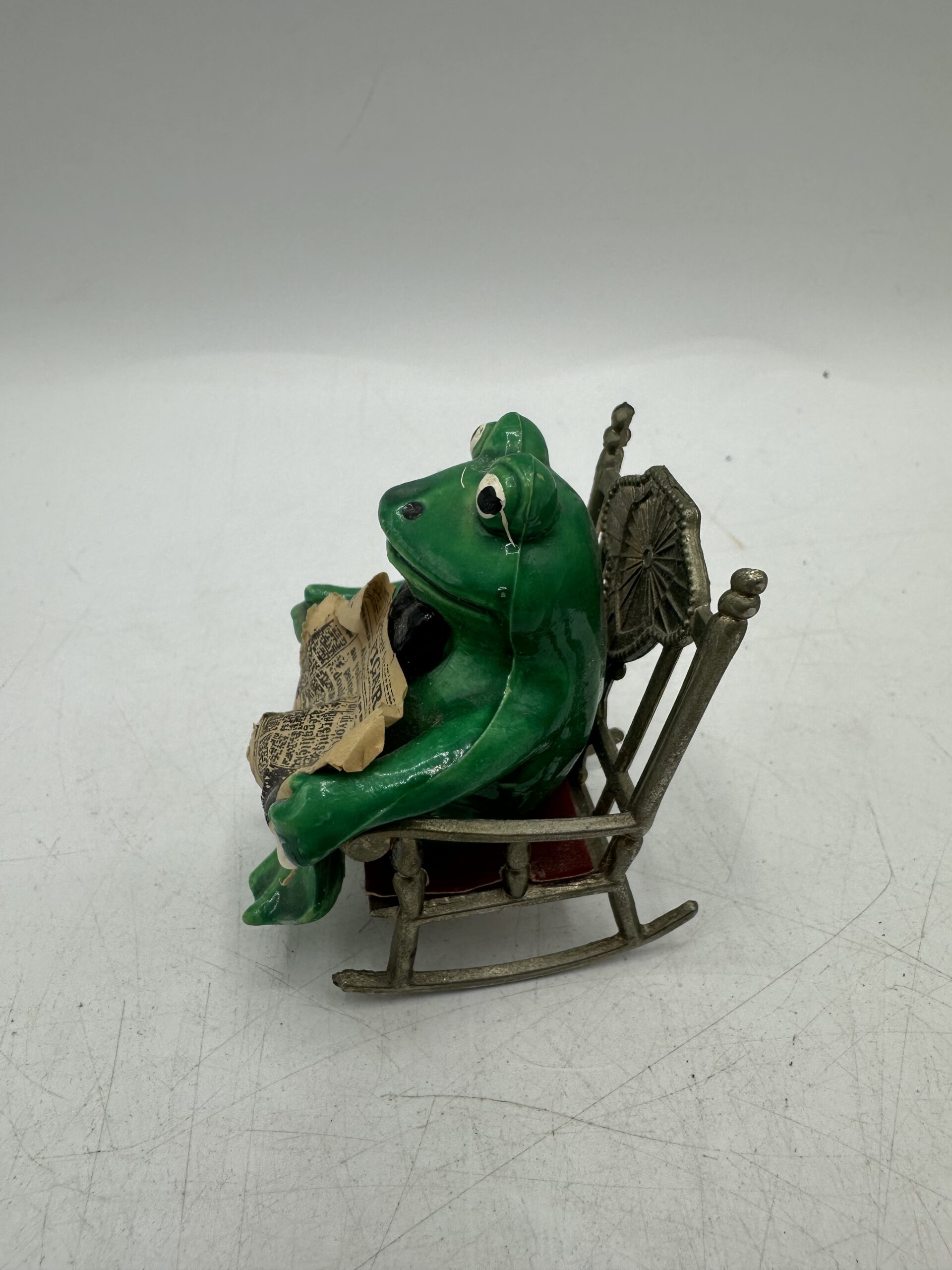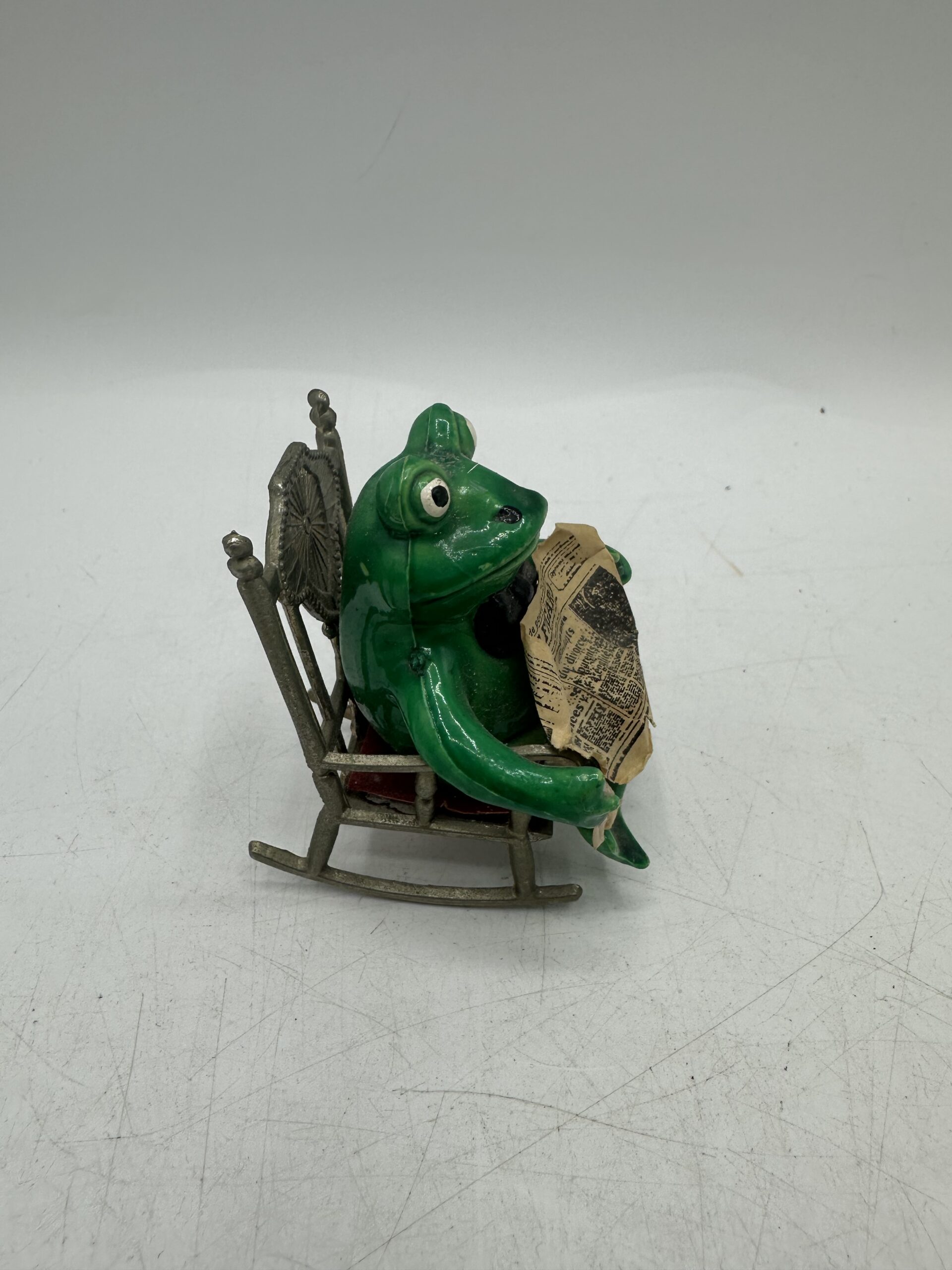 On adore les objets de curiosités et les figurines originales ! Cette ravissante figurine grenouille vintage représente une grenouille assise sur une chaise à bascule, avec un journal « Le Figaro » dans ses mains.