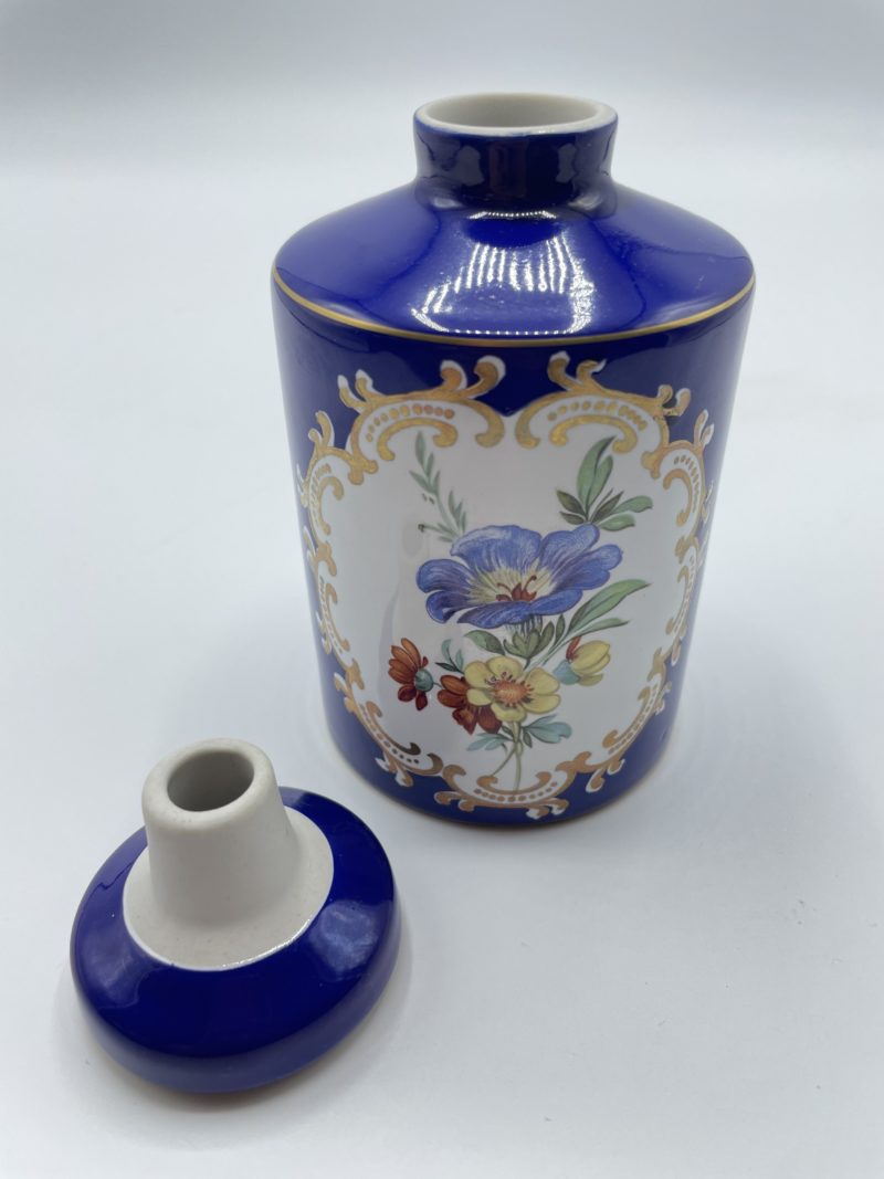 Ce magnifique flacon vintage en porcelaine est estampillé Royal KM est il et en faïence de Bavière. De couleur bleu roi, il est décoré avec une jolie peinture de fleurs et des détails dorés. Une trace est visible sur l’arrière du flacon (cf photos) sans incidence sur son aspect esthétique ou pratique. Décoré et peint à la main, ce flacon est une création artisanale et c’est donc une pièce unique ! Parfait pour conserver vos huiles ou pour tout autre usage !