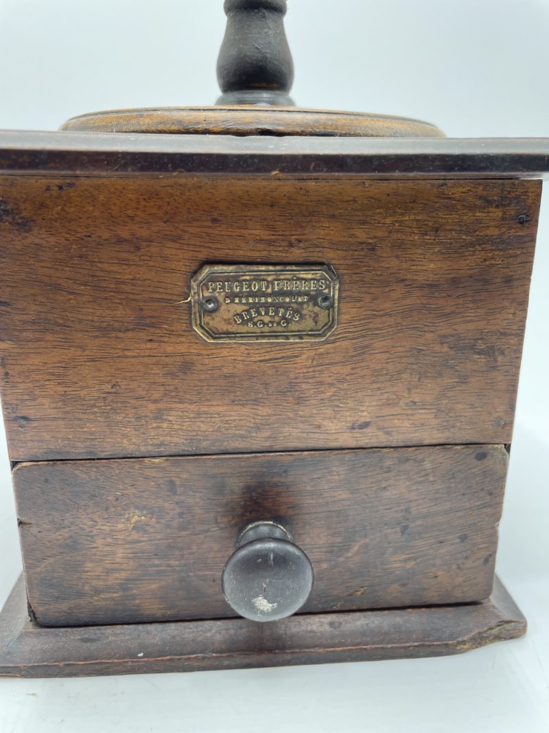 On adore ce sublime moulin à café vintage. Marqué de l’emblématique sigle Peugeot Frères, le moulin en bois est de grandes dimensions et il est marqué d’une petite plaque métallique sur laquelle on peut lire Peugeot Frères D’hérimoncourt brevetés BGG. Vintage, des traces d’usure sont à prévoir (cf photos) jolies marques du temps passé. Un sublime moulin en bon état général parfait pour un déco vintage ou pour faire de bons cafés moulus !