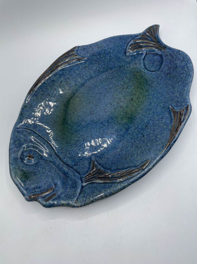 Ce magnifique plat en céramique de couleur bleu est en forme de poisson. De fabrication artisanale, il est signé au-dessous de la main du céramiste et c’est donc un objet unique ! Les détails du poisson sont en relief e ils sont très soignés.Vintage, des micro rayures sont à prévoir sur le poisson (cf photos) sans grande incidence sur l’esthétique ou l’aspect pratique du plat. E grandes dimensions, il sera idéal pour présenter un beau poisson à table avant de le servir à vos invités, comme corbeille de fruits ou encore comme vide poche pour y déposer vos clefs et votre journal du matin !