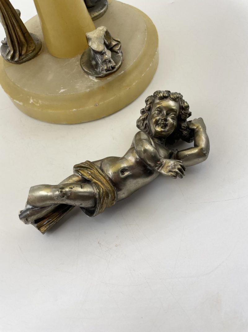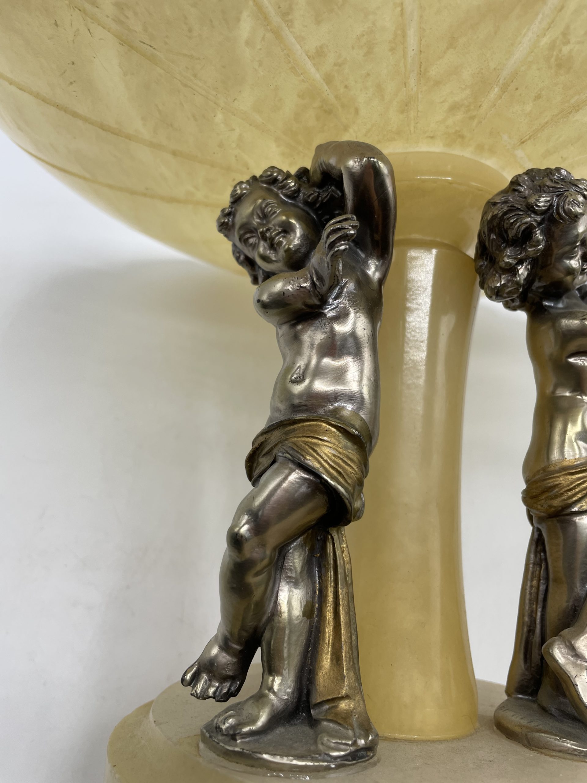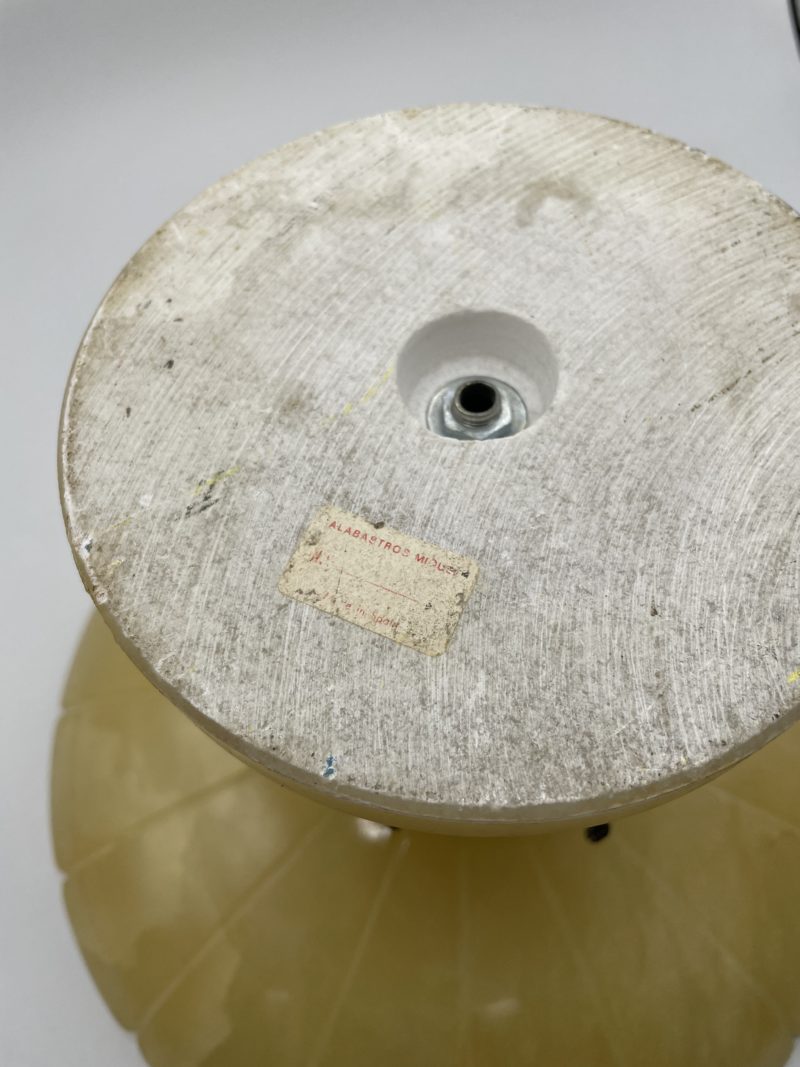 On adore cette sublime coupe à poser en albâtre. De grandes dimensions, la coupe a une jolie forme de collerette. Posée sur un socle et un pied, la coupe est soutenue par 3 chérubins de couleur argent. Vintage des années 70, le vernis de la coupe présente des traces d’usure et il y a des petits éclats à prévoir (cf photo). De plus, l’un des chérubins est cassé, il faudra prévoir de le recoller avec une colle spécialement prévue pour. La coupe est signée Alabastros Miquel et elle a été fabriquée en Espagne. Une belle coupe qui peut servir de jardinière ou à poser pour une jolie déco rétro et élégante !