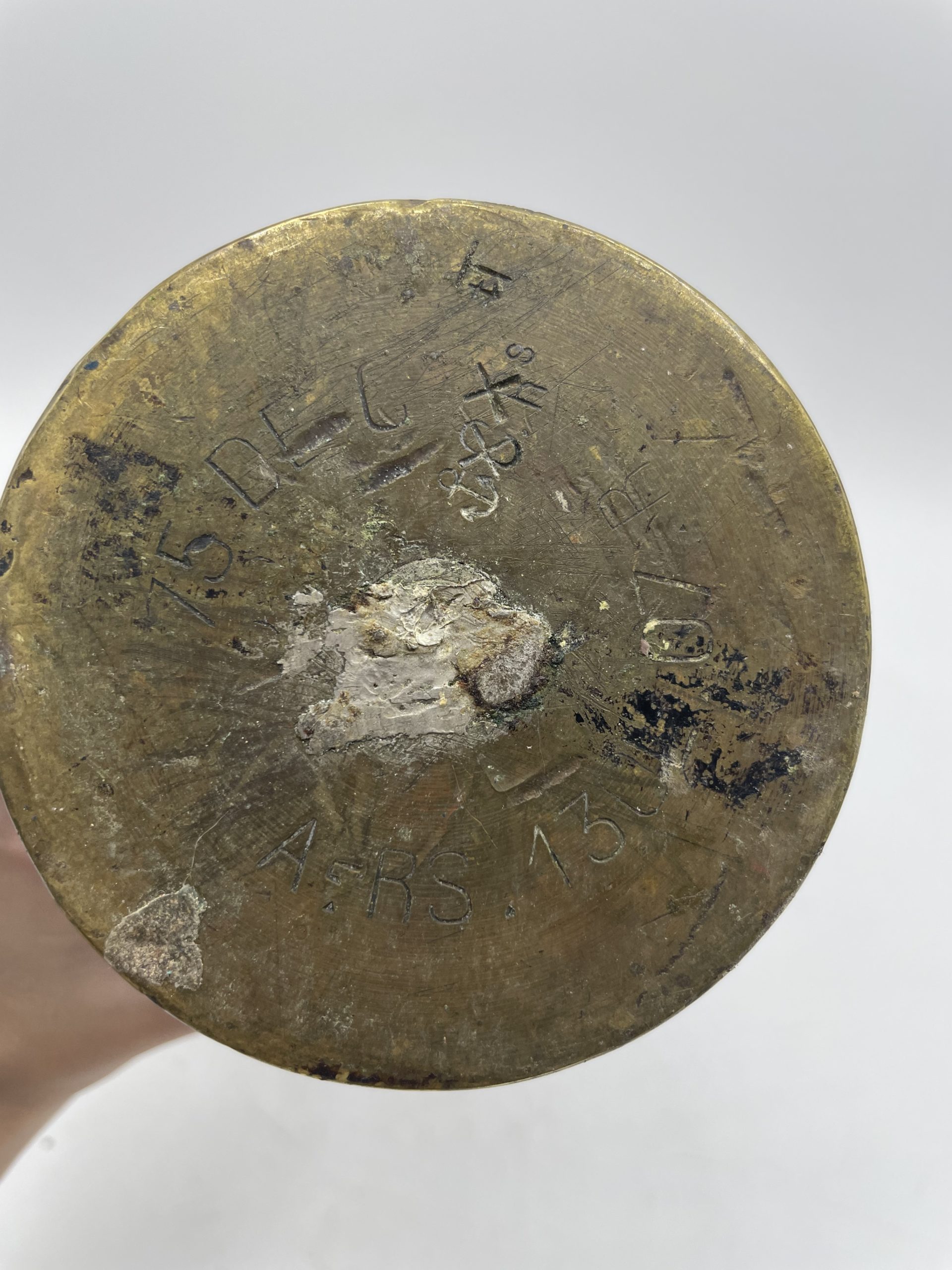 Cette grande douille d’obus de 1914 est un objet dit d’artisanat des tranchées. Travail d’un soldat poilu, cette douille est décorée avec des motifs de feuilles de vigne sur fond martelé. En-dessous, la douille est gravée de numéros et de lettres ainsi que d’une ancre qui fait penser que cette douille provient d’un bâtiment maritime.Bel objet commémoratif de la guerre de 14-18 qui peut être transformé en un grand vase.