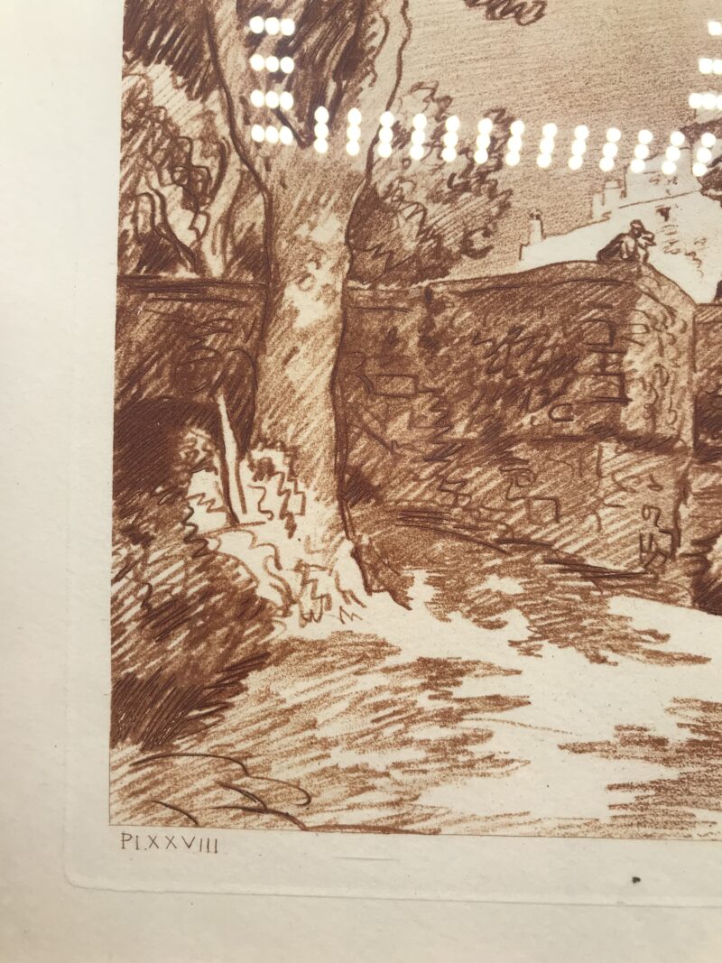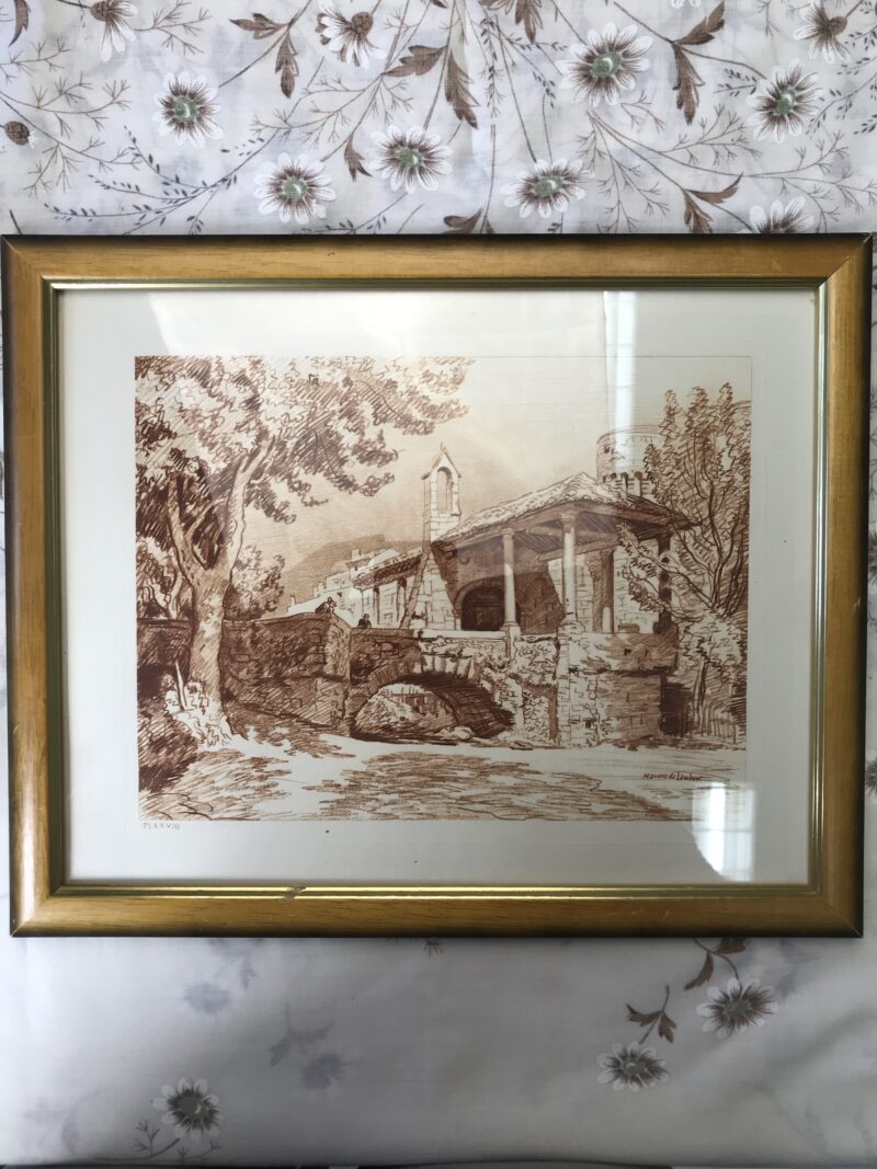 Alerte pépite!!! Amoureux d’art et de dessin, cette gravure ancienne d’un château faite par Maurice de Lambert est pour vous. Une très jolie réalisation pleine de finesse dans les dessins. De couleur sépia ce paysage est magnifique. Il pourra apporter une touche de voyage et de nature sur vos murs. Maurice de Lambert était un peintre dessinateur, actif jusqu’en 1952, élève de Gustave Moreau, il exposa à Paris, New-York, Bruxelles et Madrid. Une belle œuvre en très bon état, quelques traces sur les contours de la feuille. La gravure est livrée avec un cadre de couleur marron foncé et clair avec un bord doré. Taille de la gravure 24 cm sur 18 cm.