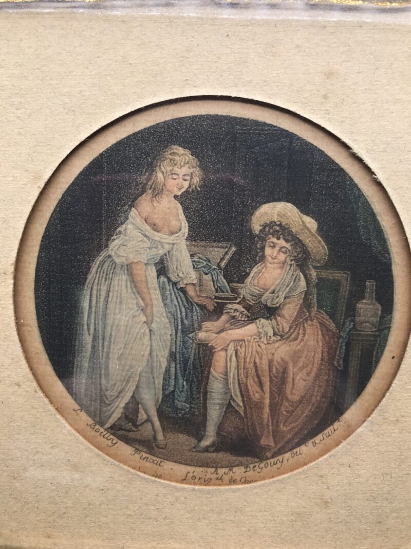 Gravures eau forte Schlumberger. Duo de gravures eau forte Schlumberger. les estampes sont dans des cadres en bois de couleur noir et or. Le diamètre de la gravure est de 7 cm. Le cadre a une taille de 16,5 x 16,5 x 2 cm . La première gravure représente deux femmes, une qui mets ses bas et l’autre qui laisse apparaitre sa poitrine. La deuxième gravure représente une femme surprise chez elle par un homme passant par la fenêtre, deux gravures coquines pour l’époque. Le fond des estampes est clouté sur le cadre en bois. De jolies gravures pleine de charme qui enivreront la pièce avec leur parfum d’antan. Avis aux amateurs d’art. A noter que les gravures sont dans leur jus (cf photos) les traces du temps ont fait leur œuvre.