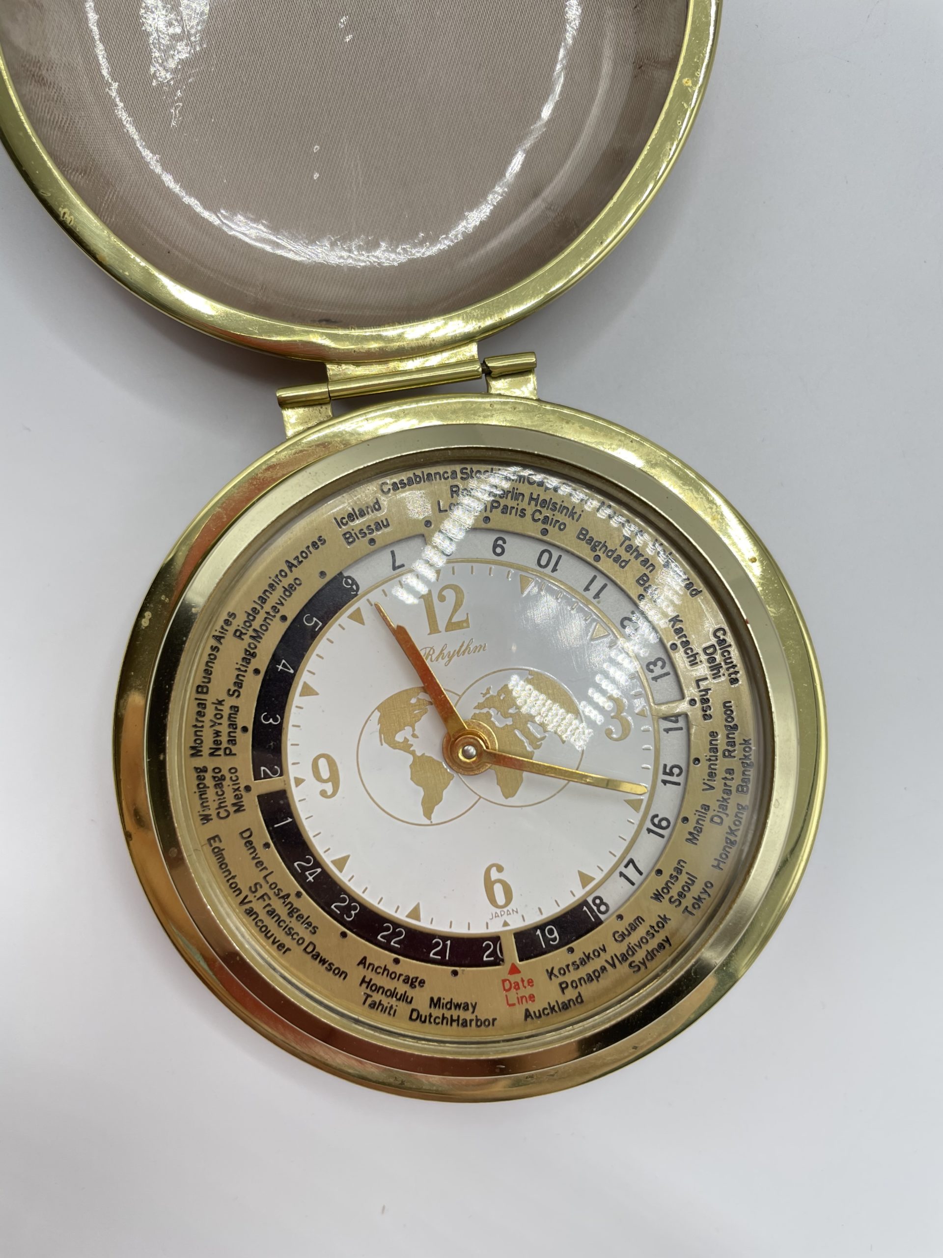 Sublime horloge de voyage vintage dans son écrin en cuir lisse naturel. Fabriquée au Japon par la marque RHYTHM, ce petit bijou a un réveil intégré. Le cadran est décoré avec une illustration de planisphère. Vendue en l’état, cette horloge aura besoin d’être remontée/
