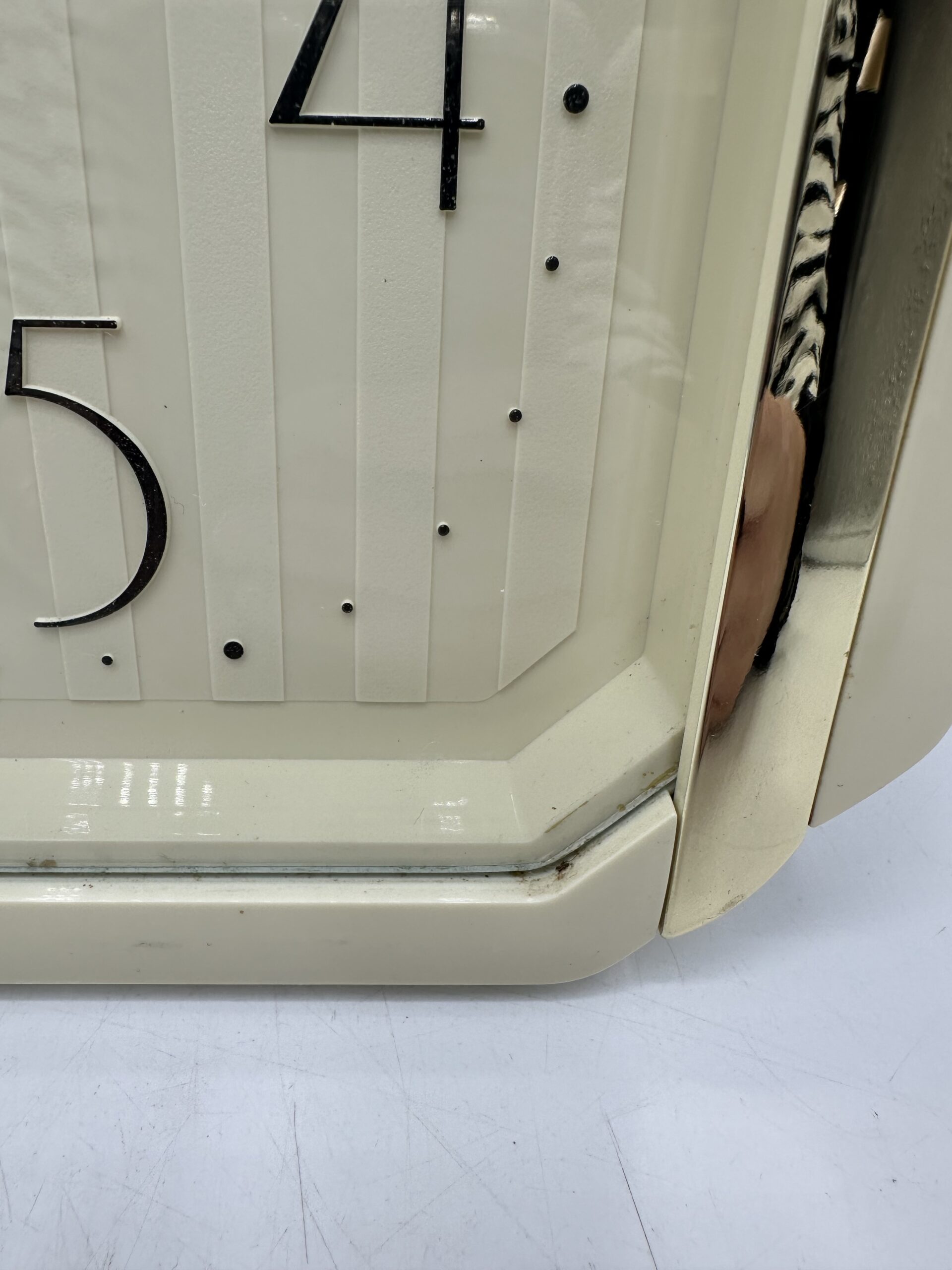 L’horloge est en bon état. Il y a quelques marques mais rien de très visible. (voir les photos). Le cadre est en plastique solide.