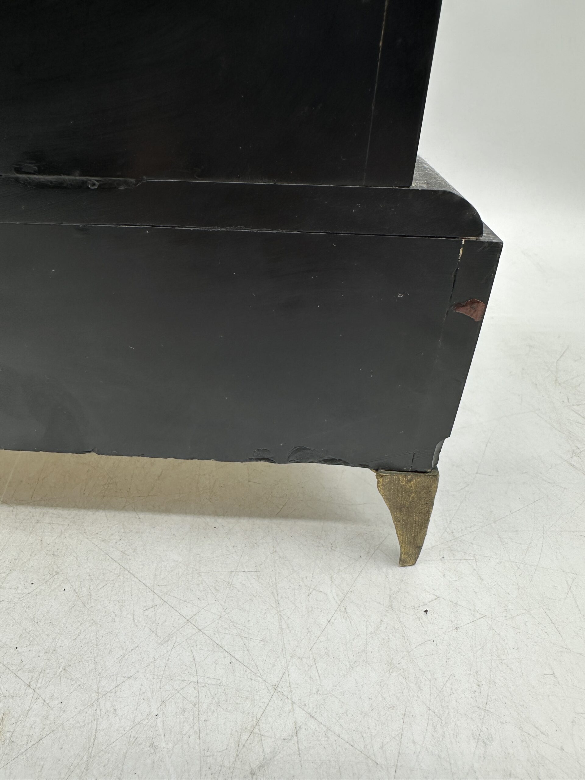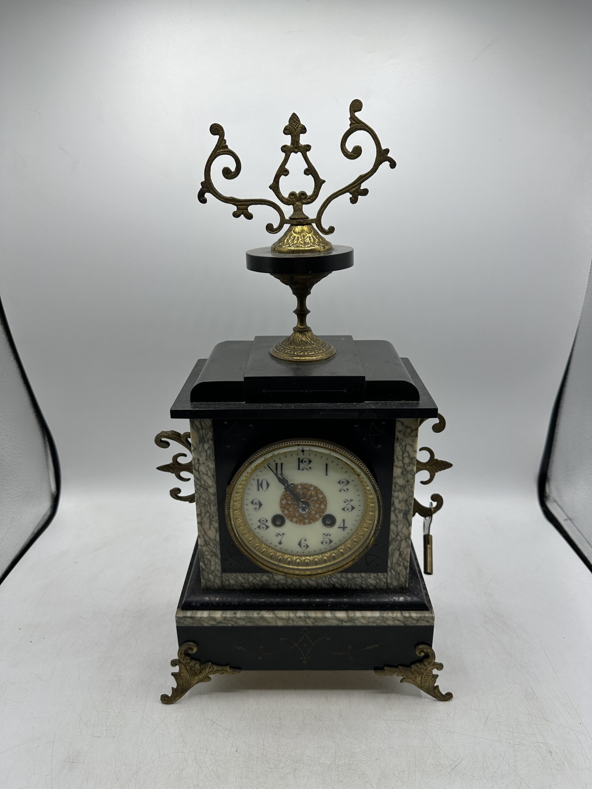 Pendule noire avec détails en marbre plus clairs, et autres détails dorés (peut-être en bronze). Magnifique cadran et clé fournie avec.