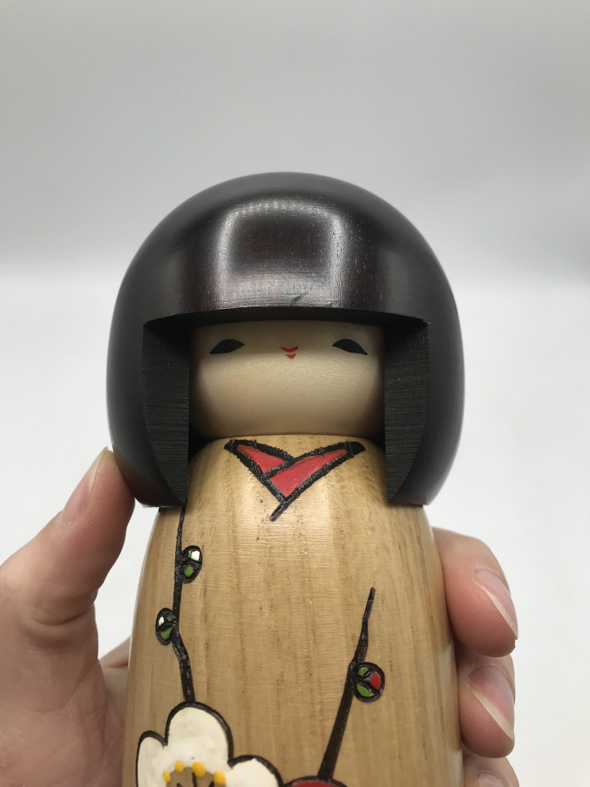 Alerte pépite !!!! Je suis fan de cette petite poupée !!!! La maison Usaburo a réalisé toute une série de kokeshi au décor de fleurs variant selon les saisons. Parmi elles, nous avons sélectionné celle qui s’habillait des célèbres « sakura ». Etant gravées et peintes sur une surface non teintée, ces jolies fleurs de cerisier japonais, peintes avec des couleurs vives, viendront bien mettre en valeur le beau grain du bois de châtaignier. Une autre manière d’offrir des fleurs à vos proches pour exprimer votre gratitude. Elle mesure 15 cm de hauteur pour un diamètre de 5 cm. Un article à offrir avec bonheur.