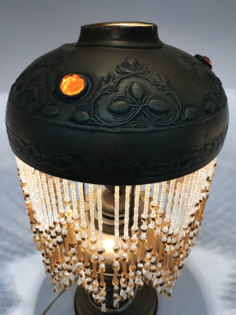 Lampe ancienne en laiton, perles et cabochons de trois couleurs, rouge, vert et orange. Cette ancienne lampe est pleine de caractère. Il s’agit certainement d’une ancienne lampe à pétrole qui à été revue en lampe classique. Elle est en deux partie, la partie fixe, donc le pied et le chapeau qui est à poser dessus. Les perles sont en verre de couleur ambre. Elle est en état de fonctionnement mais porte les marques du temps ( cf photos). Très joli rendu une fois allumée, elle donnera une ambiance chaleureuse et confortable à votre pièce. Elle est en laiton. Un bon nettoyage serra nécessaire pour lui rendre toute sa prestance.