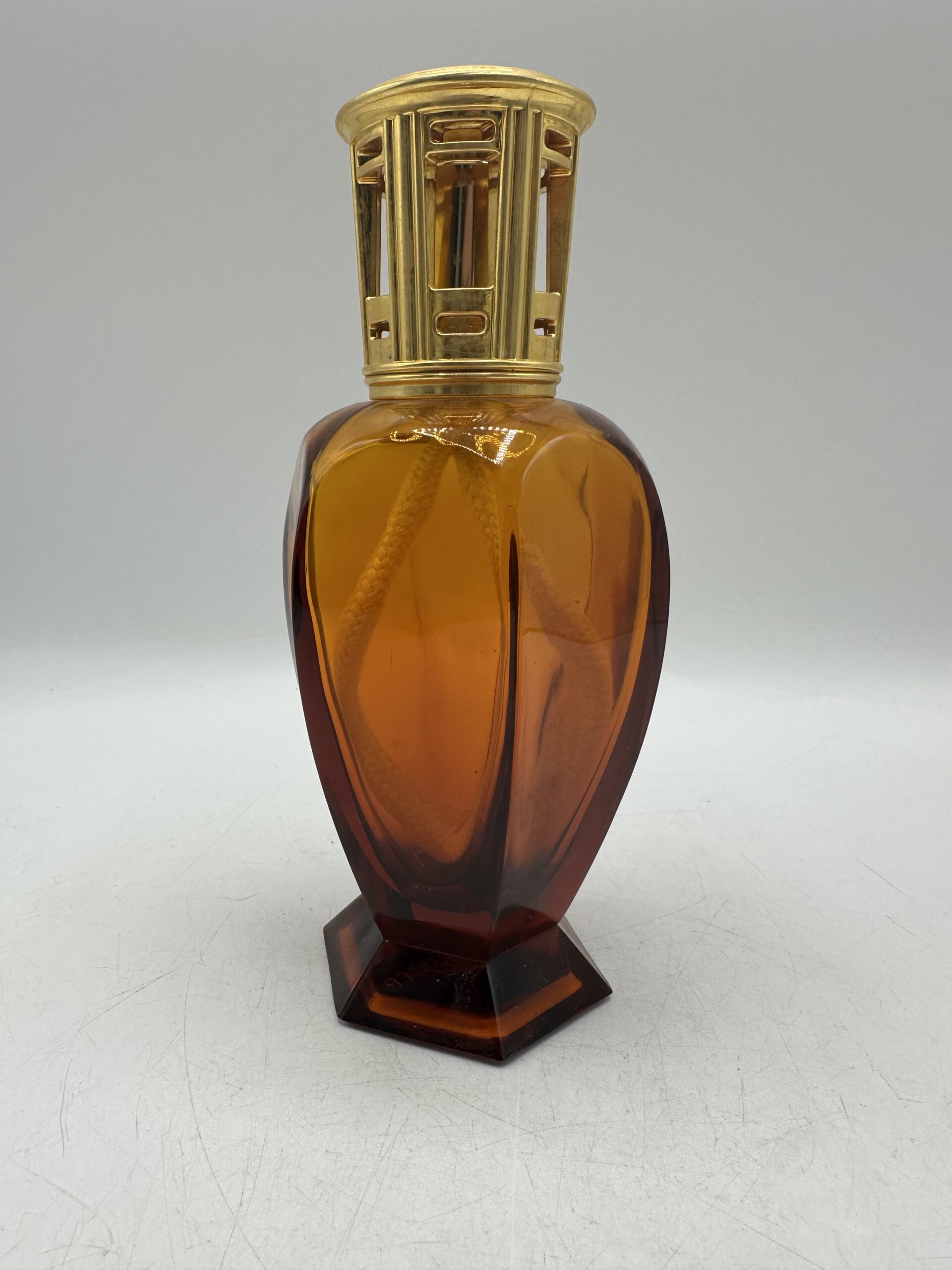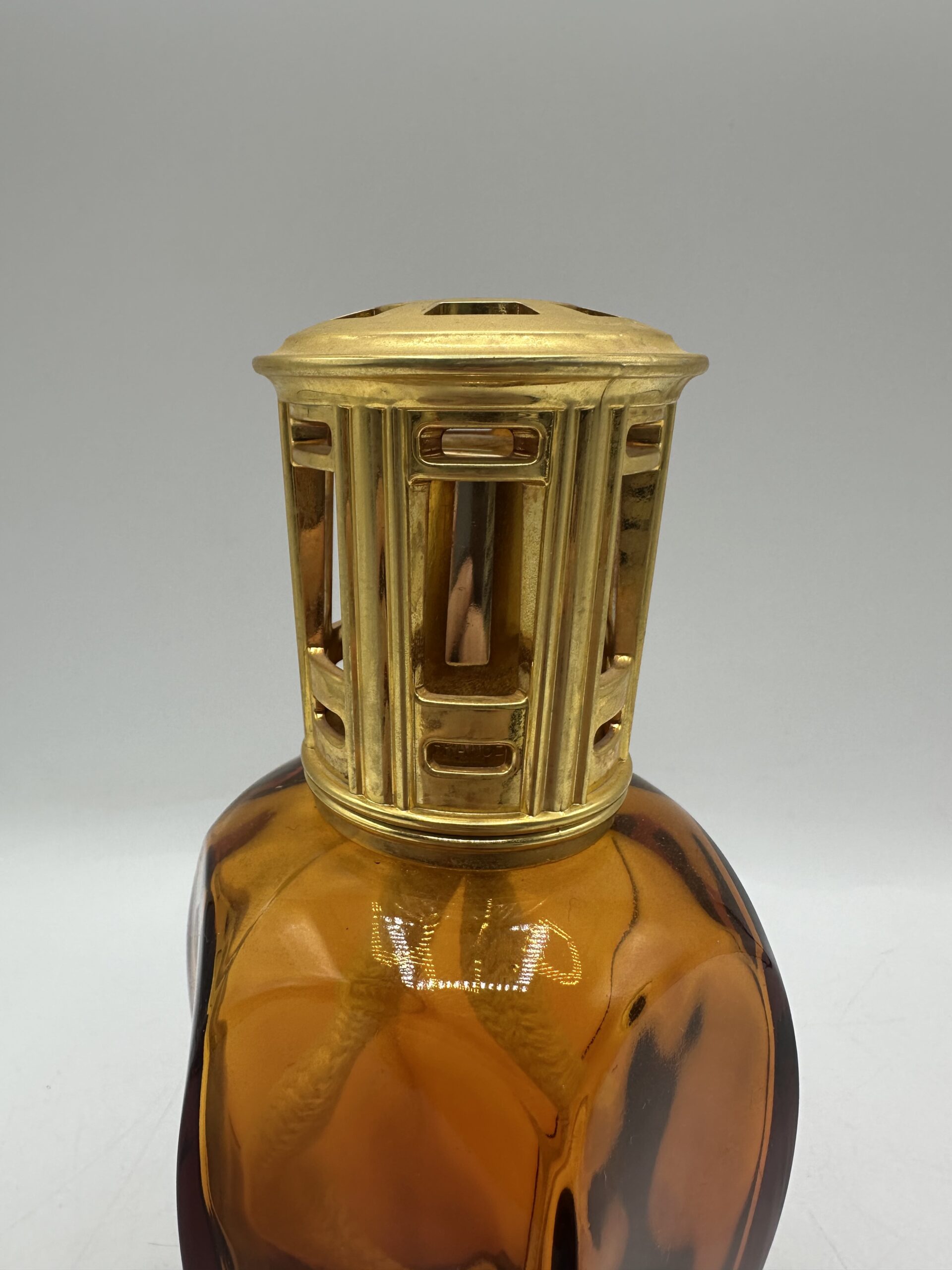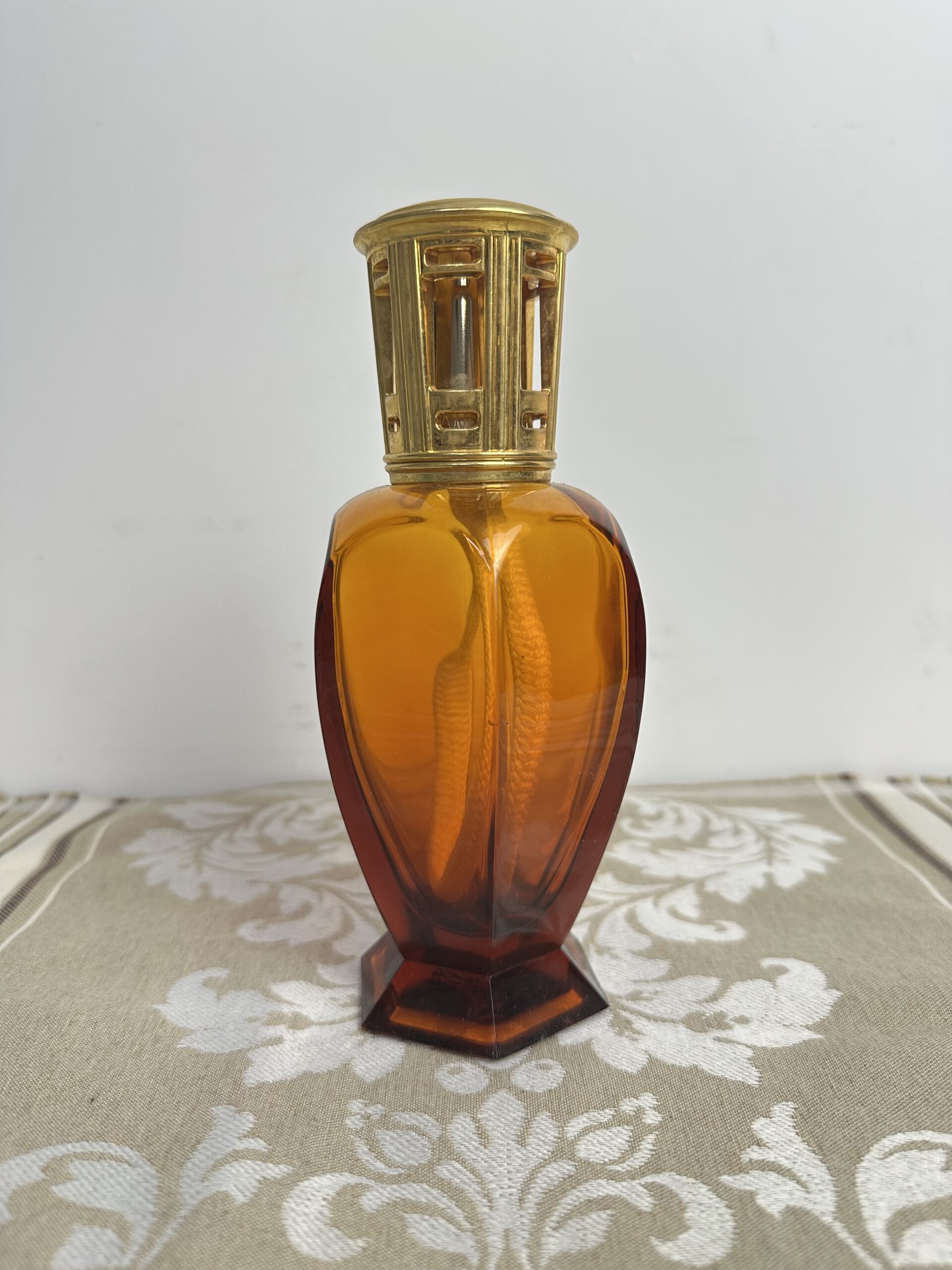 Cette jolie lampe Berger est en très bon état. Quelques petites traces sur le capuchon. Le flacon en verre ambré facetté avec un capuchon doré ajouré qui apporte une touche luxueuse et intemporelle à votre décoration.