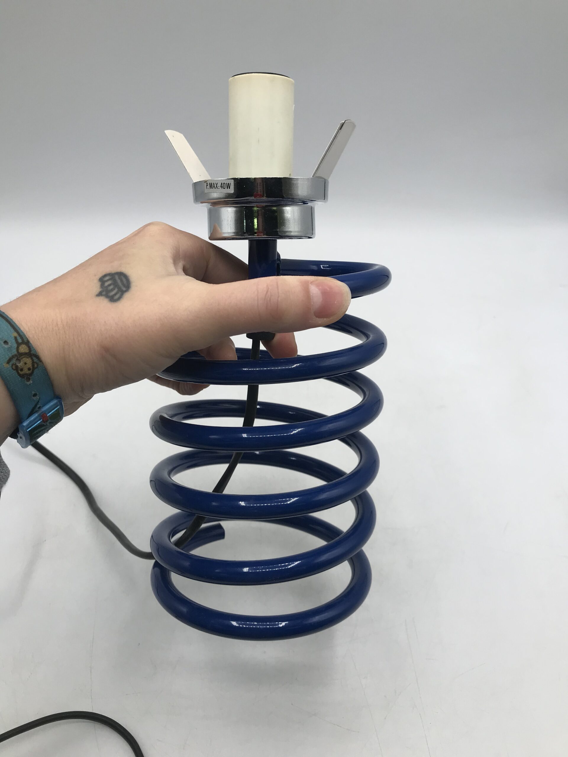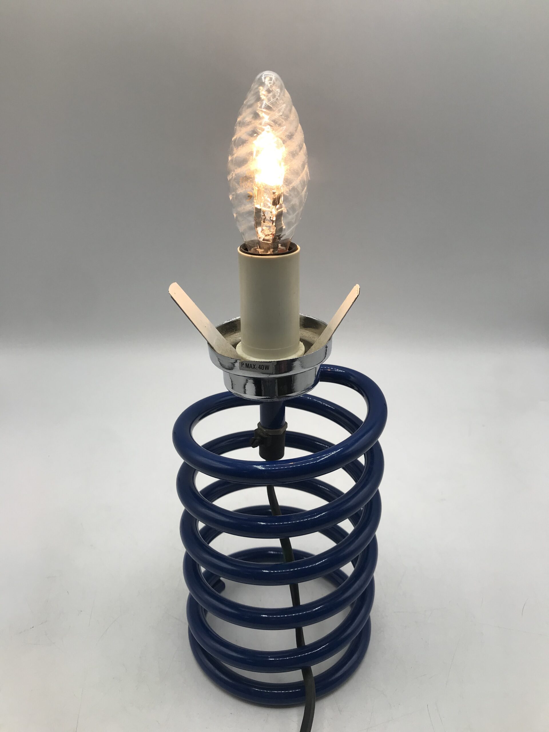 Alerte pépite!!! Pour les amoureux de déco ce pied de lampe est pour vous!!! Il est des années 1970 le pied est un gros ressort en métal chromé de couleur bleu électrique !!!! Une superbe pièce de déco, elle pourra trouver sa place aussi bien dans une chambre que dans un bureau ou salon. Avis aux amateurs de pièces originales celle-ci détonnera. Elle a été testée est fonctionne parfaitement. Elle a une hauteur de 20 cm pour un diamètre de 11 cm. Laissez vous séduire.