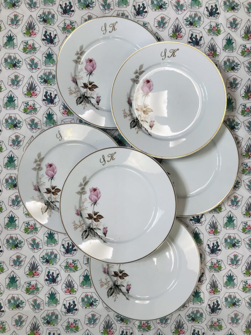 Lot 10 assiettes monogrammes SK. Amoureux de la vaisselle en porcelaine de Limoges. Voici un ensemble de 10 assiettes signées porcelaine de Limoges, elles sont en bon état général pas de casse. De petites marques d’usure sont à prévoir mais rien de bien voyant (cf photos). Une vaisselle au charme fou, les assiettes ont un diamètre de 25 cm pour une hauteur de 3 cm. De couleur blanches avec une jolie illustration de boutons de roses. Un joli liseré doré vient rehausser le tout. Ces assiettes portent les monogrammes « SK ». Une belle manière de composer une table raffinée et délicate. Avis aux chineurs et amateurs de vaisselle ancienne.
