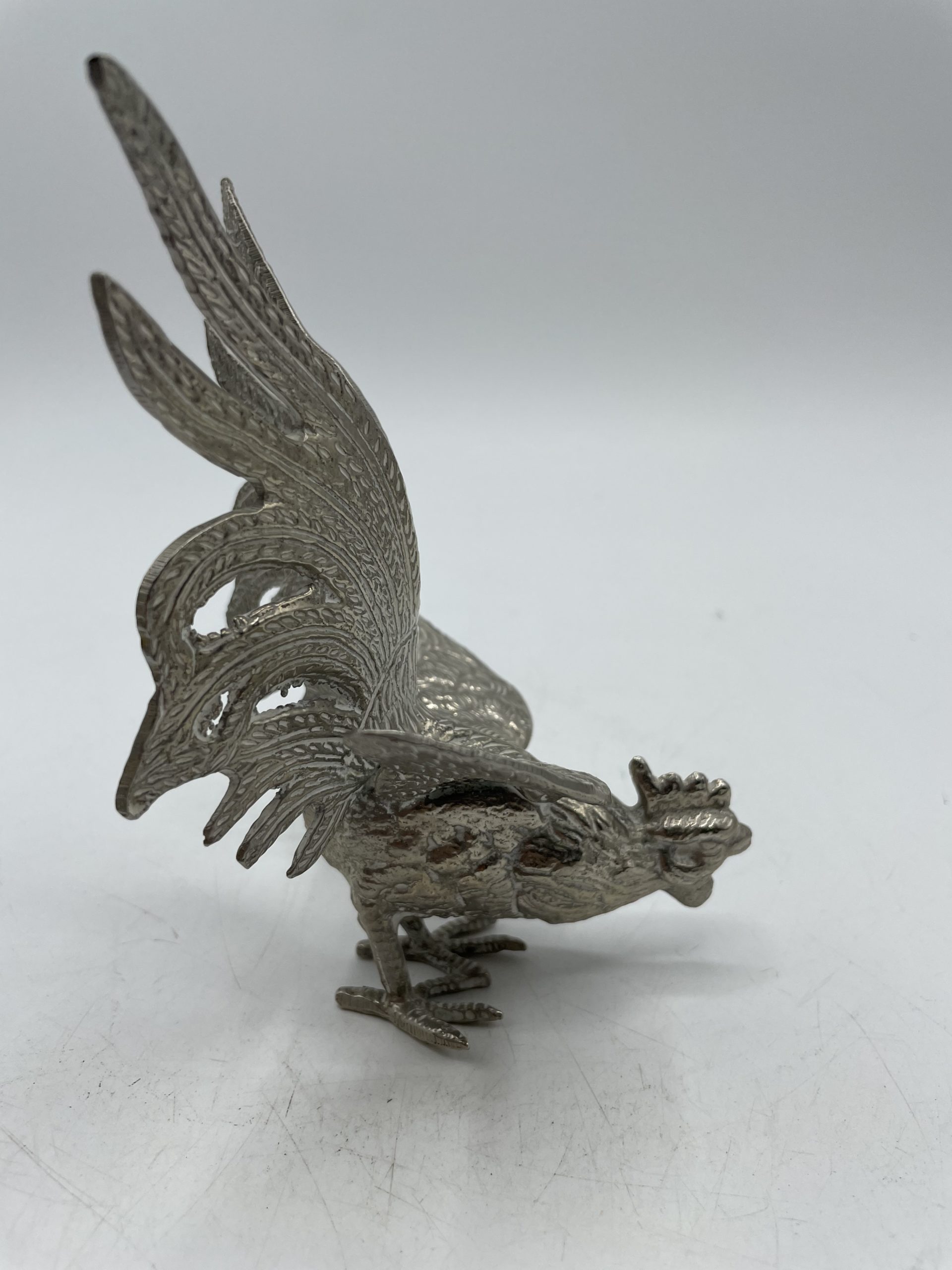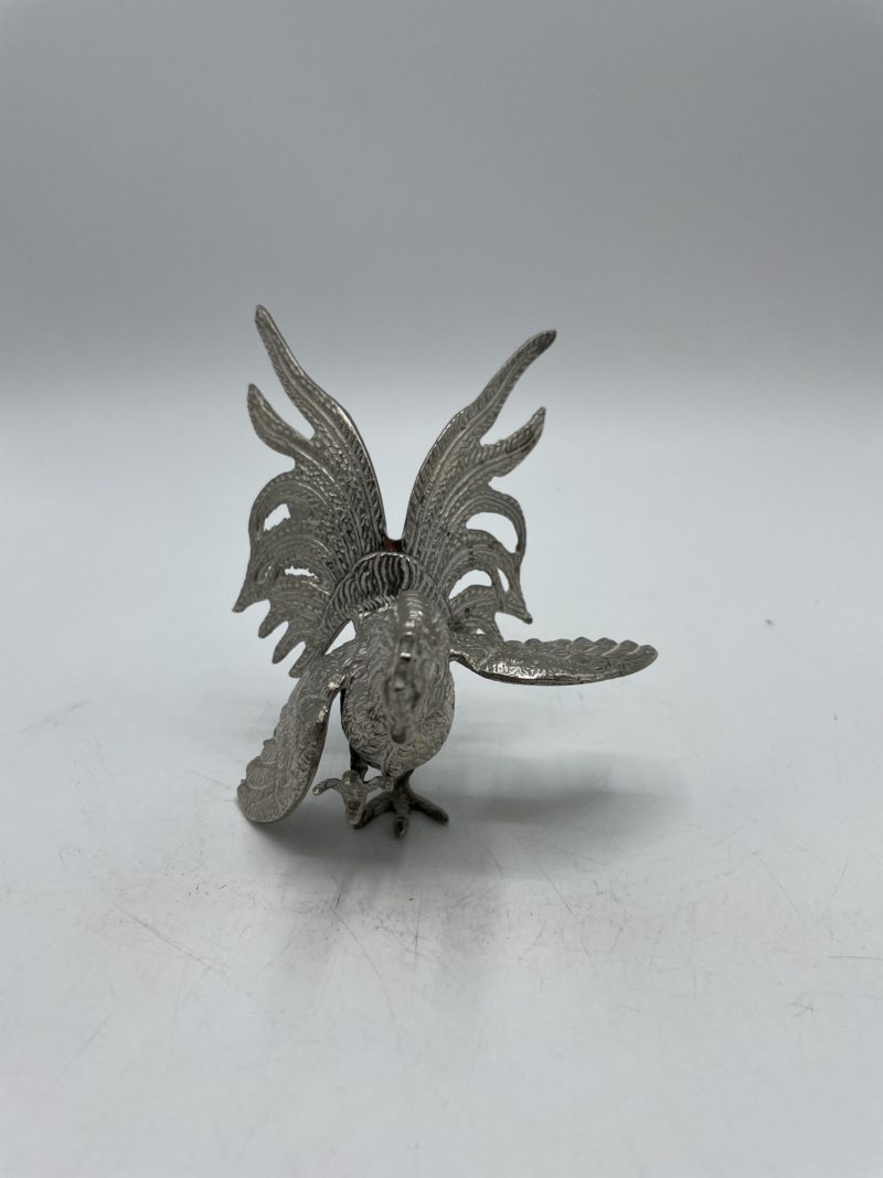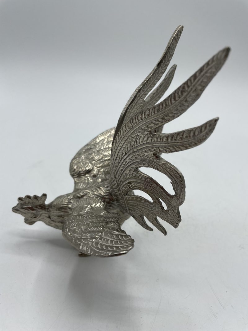 Joli paire de 2 coqs de combat en métal argenté. Les détails des coqs sont saisissants et très détaillés. Des années 70/80, ces deux petites statuettes vintage sont en bon état mais elles auront besoin d’un léger nettoyage. Les 2 tiennent debout sans avoir besoin de support. Une jolie petite déco à retrouver sur votre bureau ou sur un joli meuble !