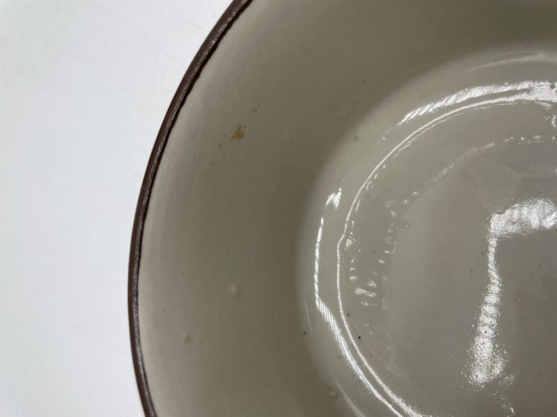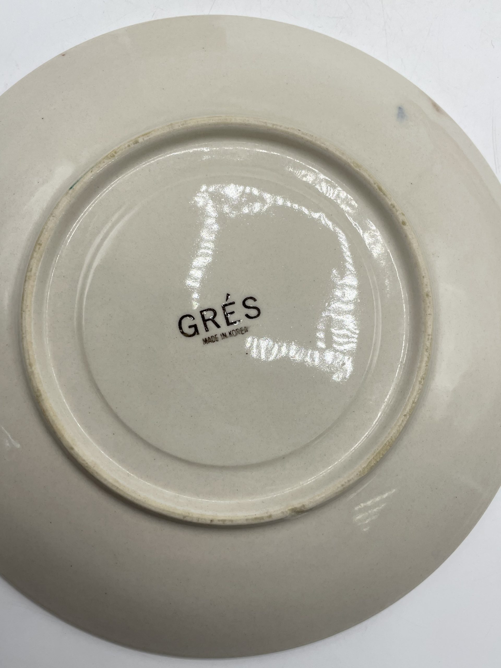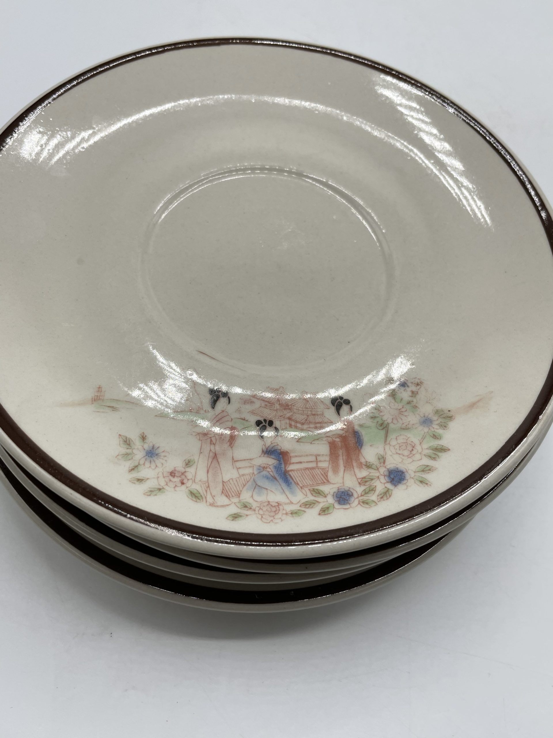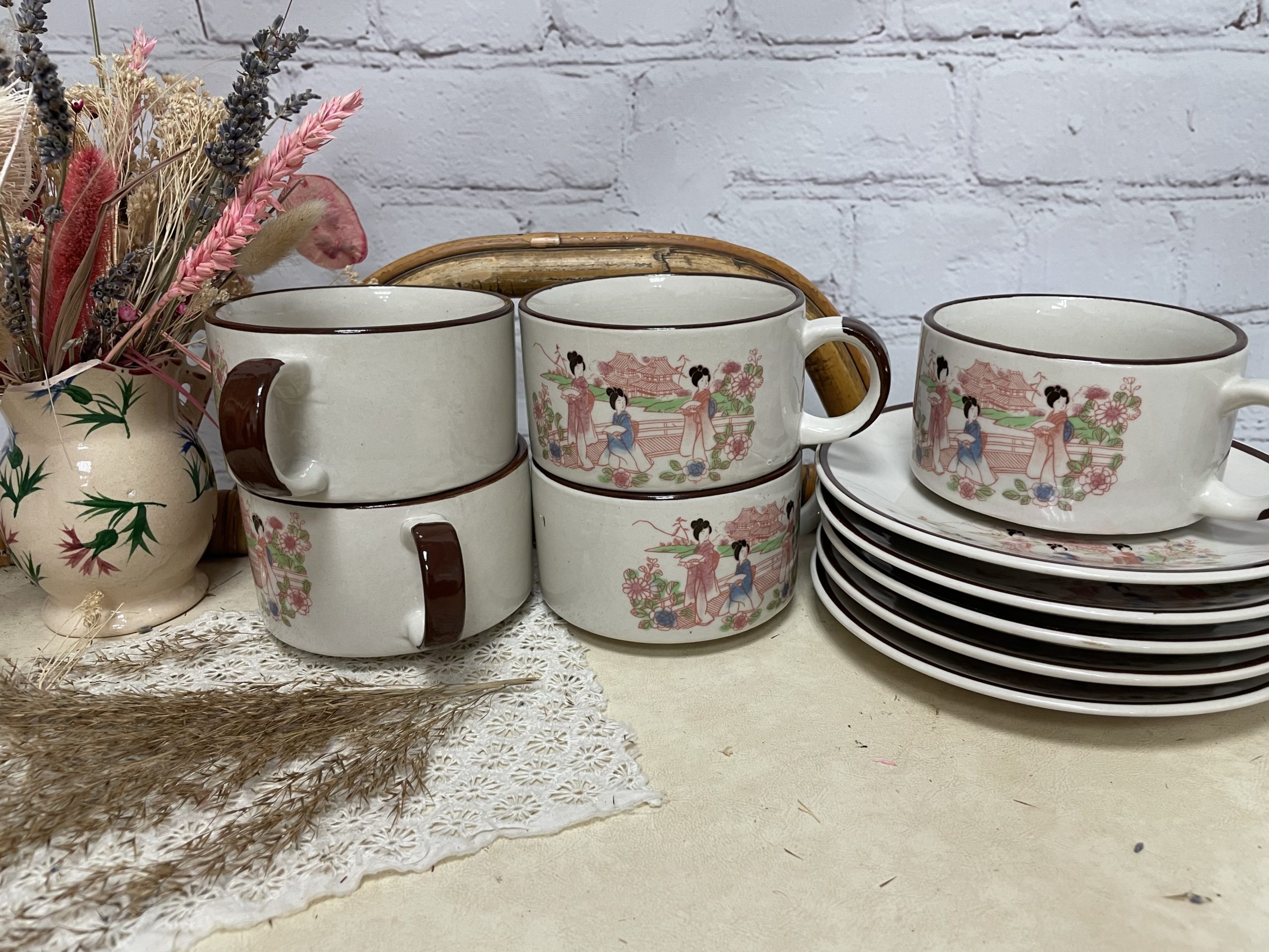 On craque d’amour pour ce joli service qui se compose de 5 grandes tasses et de 5 soucoupes assorties. En grès, le service a été fabriqué en Corée et il est estampillé GRES. D’une jolie couleur beige naturelle, les tasses et les soucoupes sont décorées d’un motif d’une scène de3 femmes en habits traditionnels de kimonos qui se baladent dans un jardin éventails à la main et de liserés bruns. De légères traces d’usure sont à prévoir (cf photos) jolies marques du temps passé. Un beau service à l’esprit asiatique et minéral, parfait pour se servir un grand bol de thé !