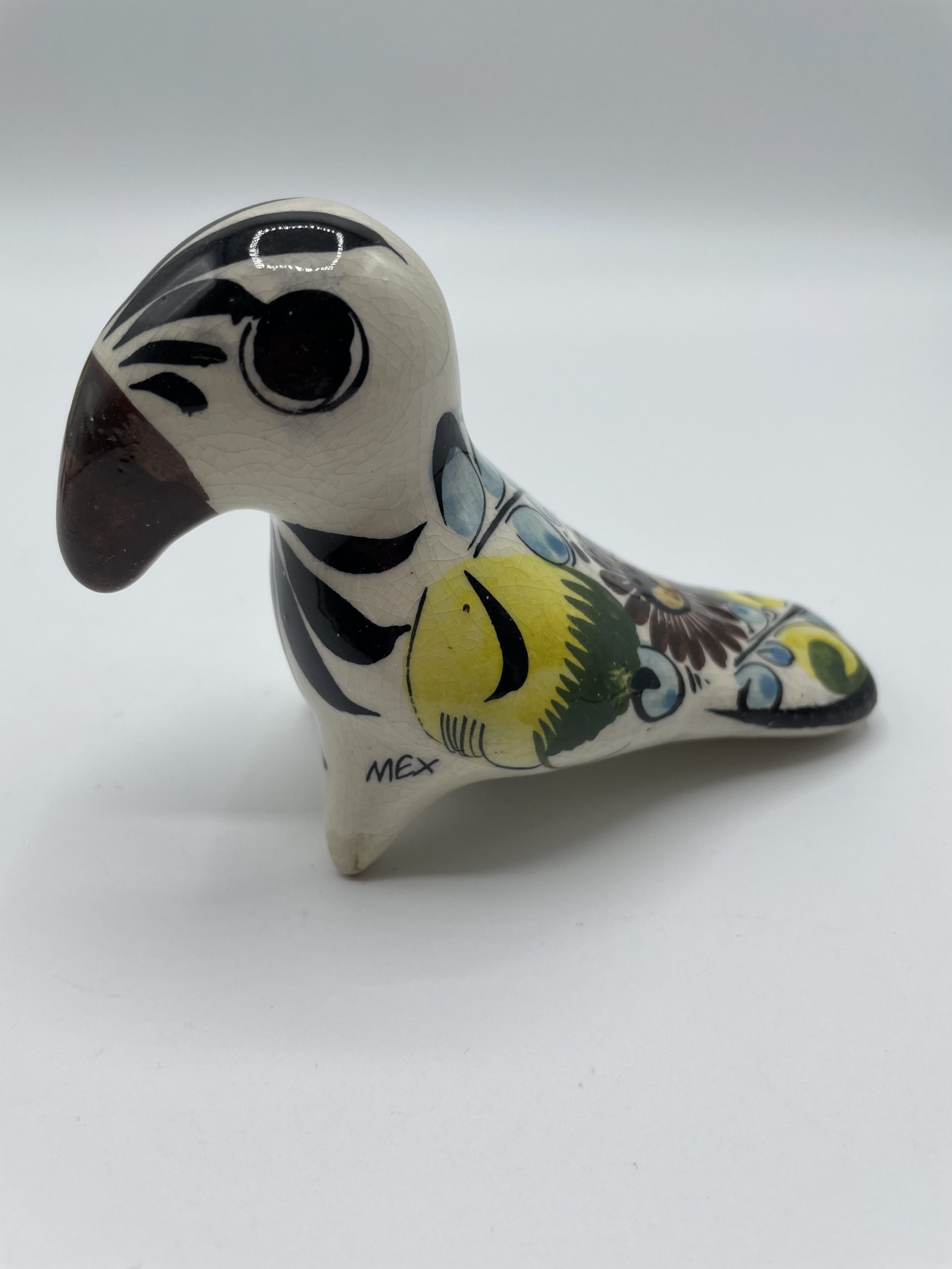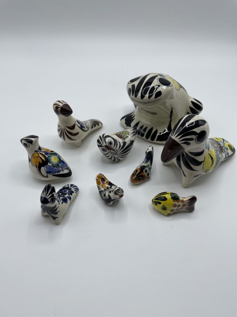 Joli lot de 9 céramiques vintage du Mexique en forme d’animaux. Art populaire des années 70, les céramiques sont en excellent état général, seul un petit accroc sur le bec du hibou est à relever (cf photos). Originaires du centre artisanal de Tonala, les motifs sont peints à la main. Chaque objet est donc une pièce unique qui viendra décorer votre intérieur et ajouter une touche d’exotisme pour vous faire voyager depuis votre salon !