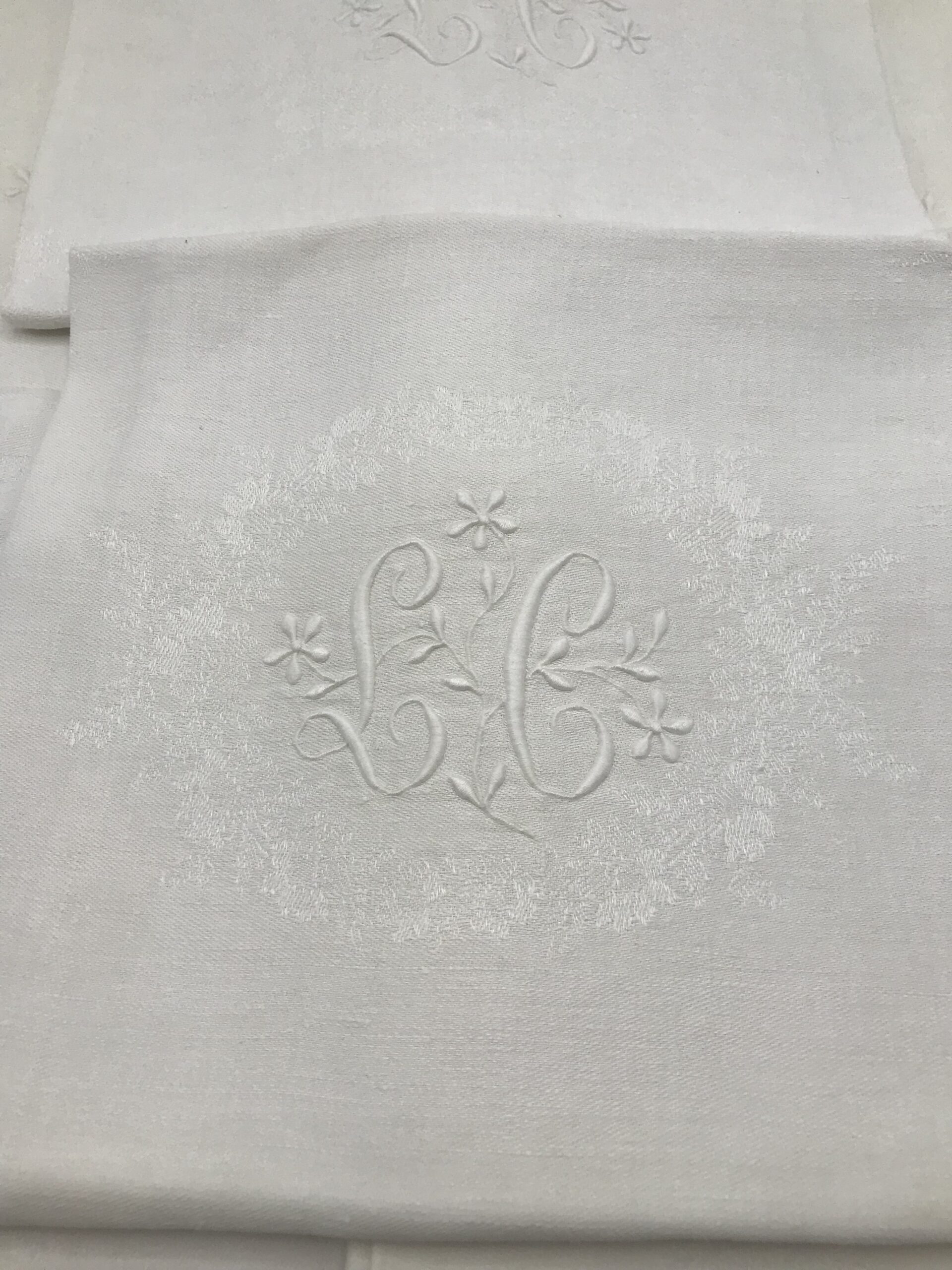 Lot de 10 torchons en coton, monogrammes “LC”. Torchons qui mesurent 68 cm par 78 cm, ce qui laisse le choix de s’en servir soit comme torchon, soit comme grande serviette de table. Ils sont en coton, les initiales “LC” y sont donc brodées en leur centre, entourées d’une couronne de fleurs brodée. le centre est en coton plein et les contours sont en broderie décoratives, des frises de fleurs magnifiques décorent ces torchons. De très bonne manufacture, ils ont su et seront résister au temps. A noter que les bords peuvent être jaunis, et quelques taches présentes. Un nettoyage sera nécessaire pour leur redonner toute leur grâce. Une bonne idée pour donner la note finale à vos tablées.