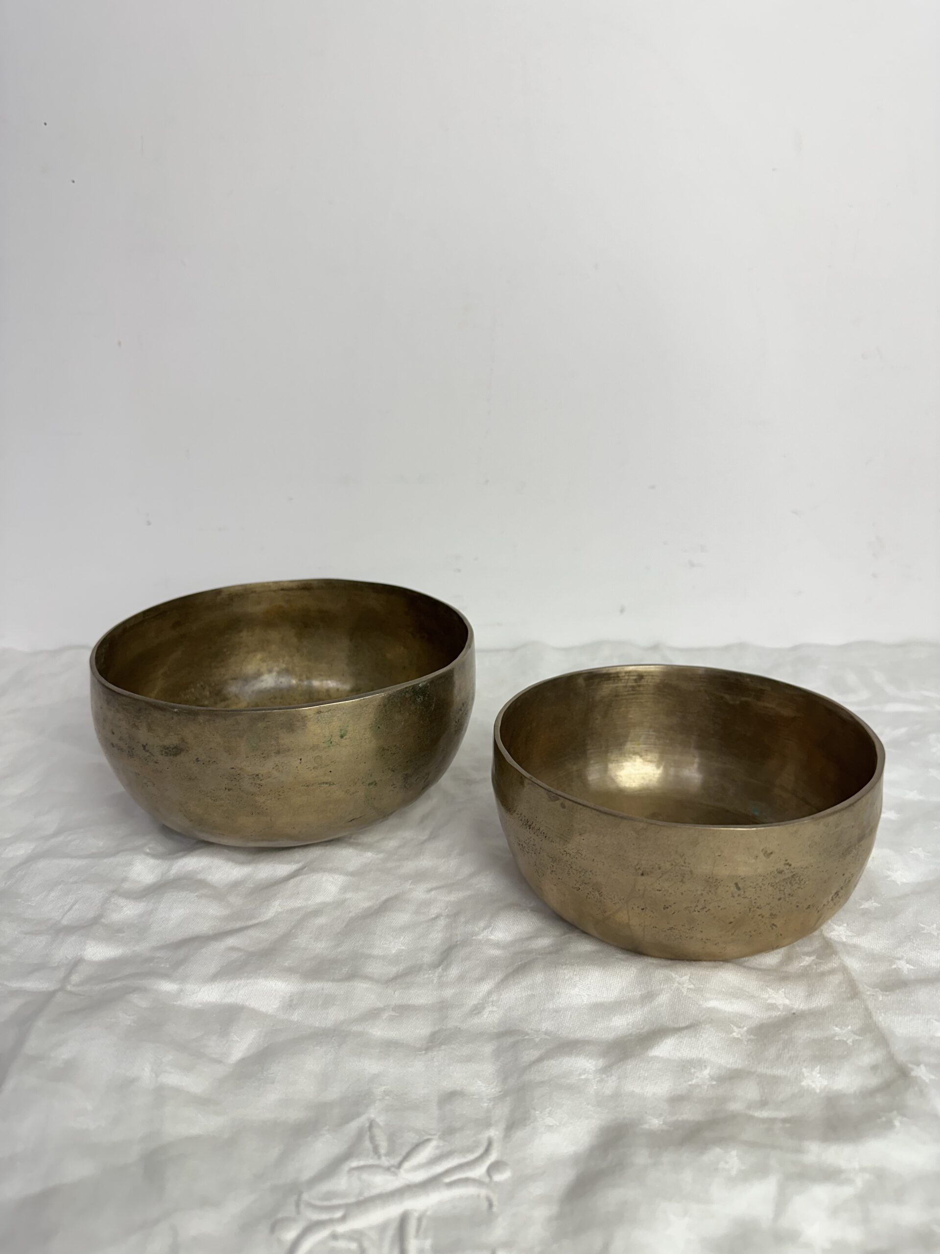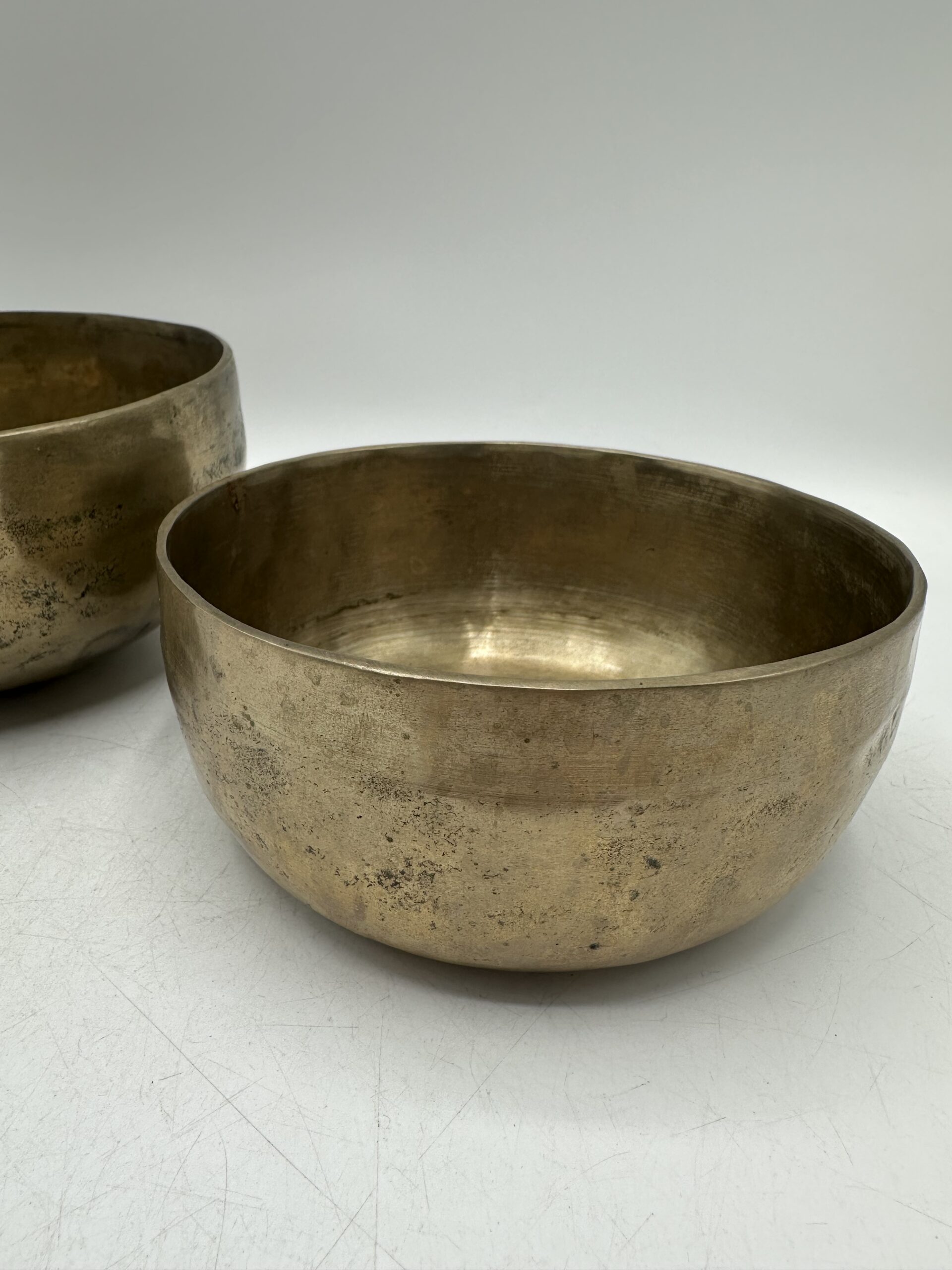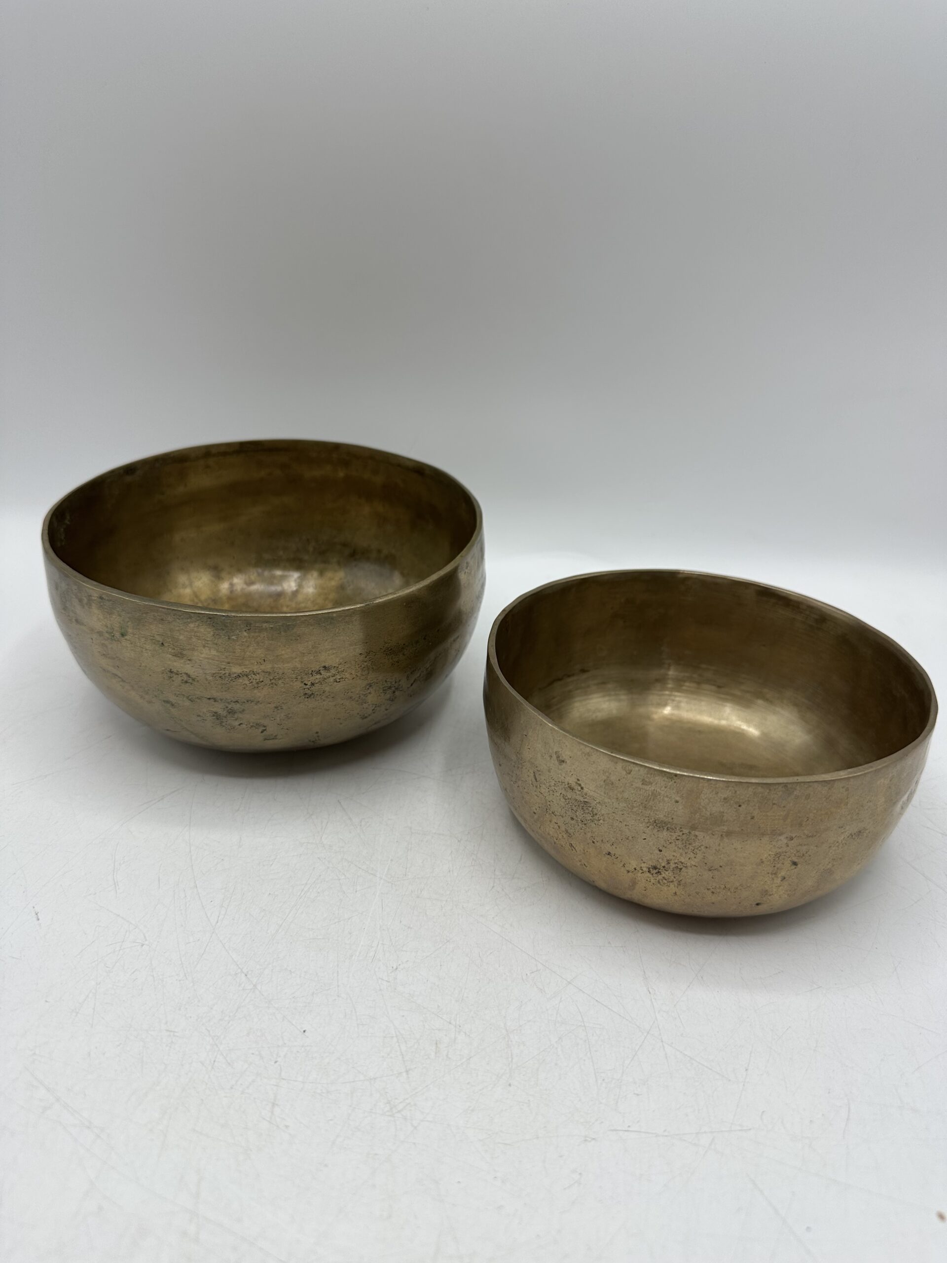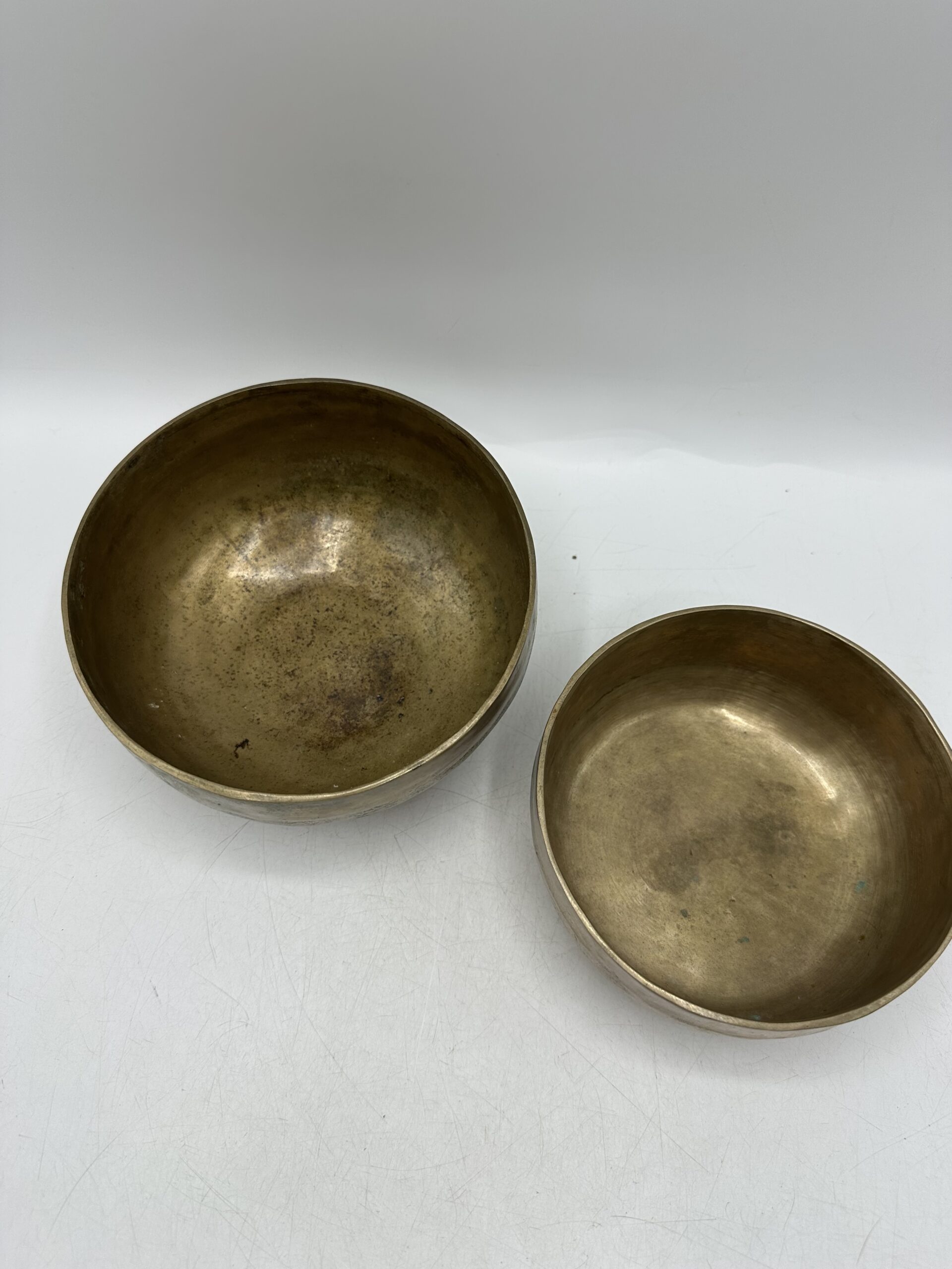 Les bols présentent une jolie patine qui témoigne de leur âge et de leur usage. Mais ils sont en bon état général malgré leurs petites imperfections. Ils semblent réalisés dans un alliage métallique traditionnel. Mais nous ne pouvons pas affirmer avec certitude la composition exacte.