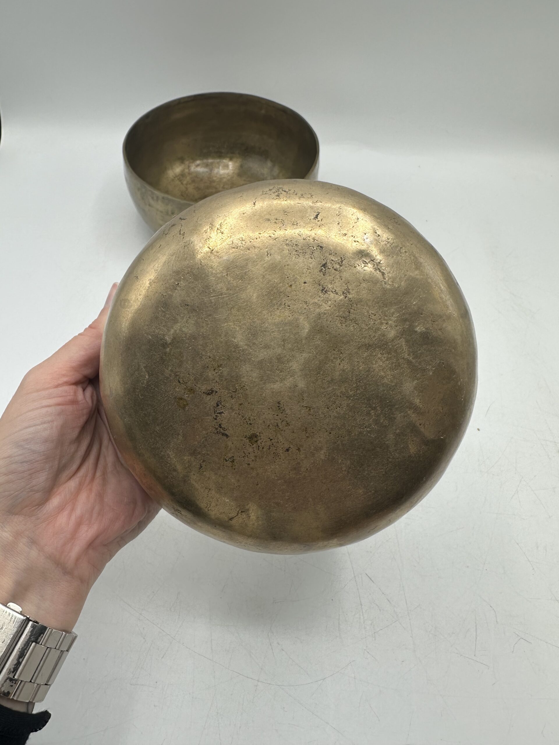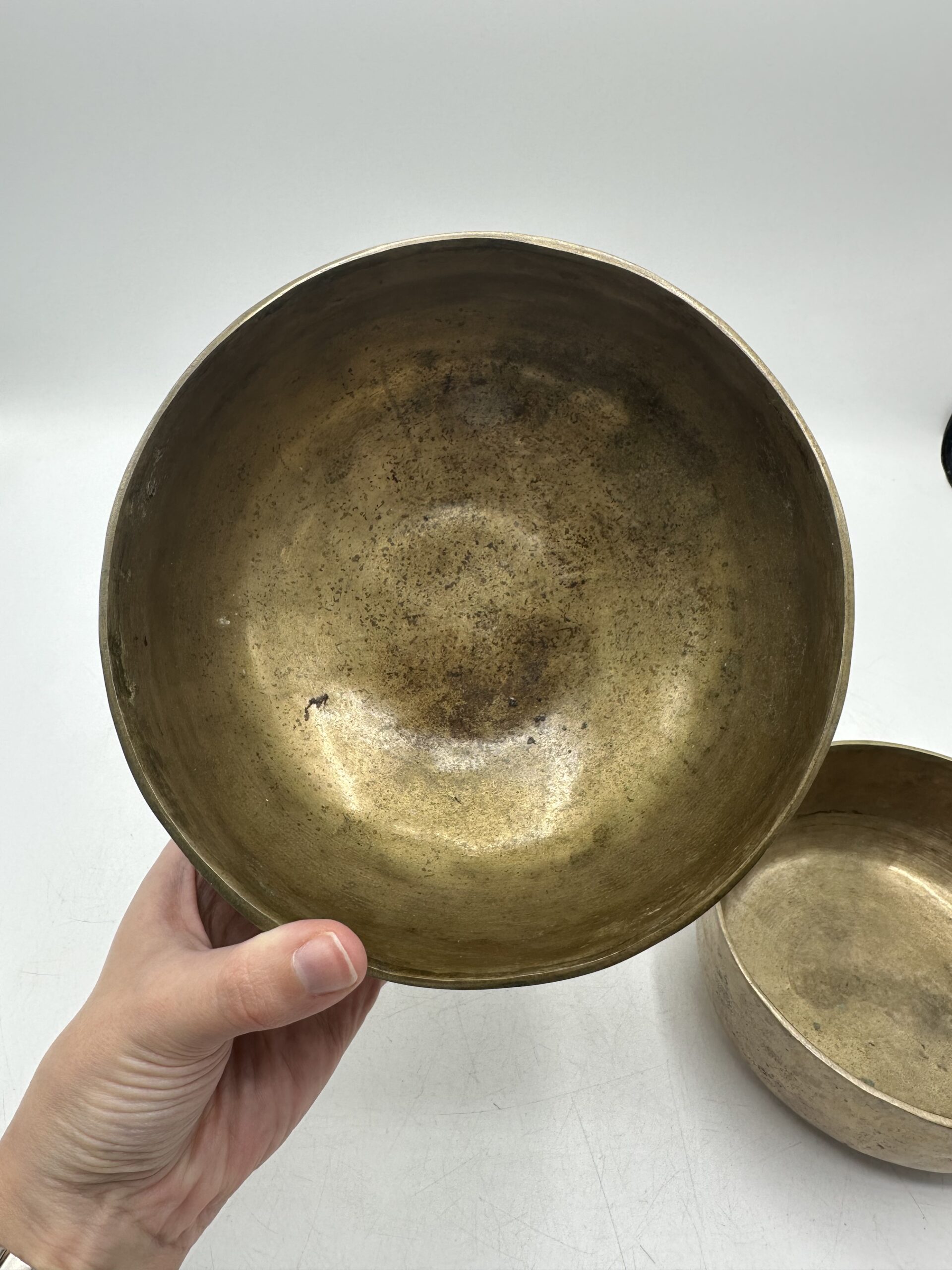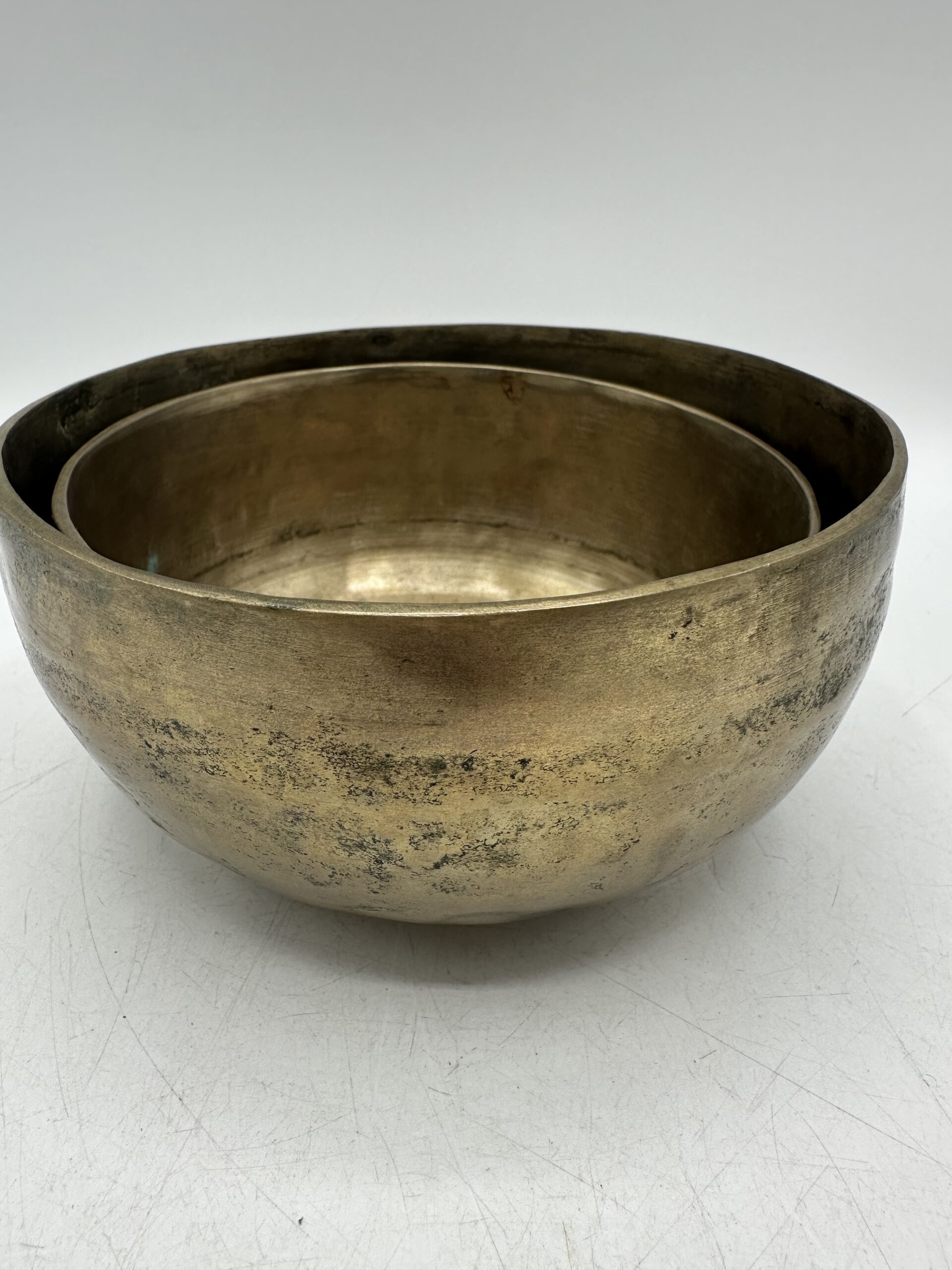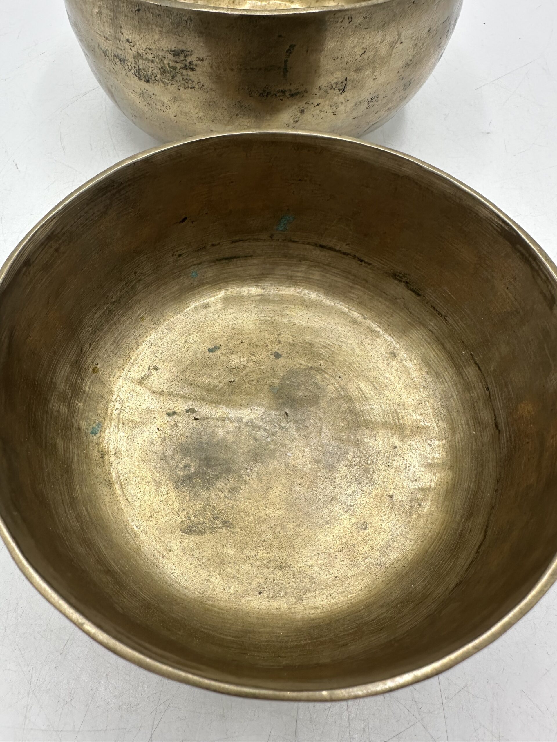 Les bols présentent une jolie patine qui témoigne de leur âge et de leur usage. Mais ils sont en bon état général malgré leurs petites imperfections. Ils semblent réalisés dans un alliage métallique traditionnel. Mais nous ne pouvons pas affirmer avec certitude la composition exacte.