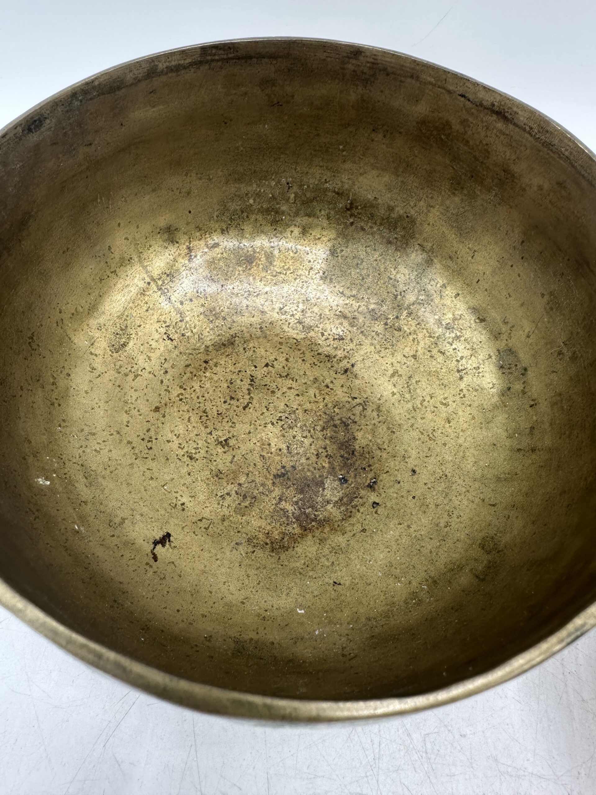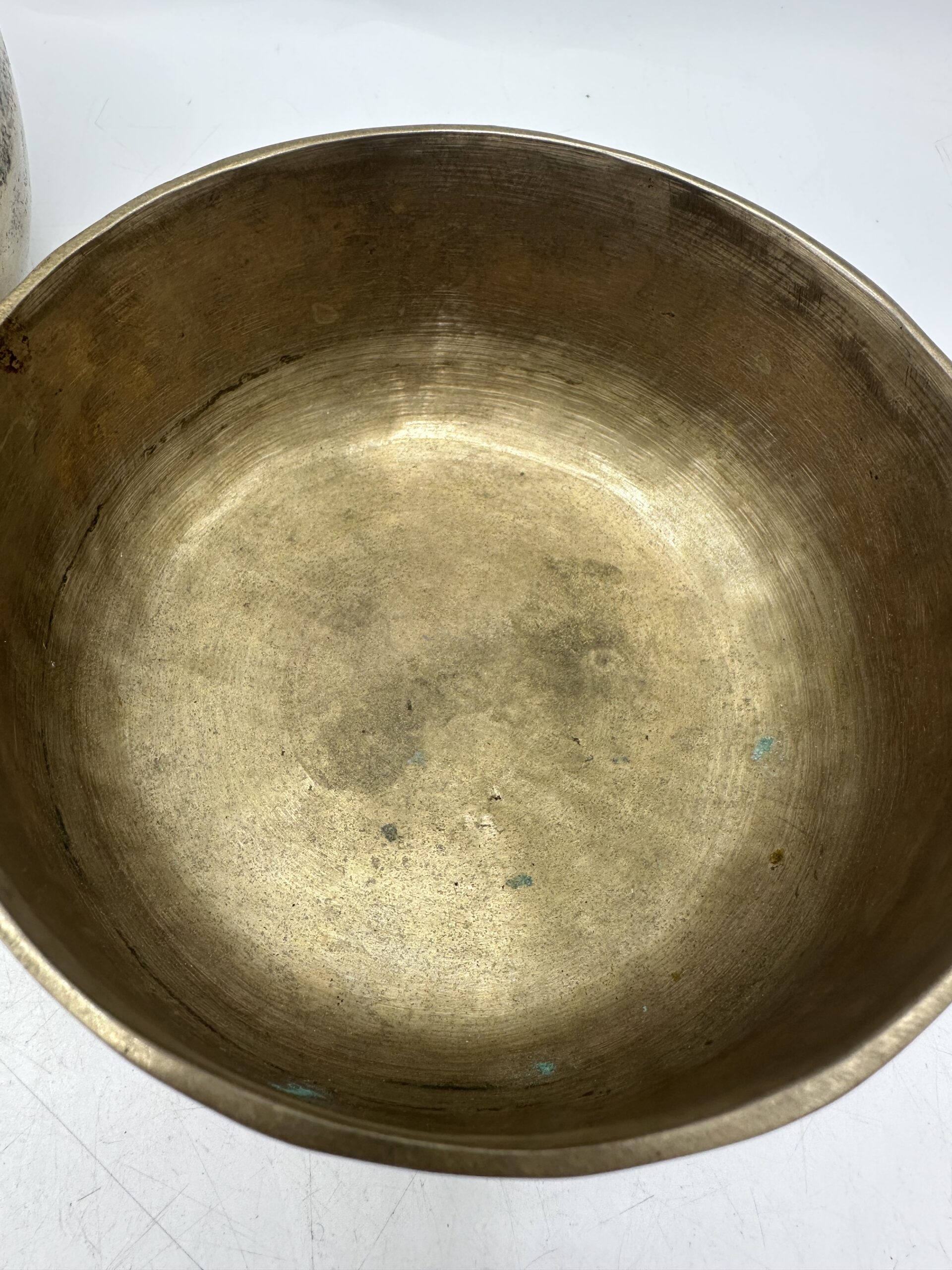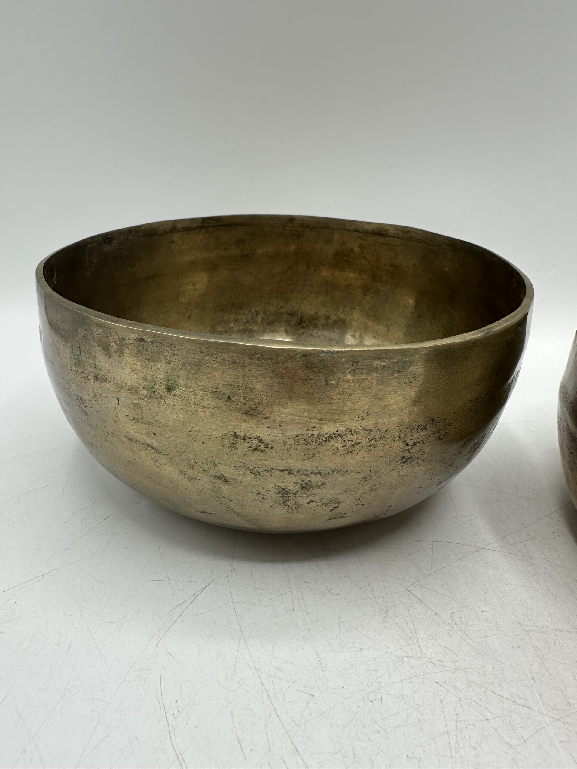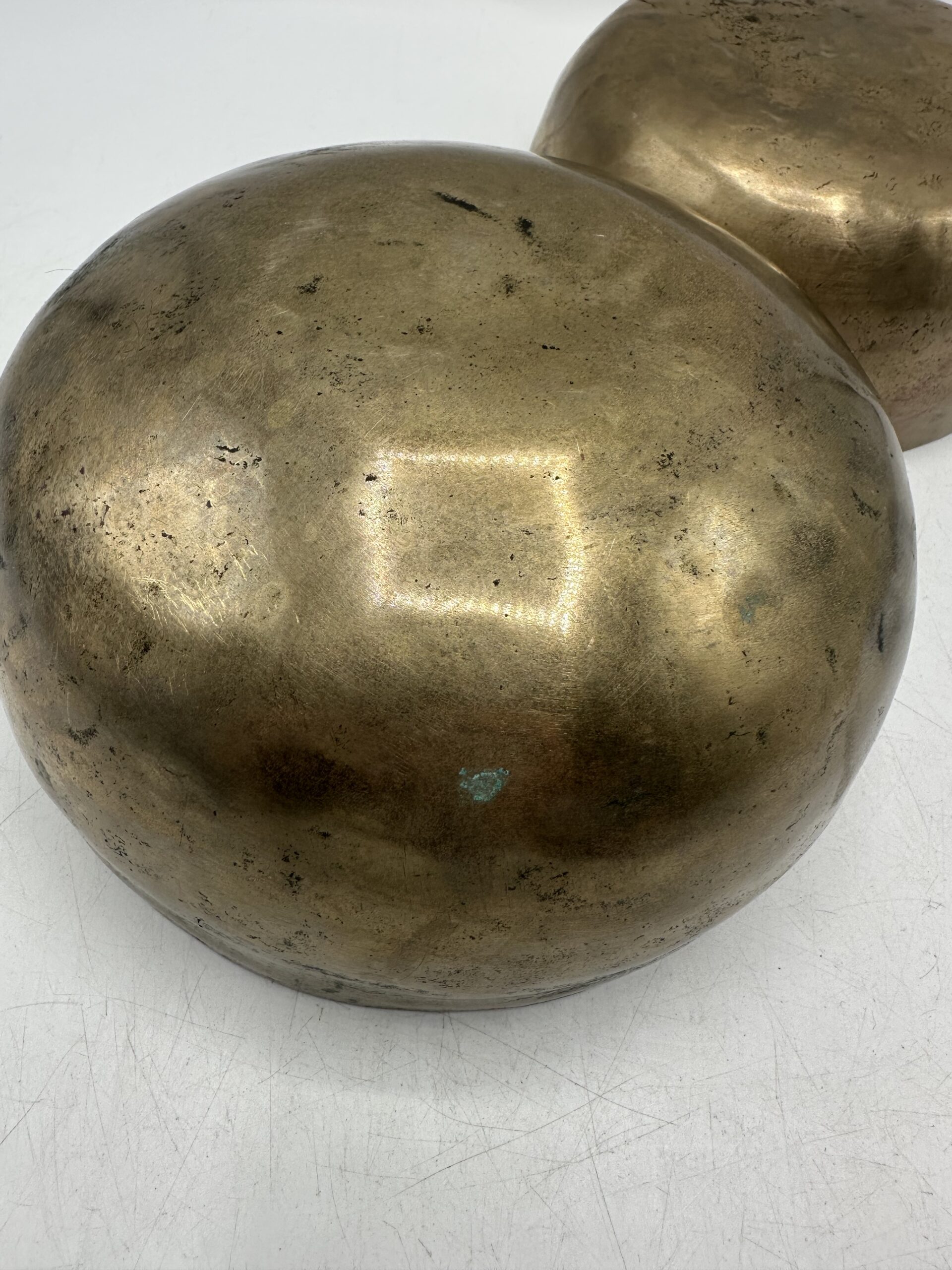 Les bols présentent une jolie patine qui témoigne de leur âge et de leur usage. Mais ils sont en bon état général malgré leurs petites imperfections. Ils semblent réalisés dans un alliage métallique traditionnel. Mais nous ne pouvons pas affirmer avec certitude la composition exacte.