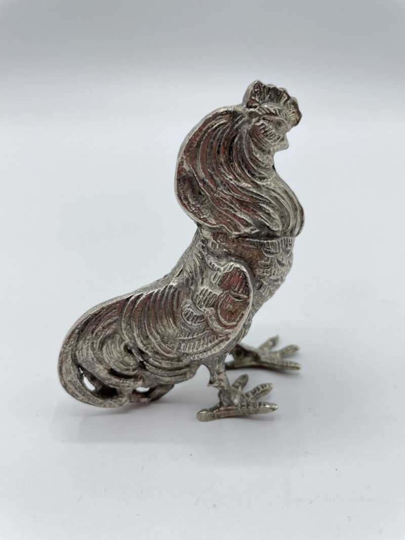 Joli paire de 2 coqs de combat en métal argenté. Les détails des coqs sont saisissants et très détaillés. Des années 70/80, ces deux petites statuettes vintage sont en bon état. Les 2 tiennent debout sans avoir besoin de support. Une jolie petite déco à retrouver sur votre bureau ou sur un joli meuble !